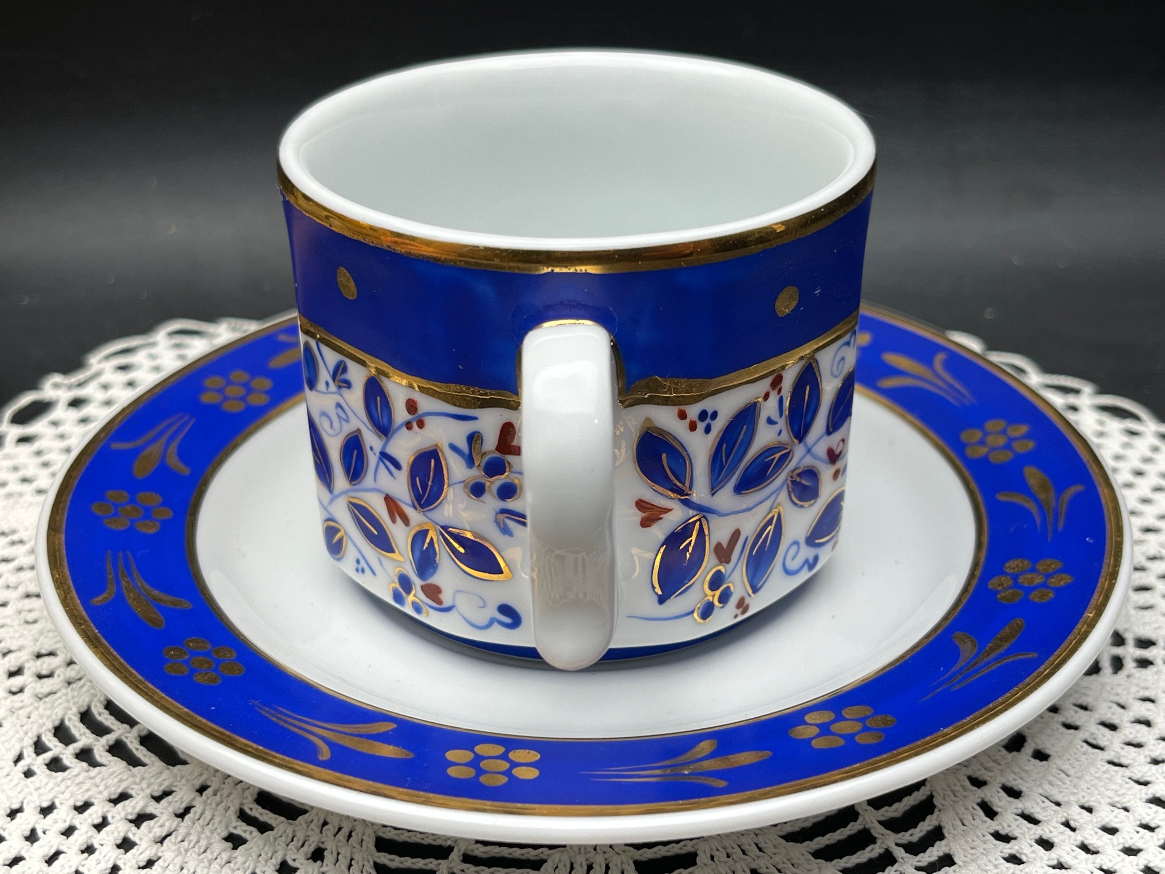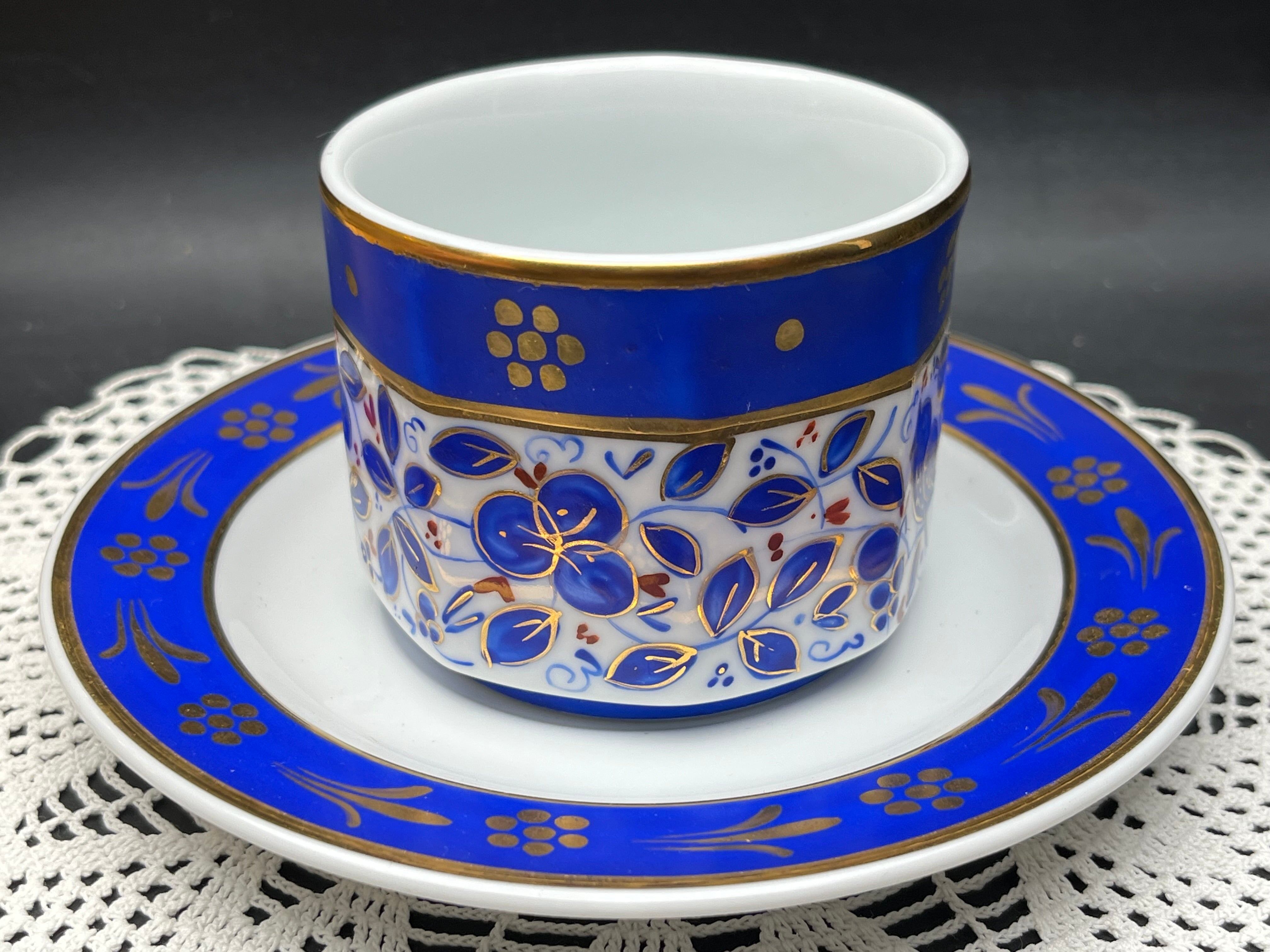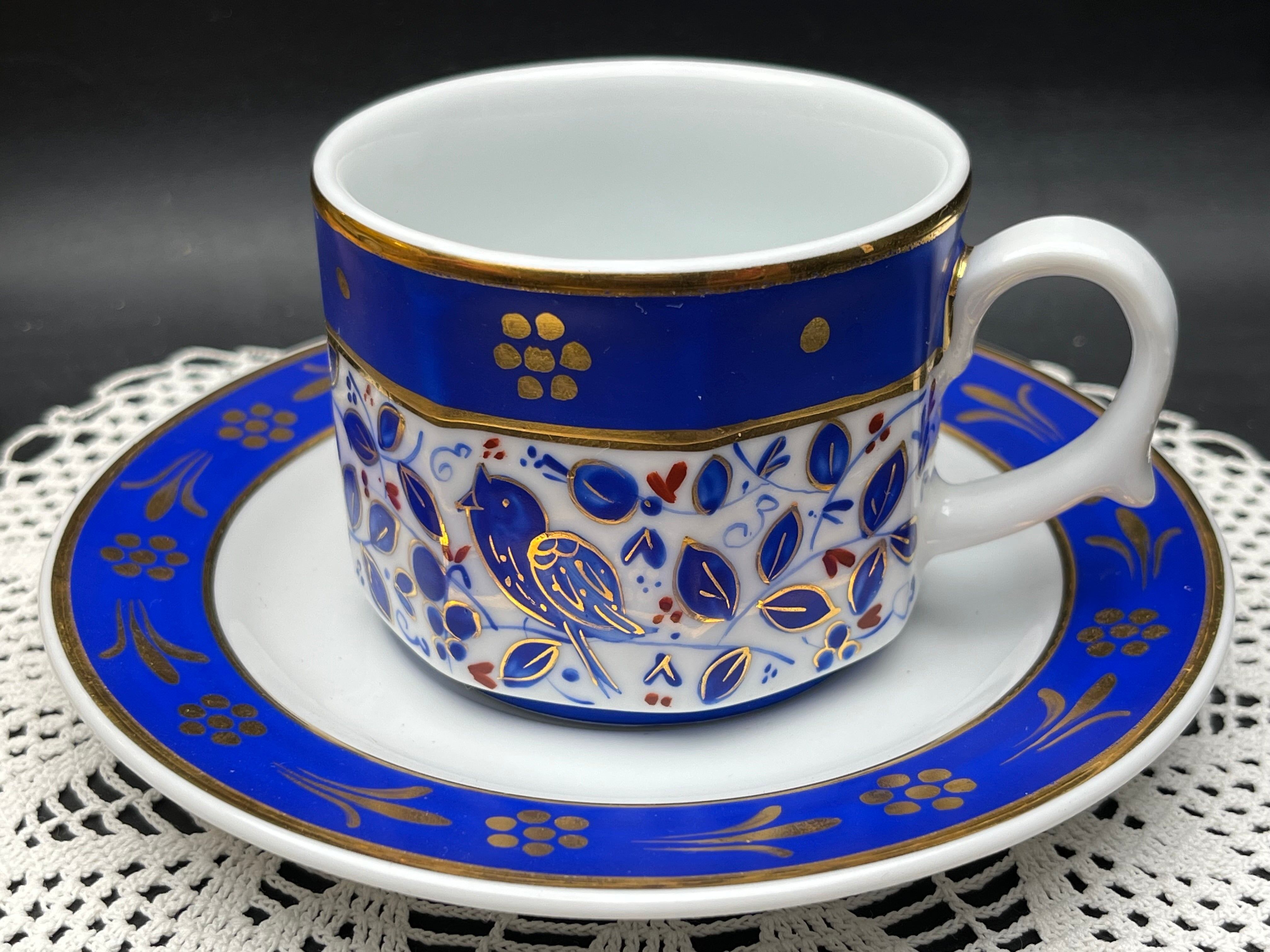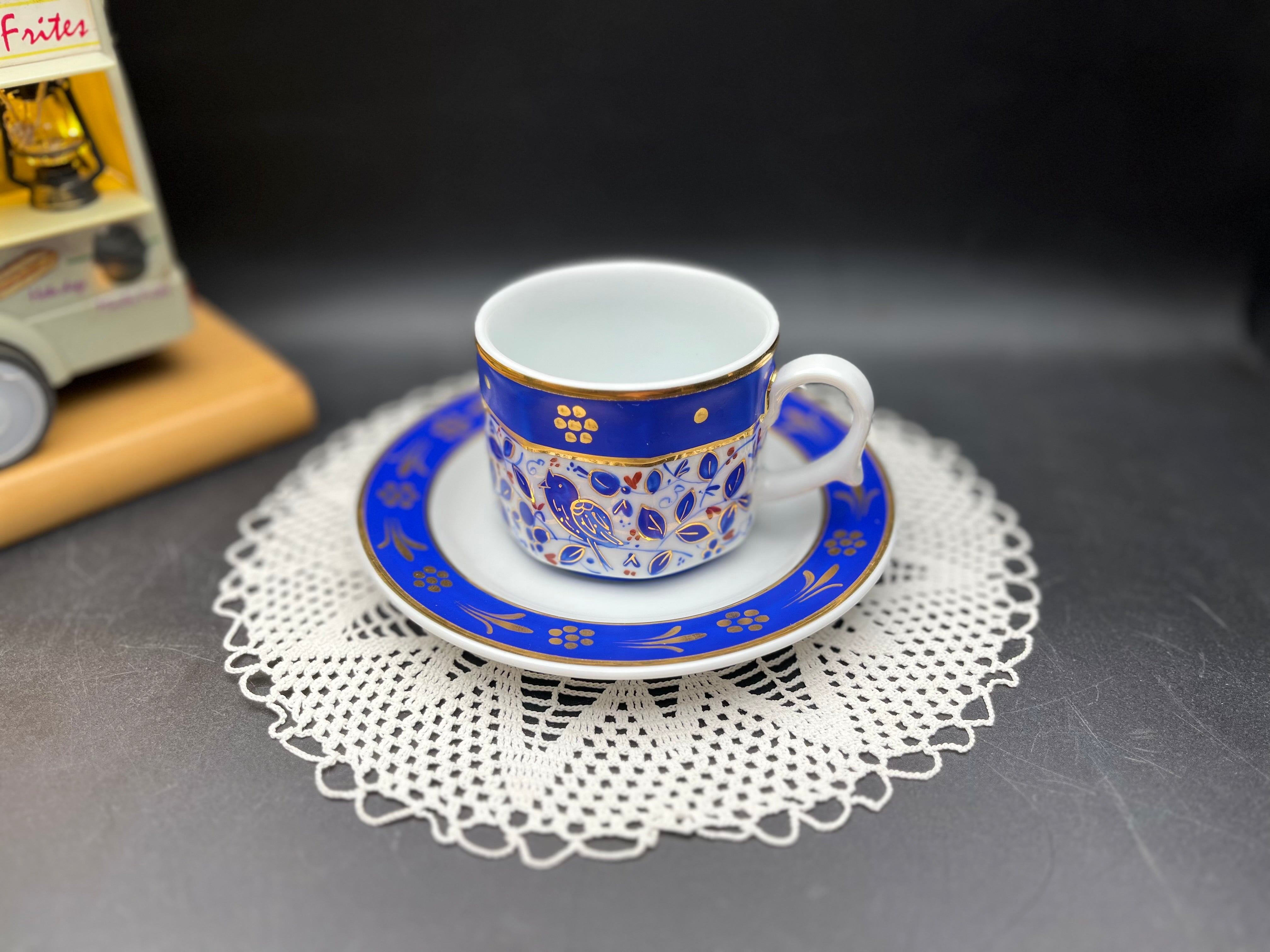 深みのあるコバルトブルーの帯と繊細な金彩装飾、カップ側面には鳥と植物をモチーフにしたオリエンタルな絵付けが施されており、オスマン様式の流れを感じさせる華やかで品のあるデザインです。白磁の艶感とのコントラストも美しく、飾るだけでも存在感があります。