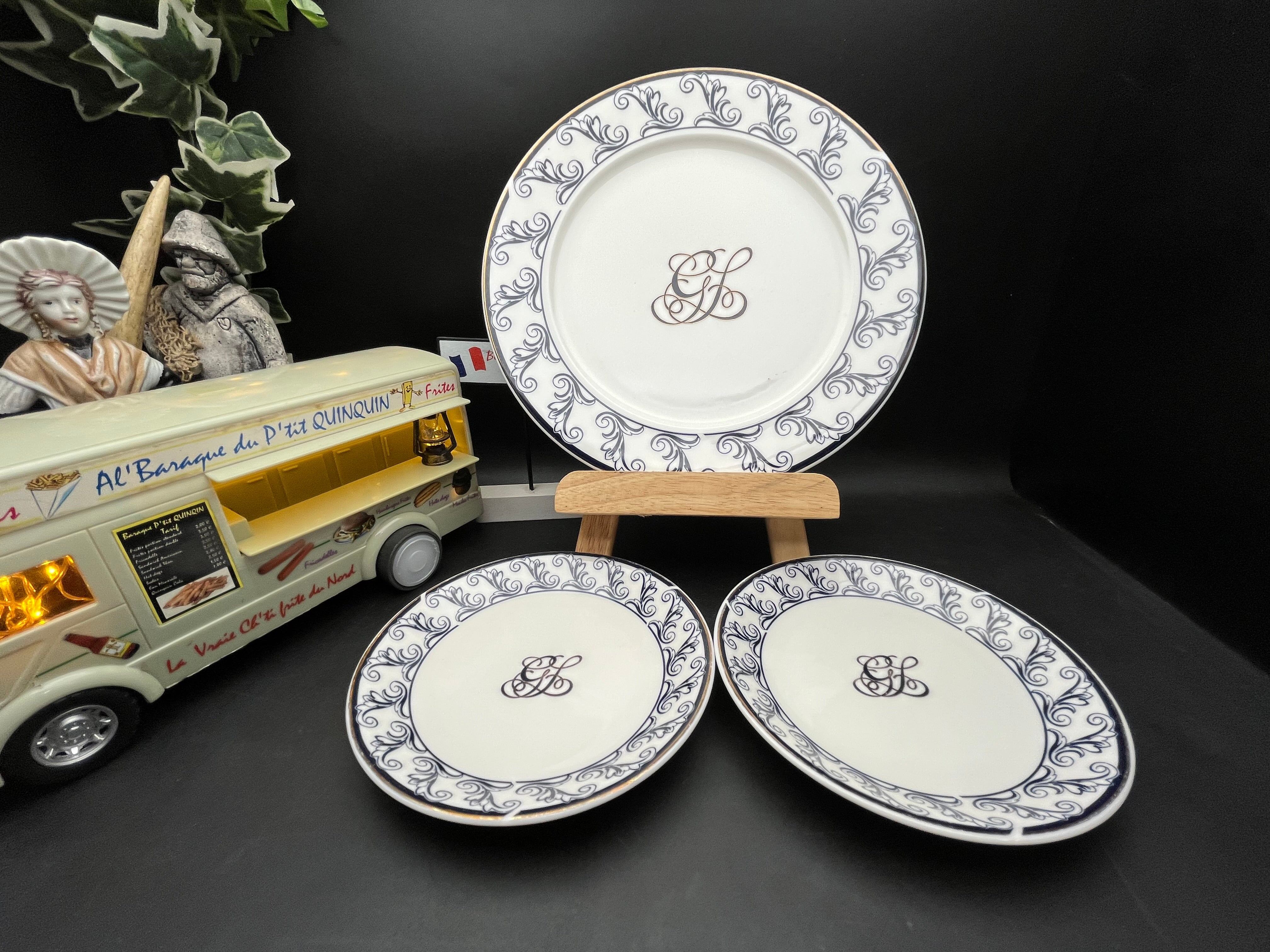 フランスのラグジュアリーブランド「Guy Laroche Paris(ギ・ラロッシュ)」の、モノグラム装飾が美しいヴィンテージプレート3枚セットです。