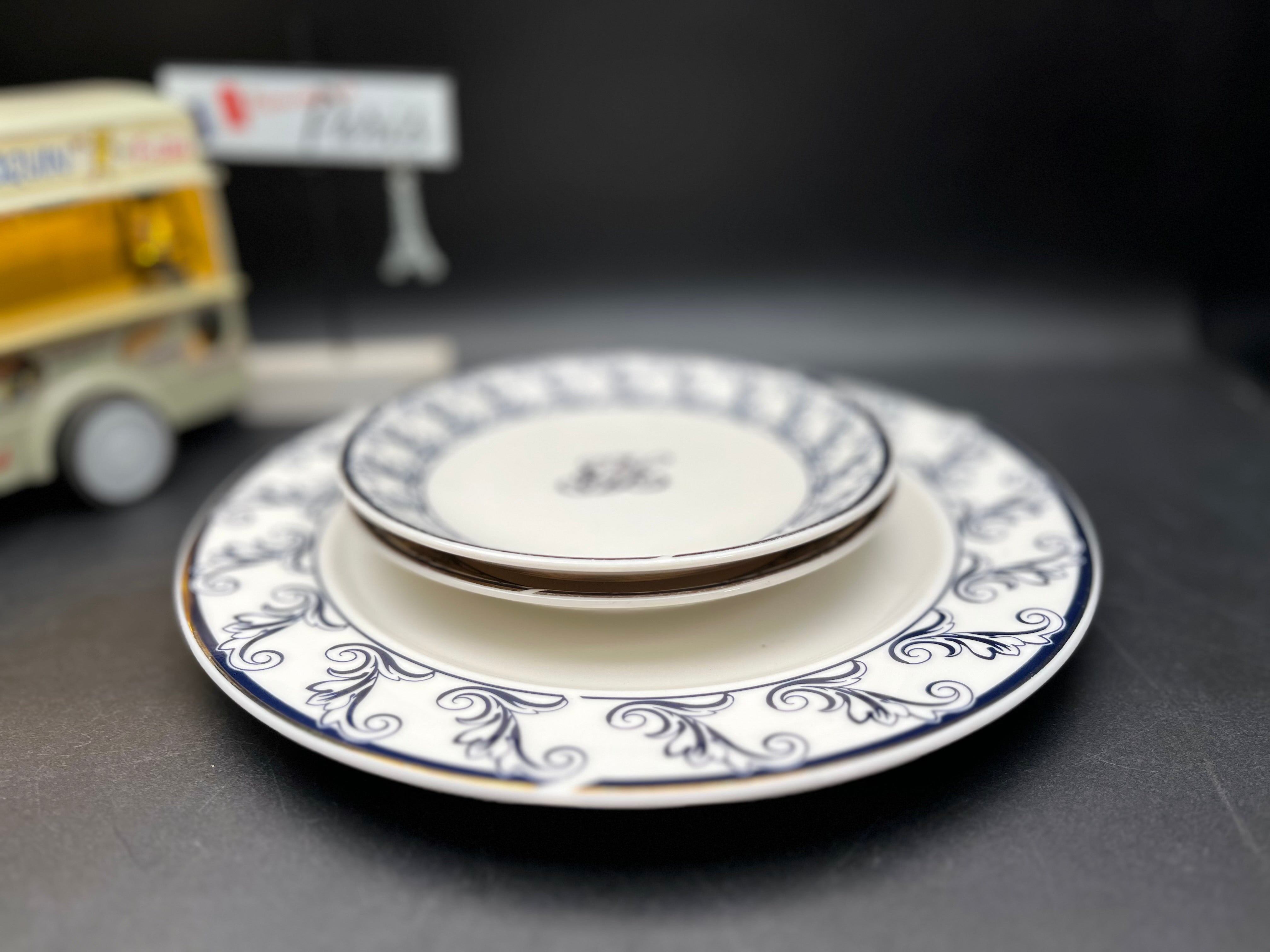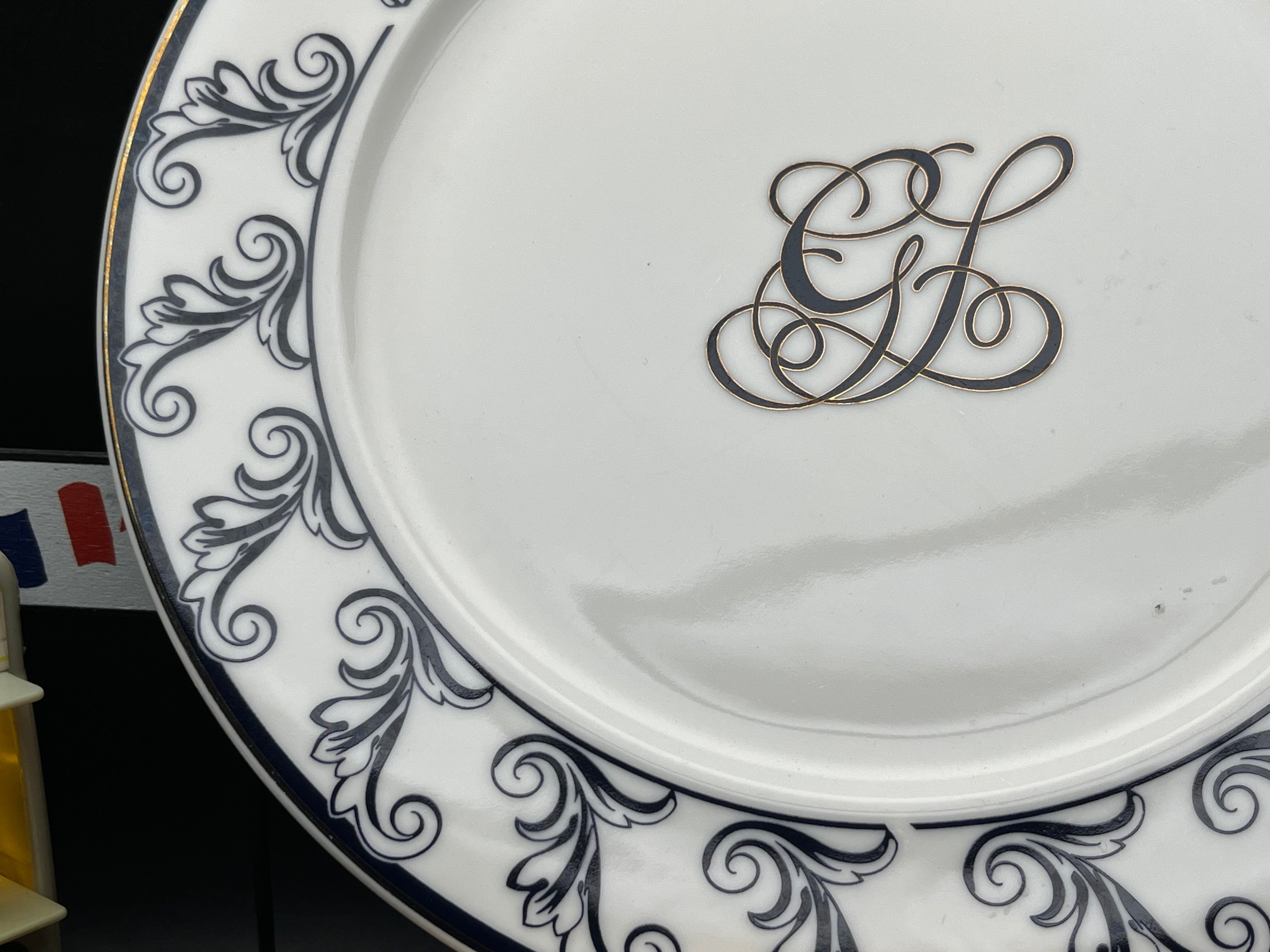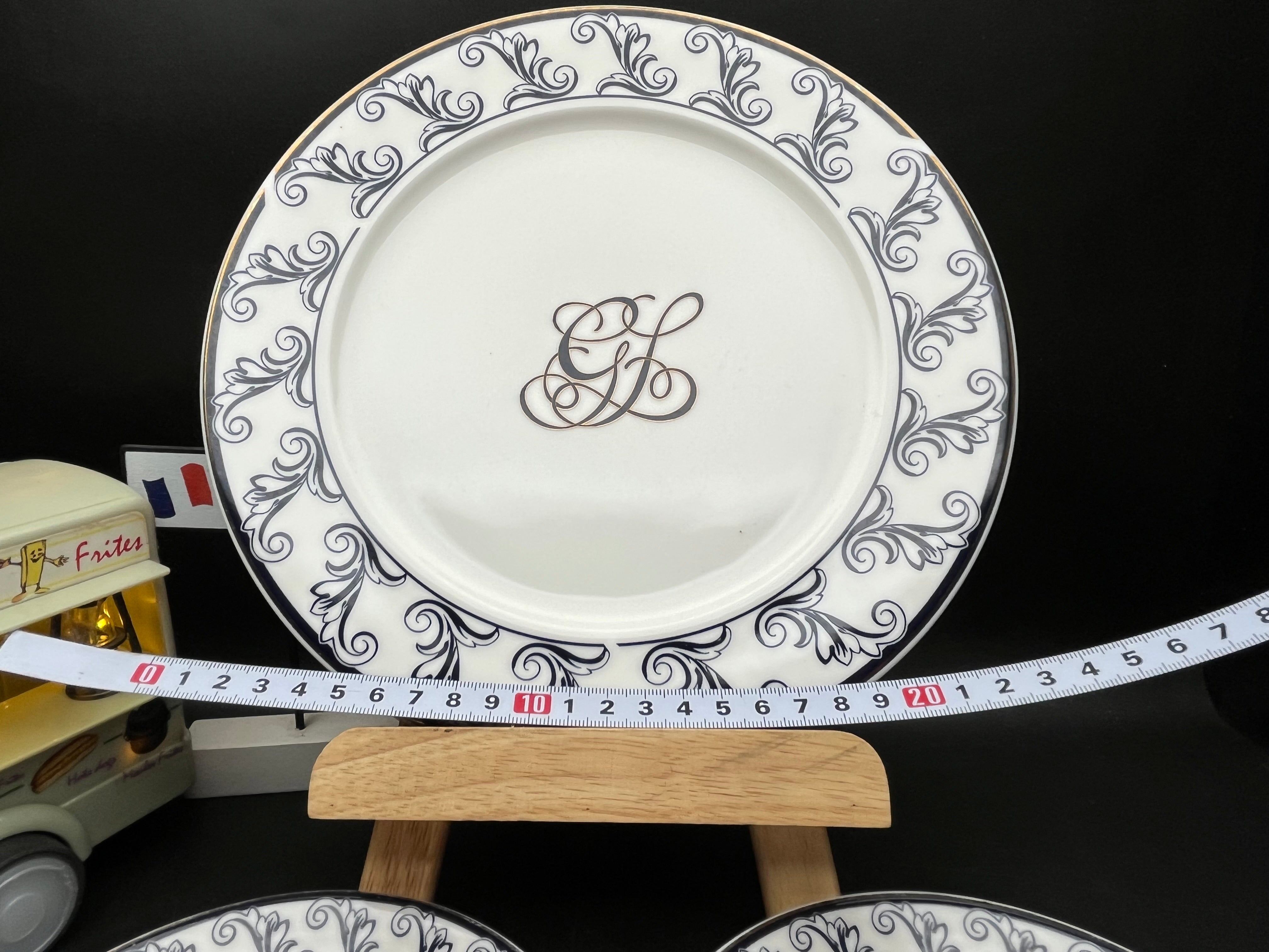 中央にはクラシカルな筆記体イニシャルが配され、リム部分には繊細な唐草模様とゴールドラインが施された、エレガントで高級感のあるデザイン。シンプルながら存在感があり、テーブルコーディネートを上品に引き締めてくれます。