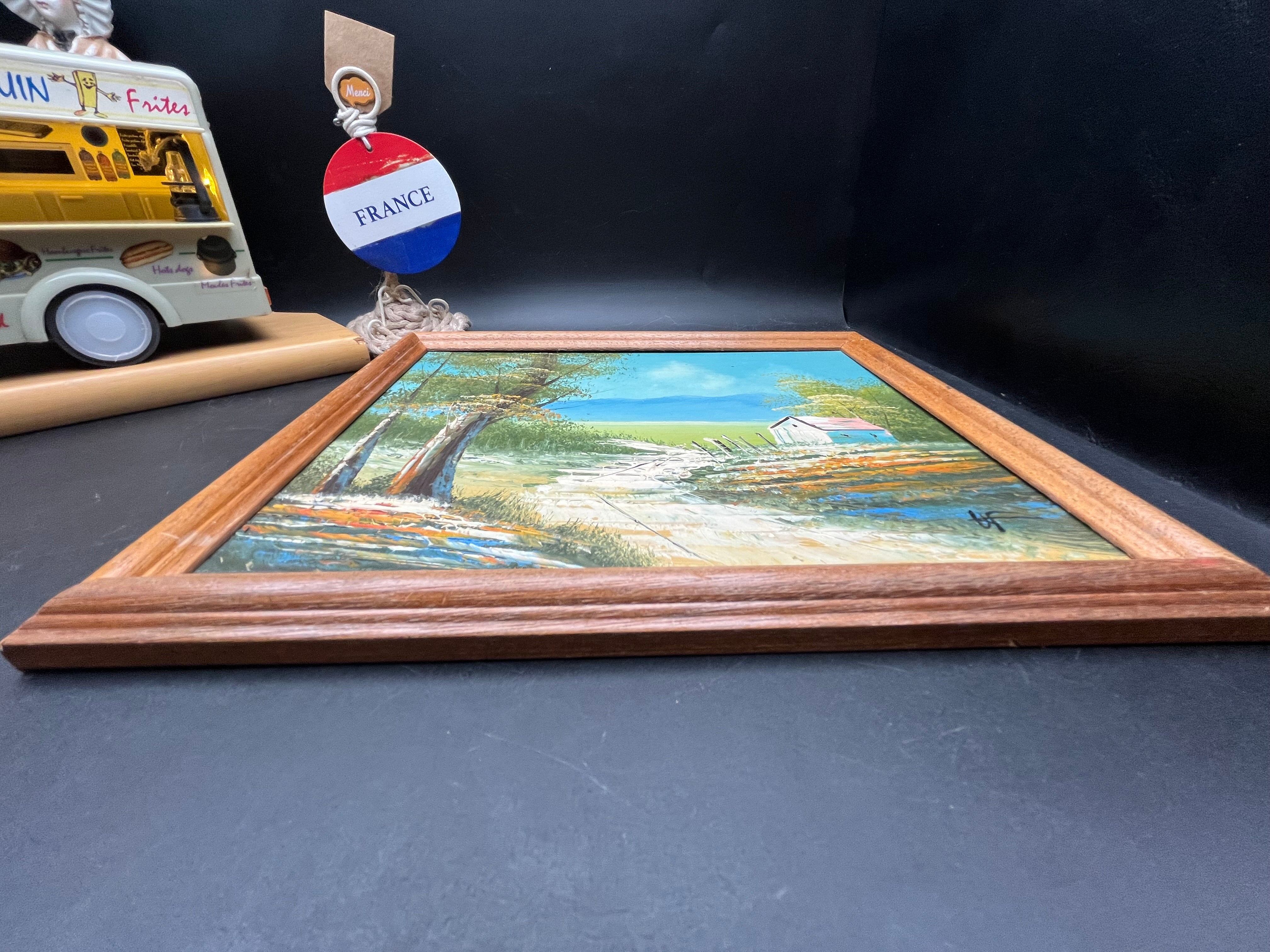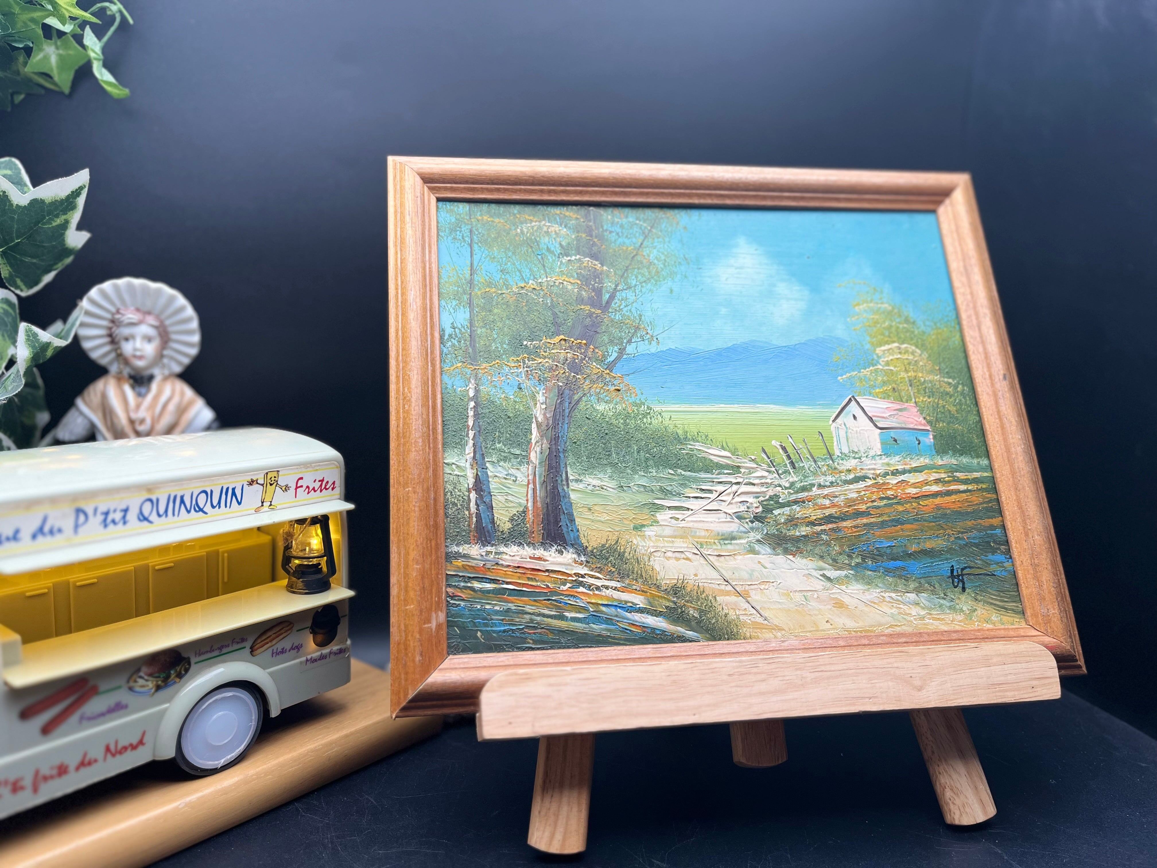 フランス田園風景の木製フレーム油彩画〈サイン入り〉