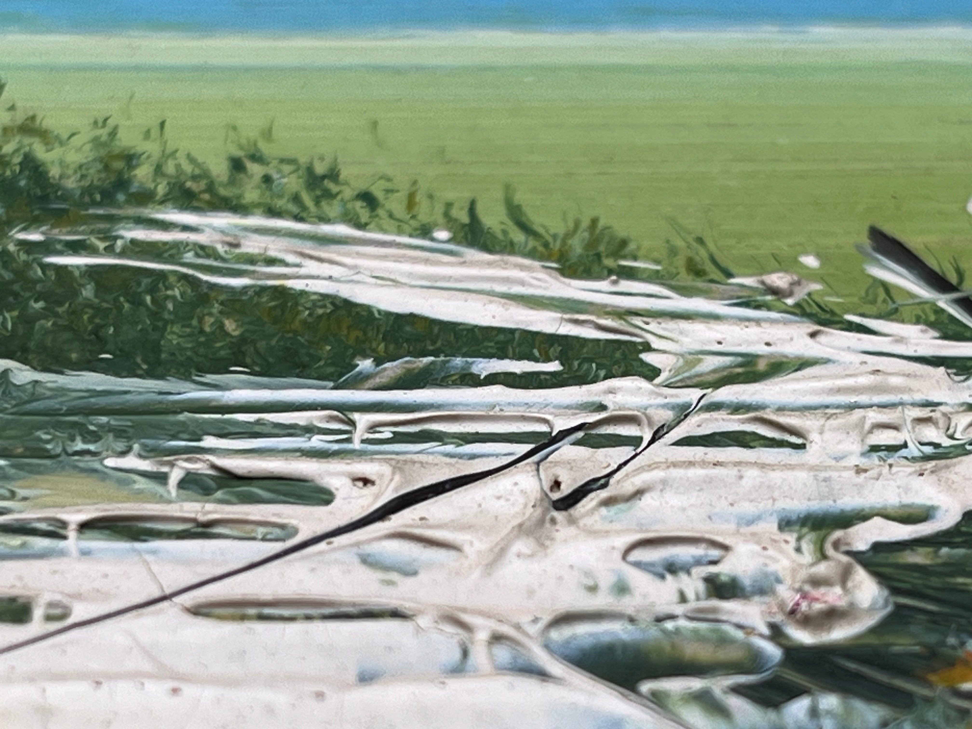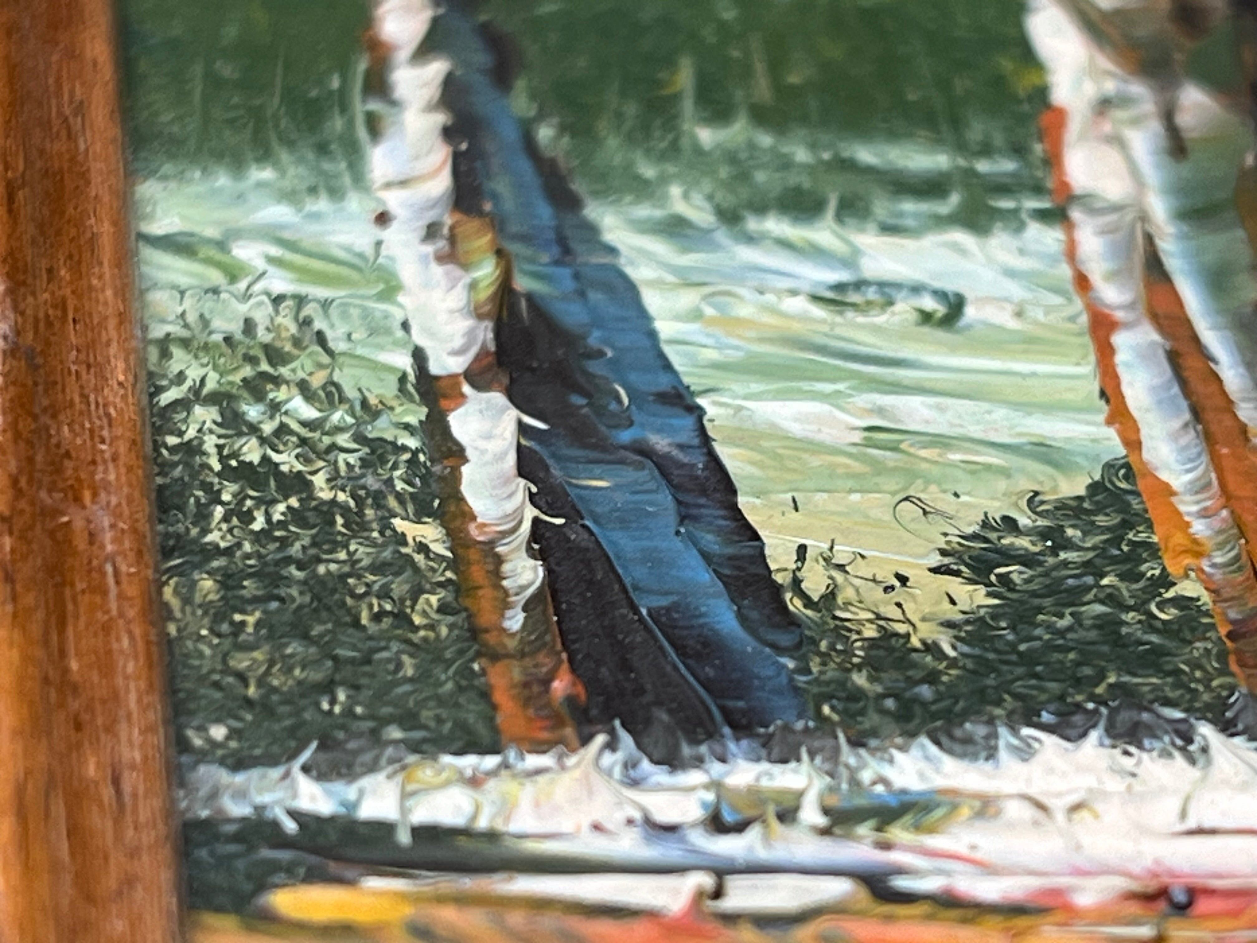 画面には澄んだ青空、遠くの山並み、小道と木立、そして小さな家が描かれ、穏やかな情景がインテリアに癒しを与えてくれます。手書きである為に顔料の盛り上がりがあり、印刷では無い事が解ります。右下には作者サインがあり、裏面には「peint(フランス語で“描かれた”)」のラベルが一部残っています。