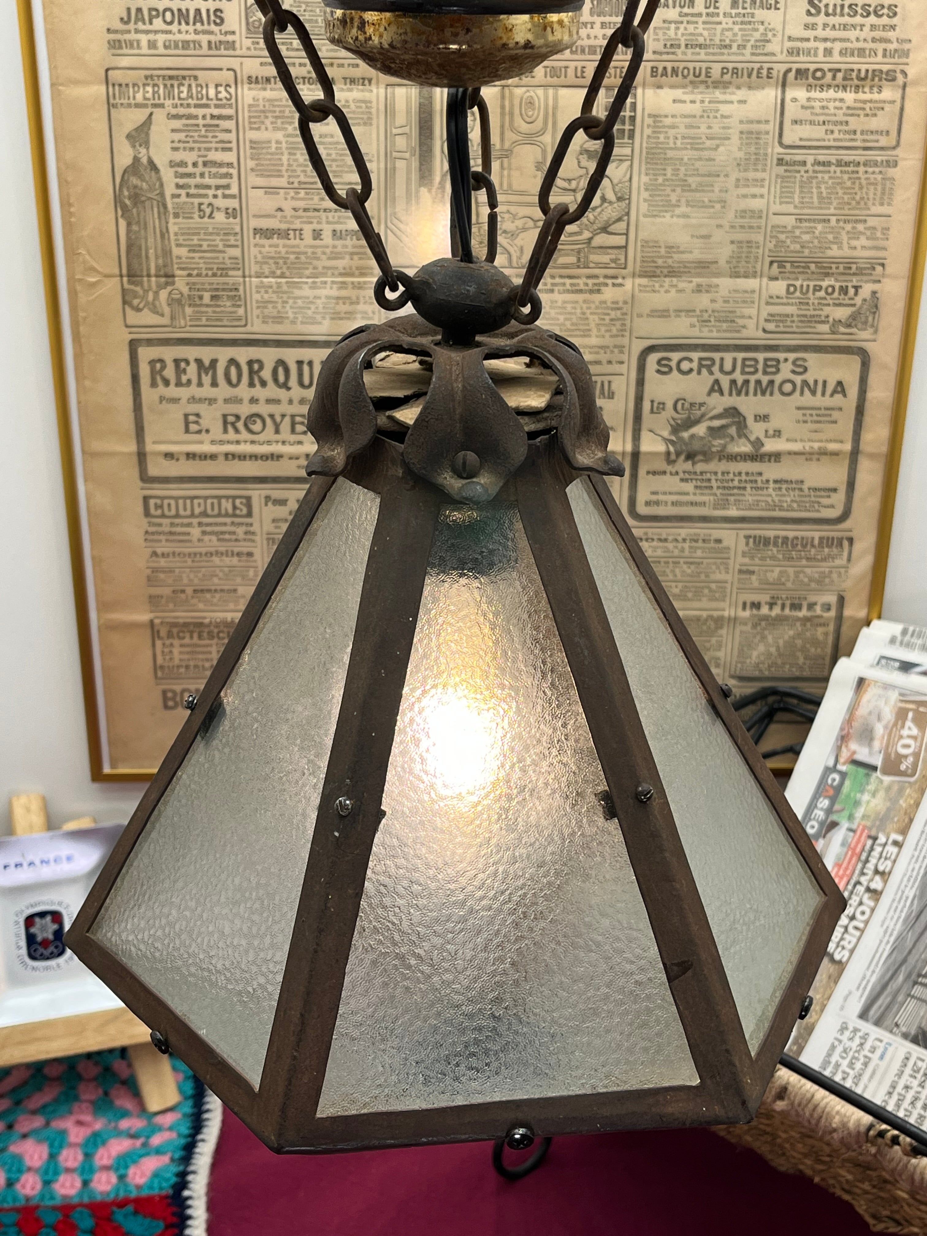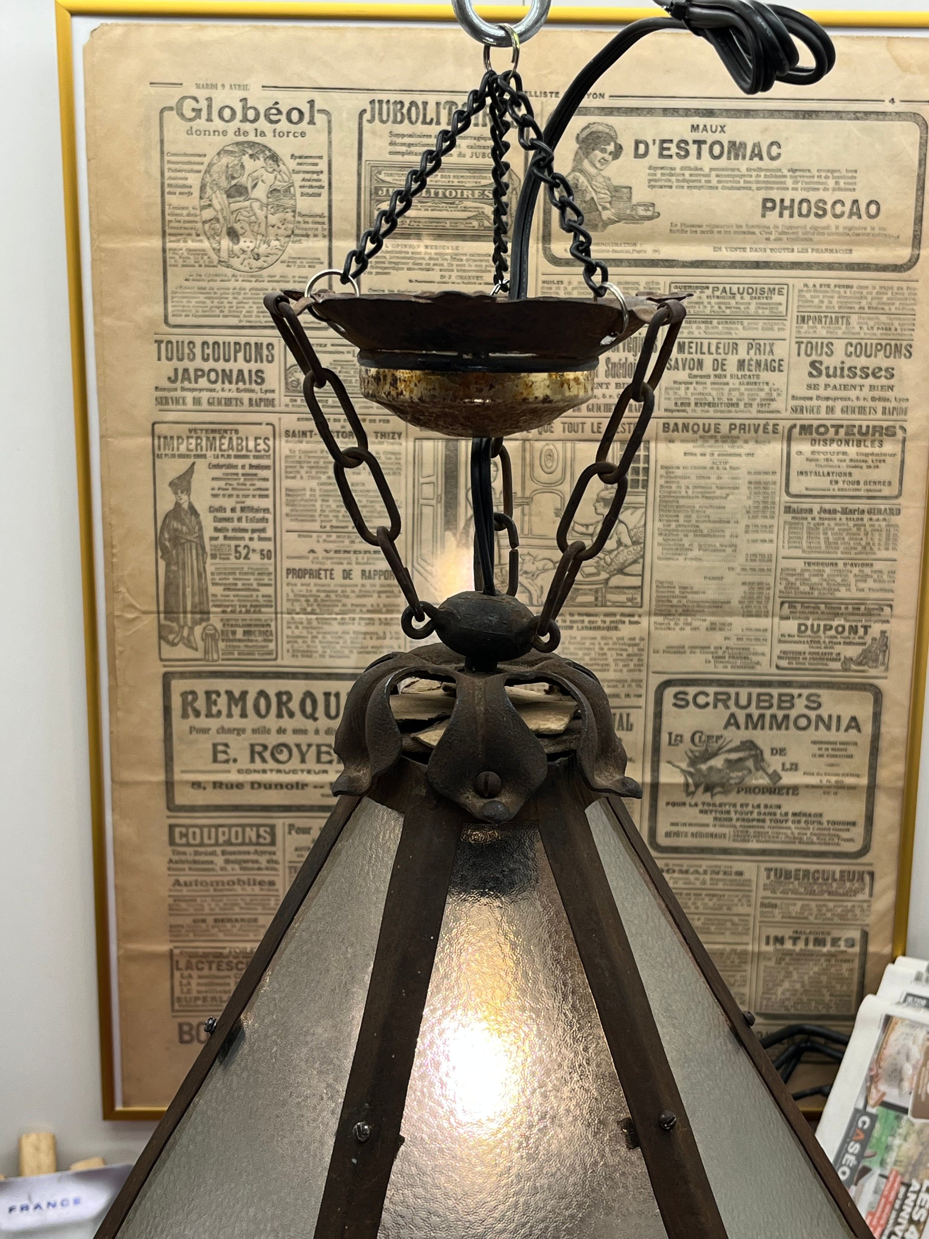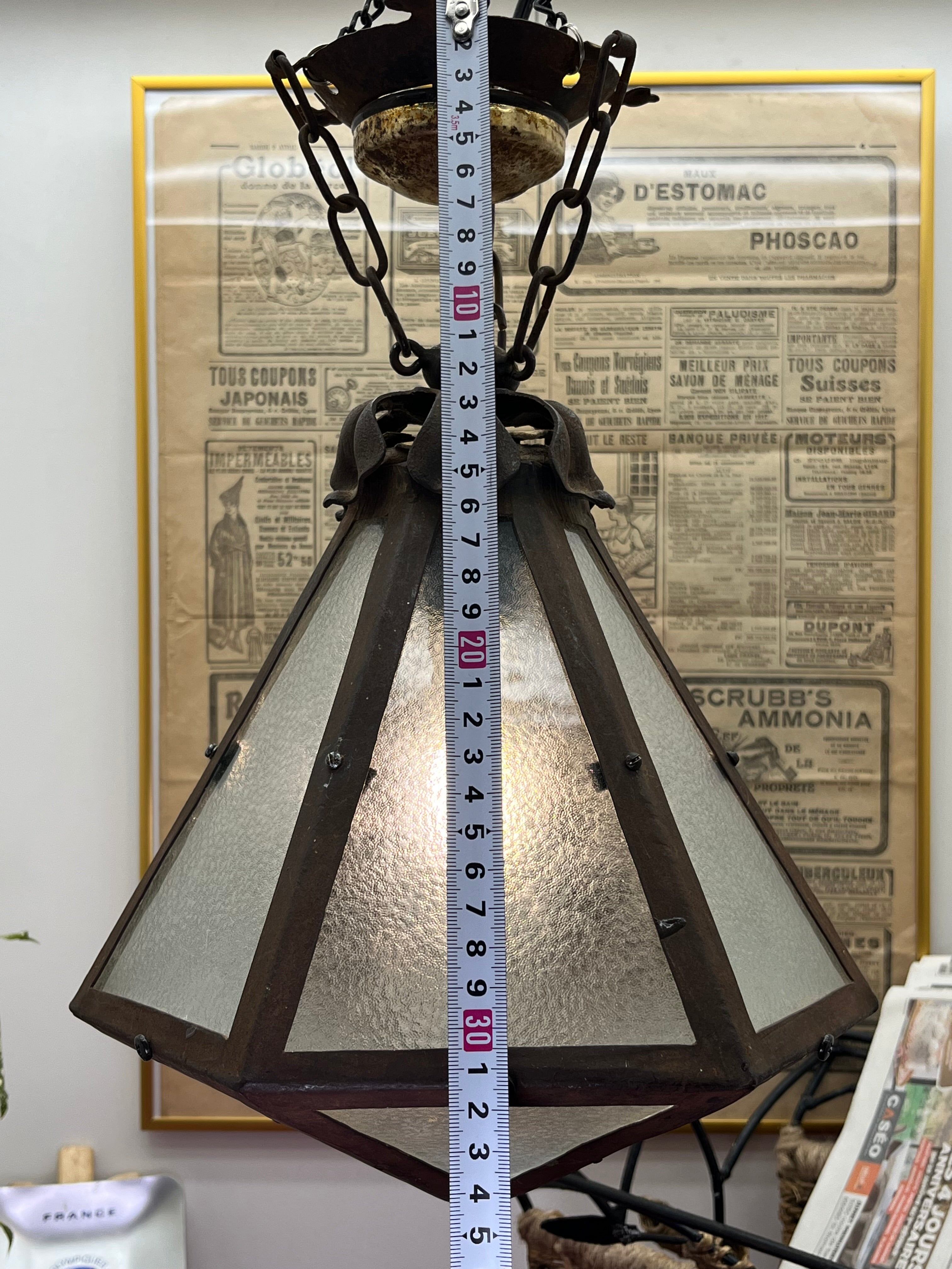 重厚なアイアンフレームと繊細なフロストガラスが融合した、フランス製アールデコ期のペンダントライトです。