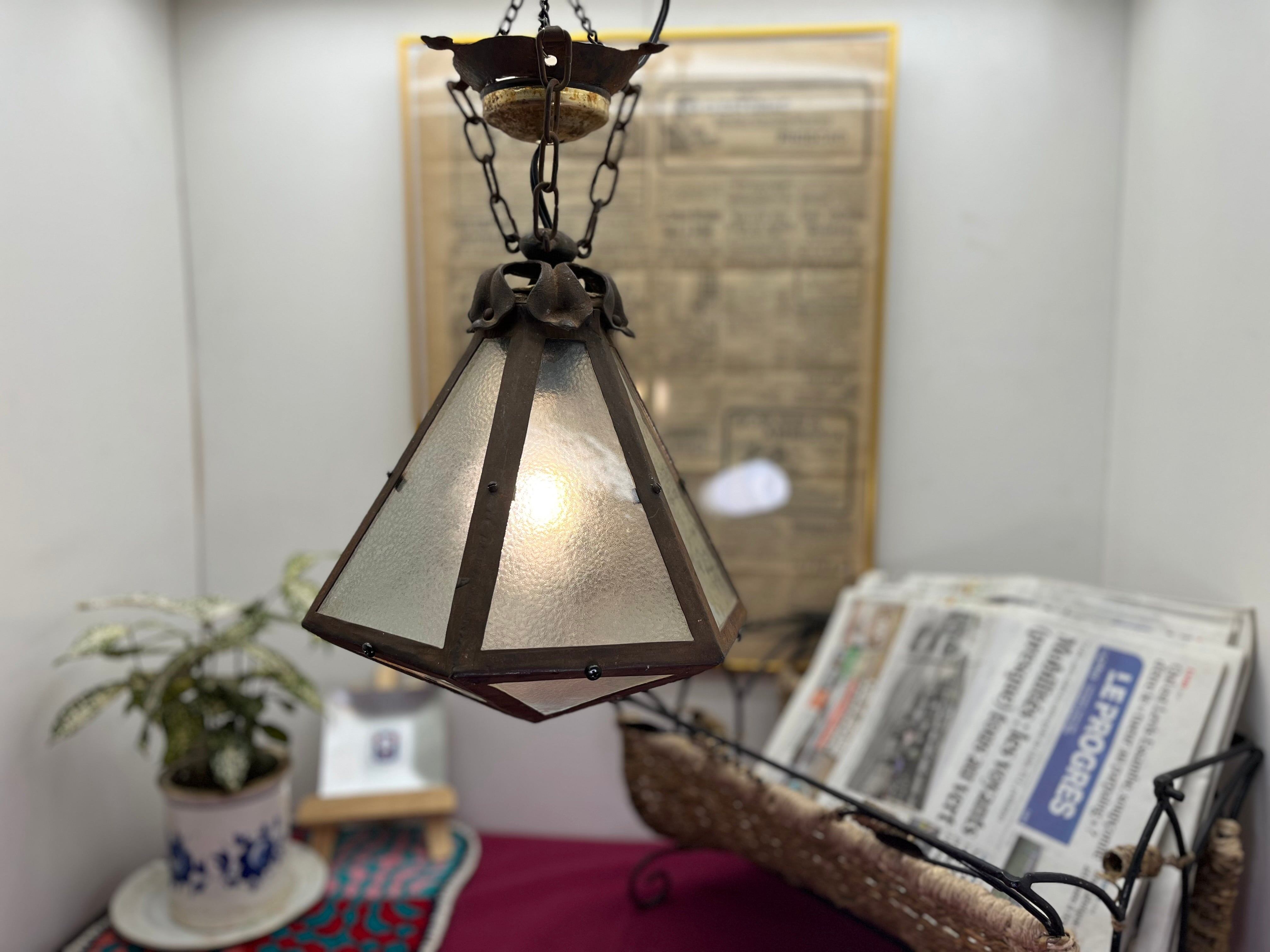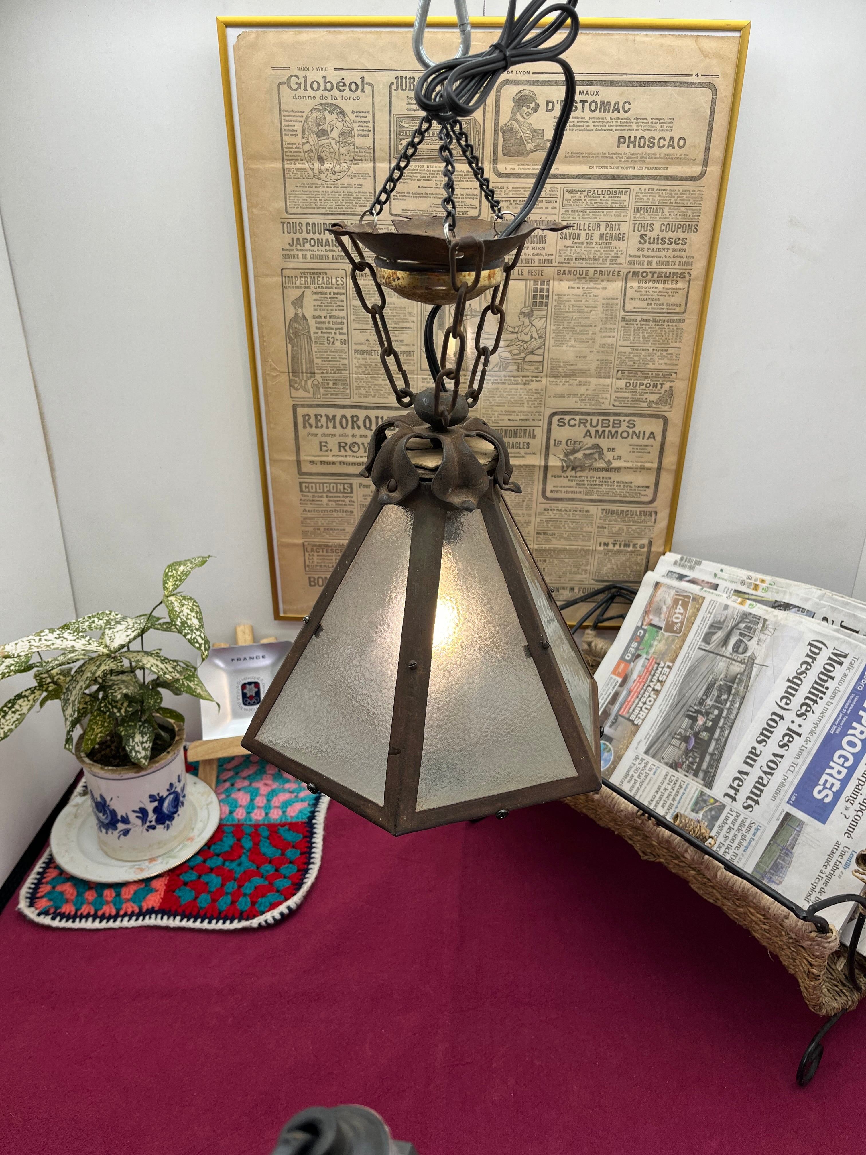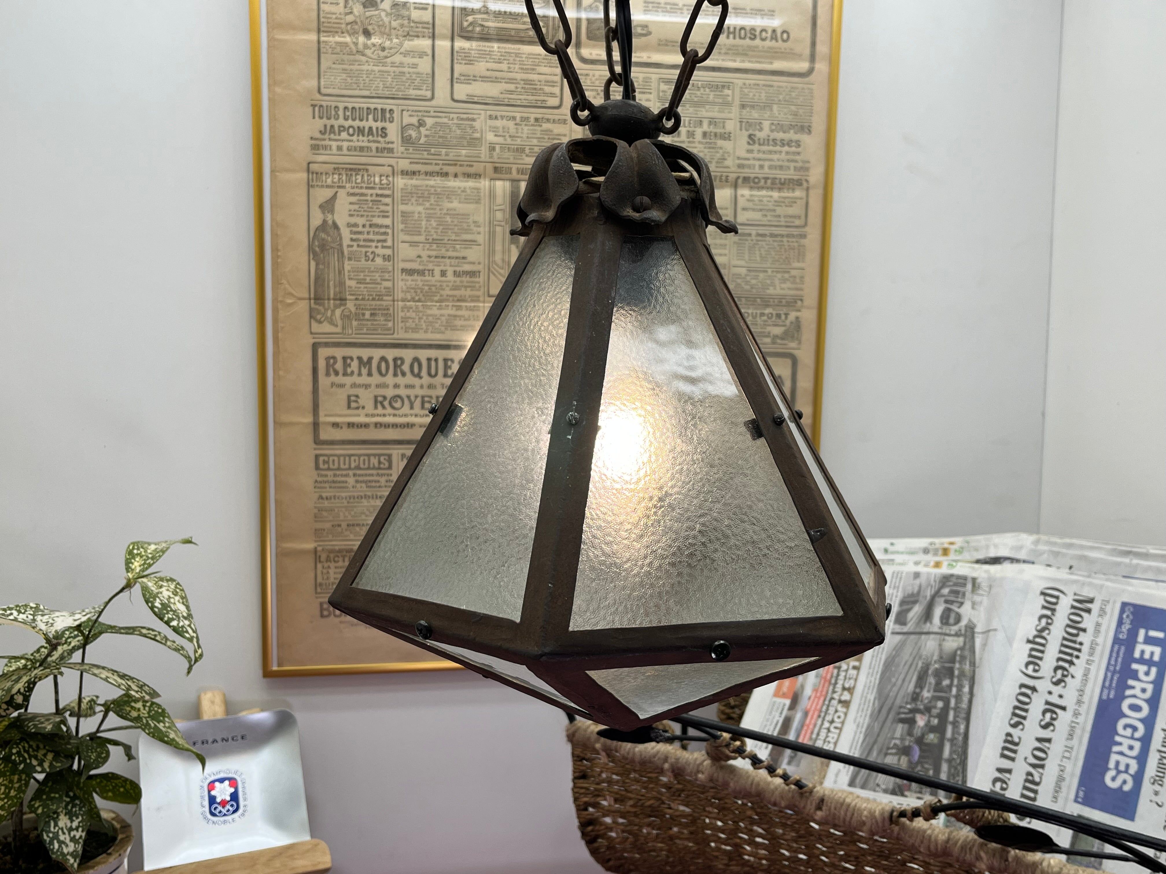 重厚なアイアンフレームと繊細なフロストガラスが融合した、フランス製アールデコ期のペンダントライトです。