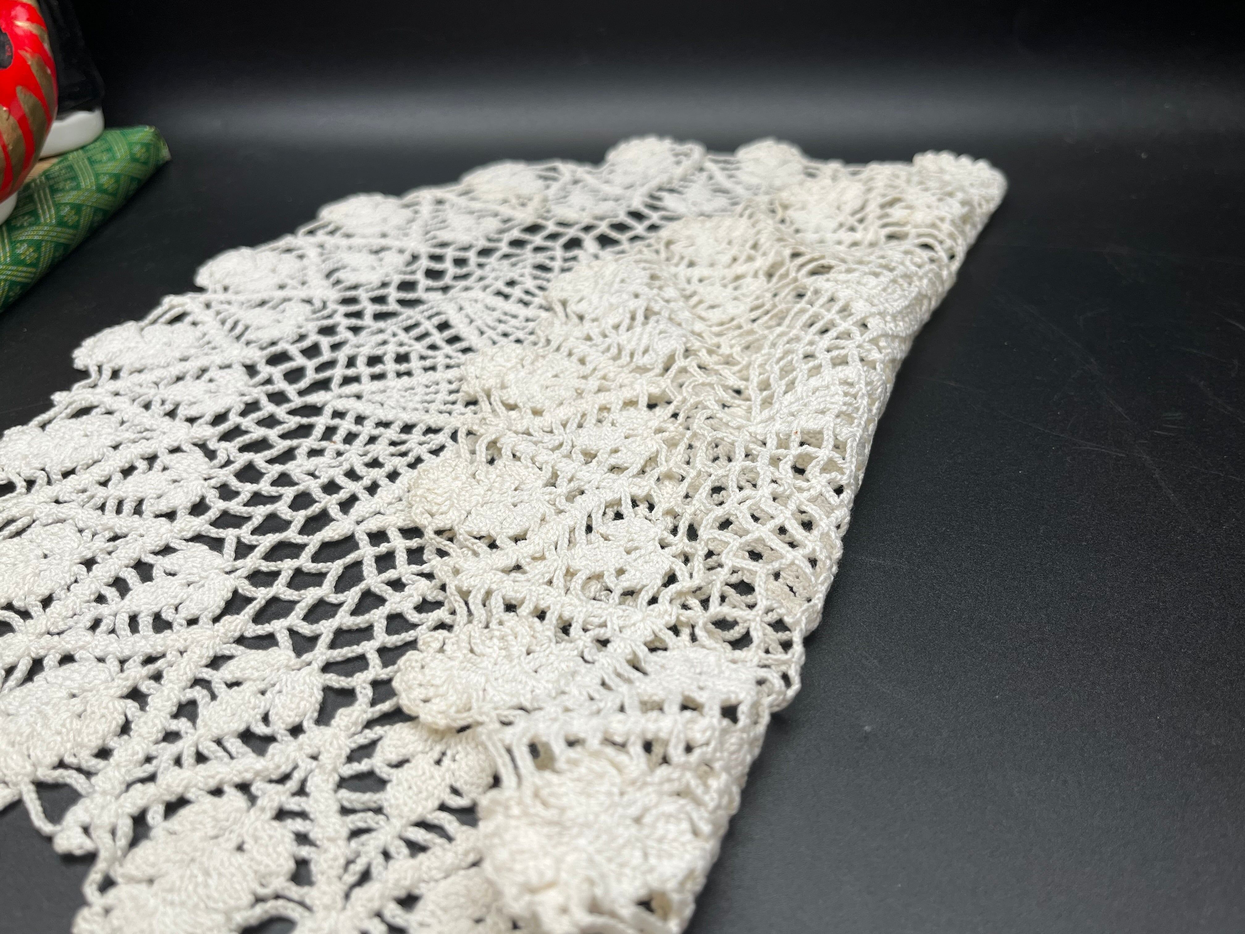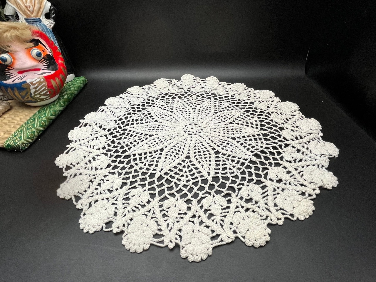 状態: 良好(使用感少なめ) 中心から放射状に広がるパイナップル模様と、 立体的な花モチーフの縁取りが美しい一品です。 テーブルやサイドボードの装飾、花瓶敷きなどに最適です。 丁寧な手仕事による温かみのある一点物です。