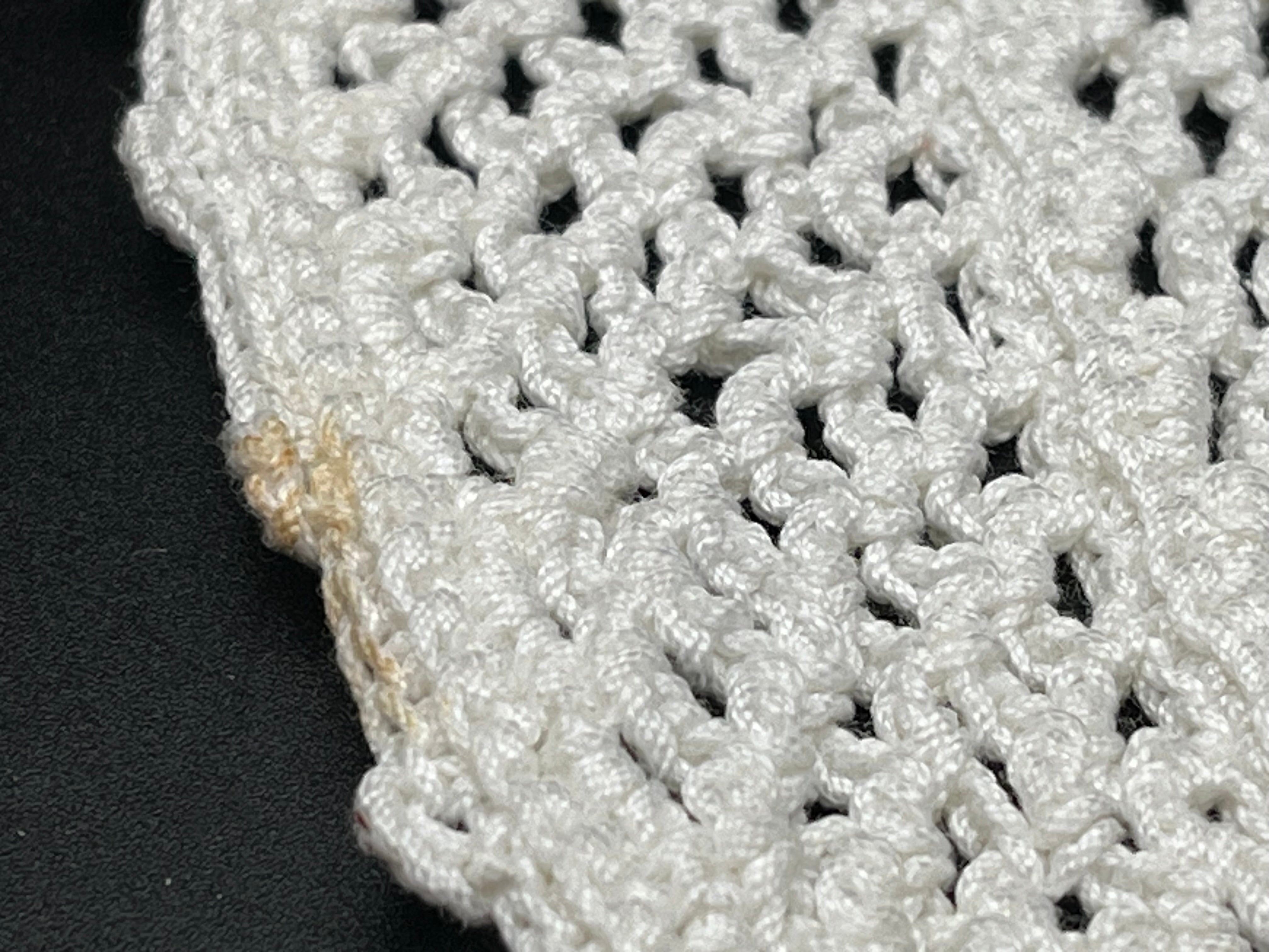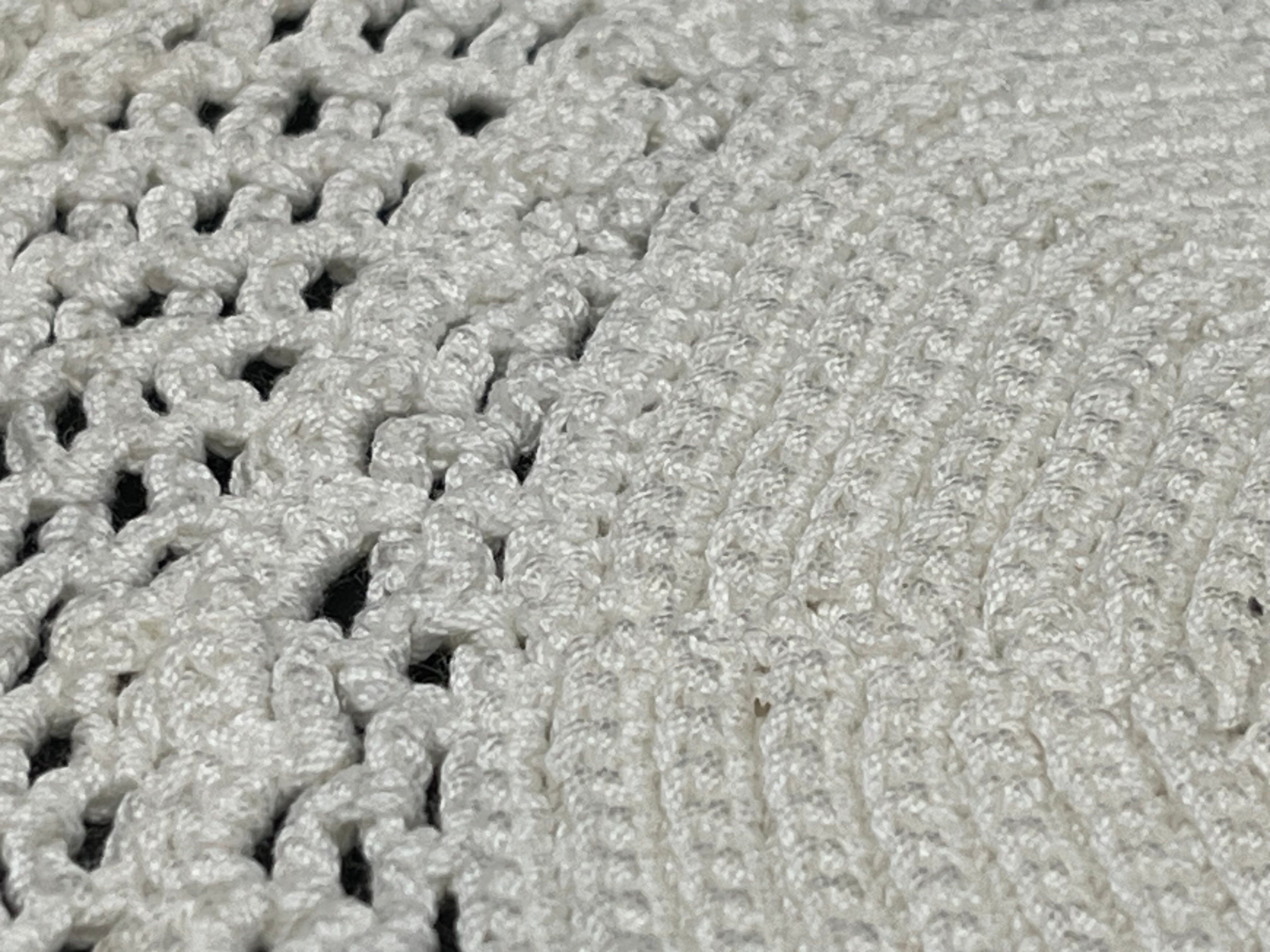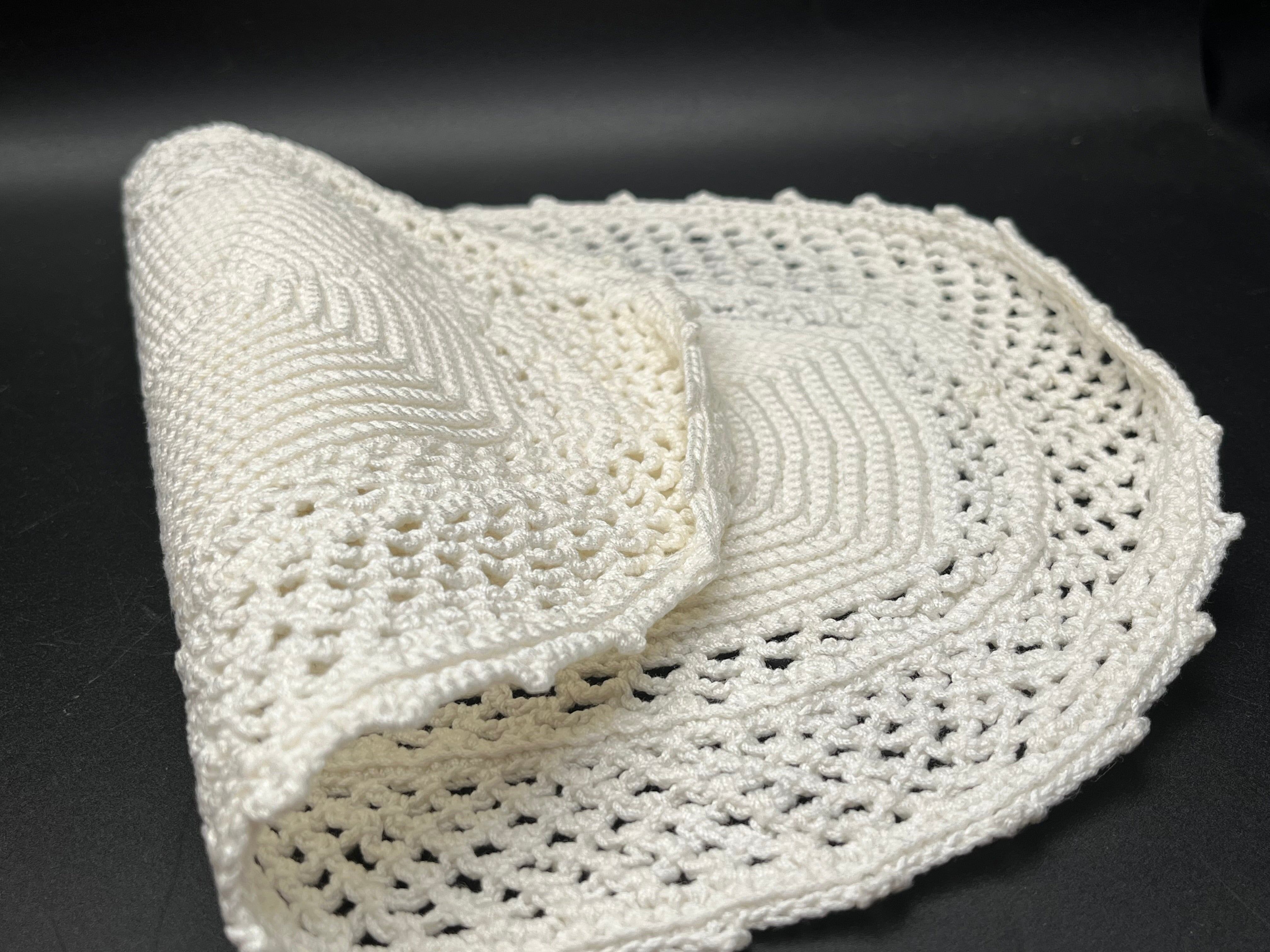 白いコットン糸で丁寧に編まれており、繊細な模様が美しい一枚です。