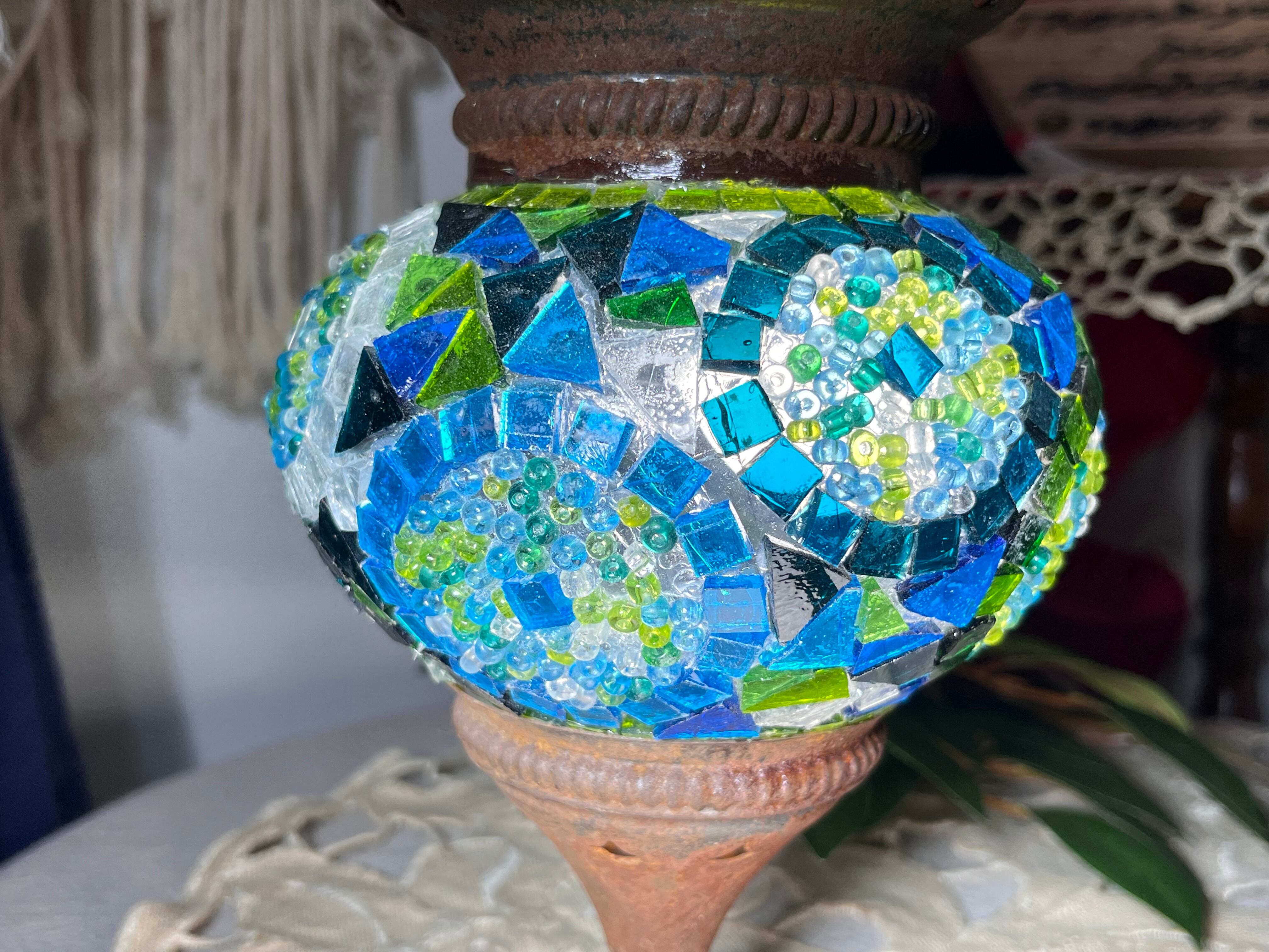 イスタンブールで仕入れた色鮮やかなモザイクガラスが360度に光を反射し、青・緑・ターコイズの爽やかなトーンで彩られています。ハンドペイントの陶器製フラワー装飾が施されている陶器が輸送で破損し、無事で残った部分を使ってクラシカルで愛らしい印象の照明器具を自作しました。