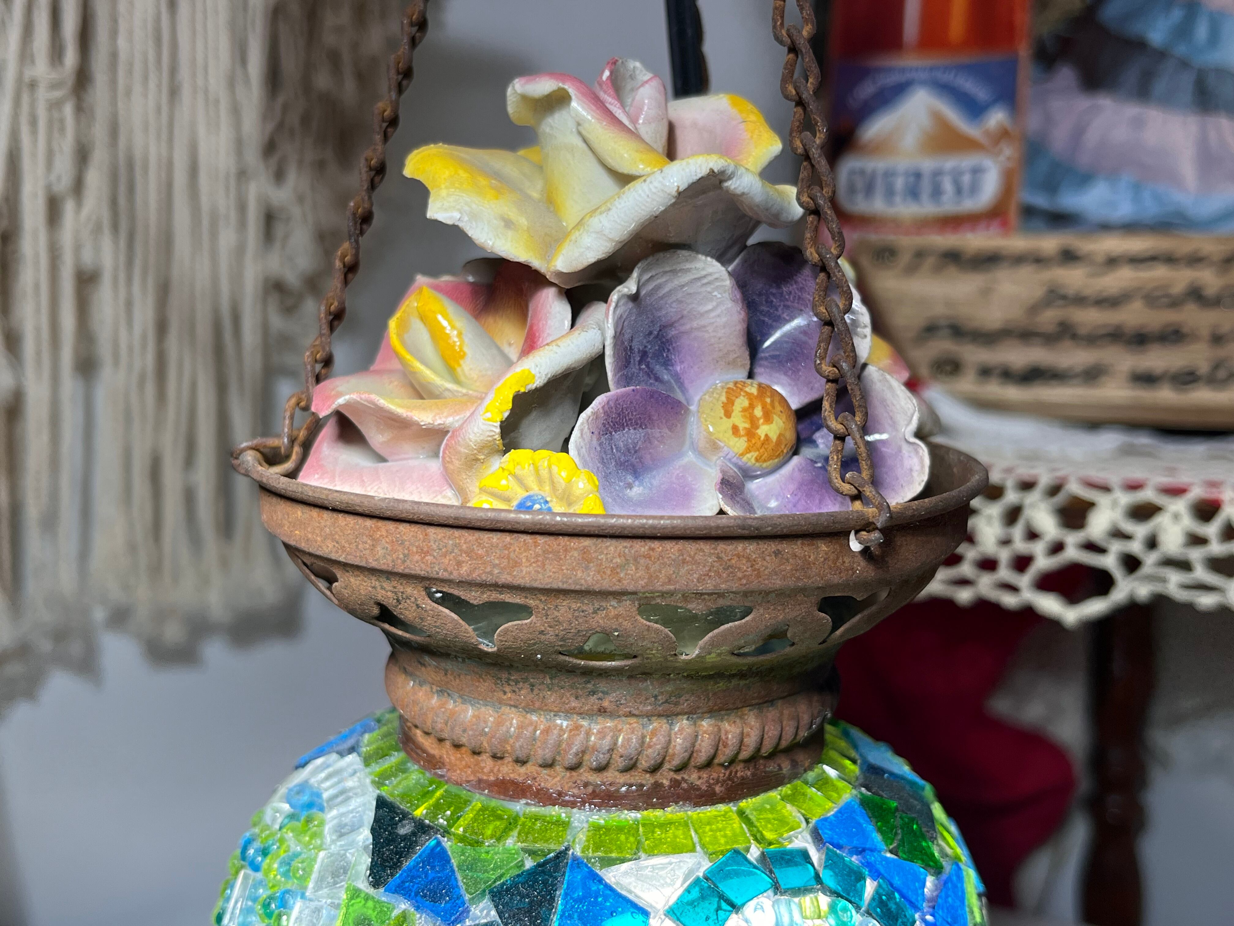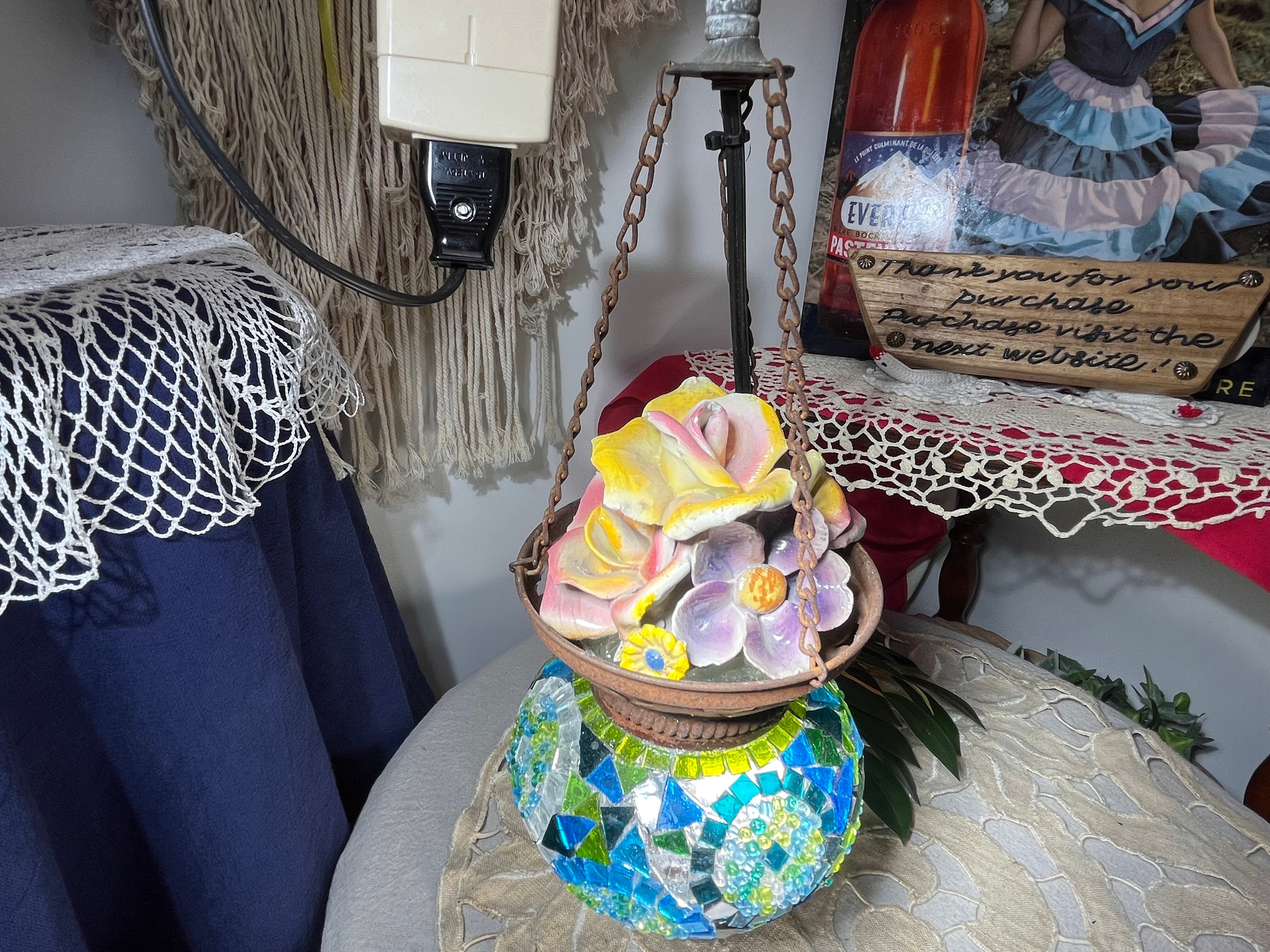 モザイクガラスと陶器のフラワートップの破損寄せ集めヴィンテージ吊り下げランプ