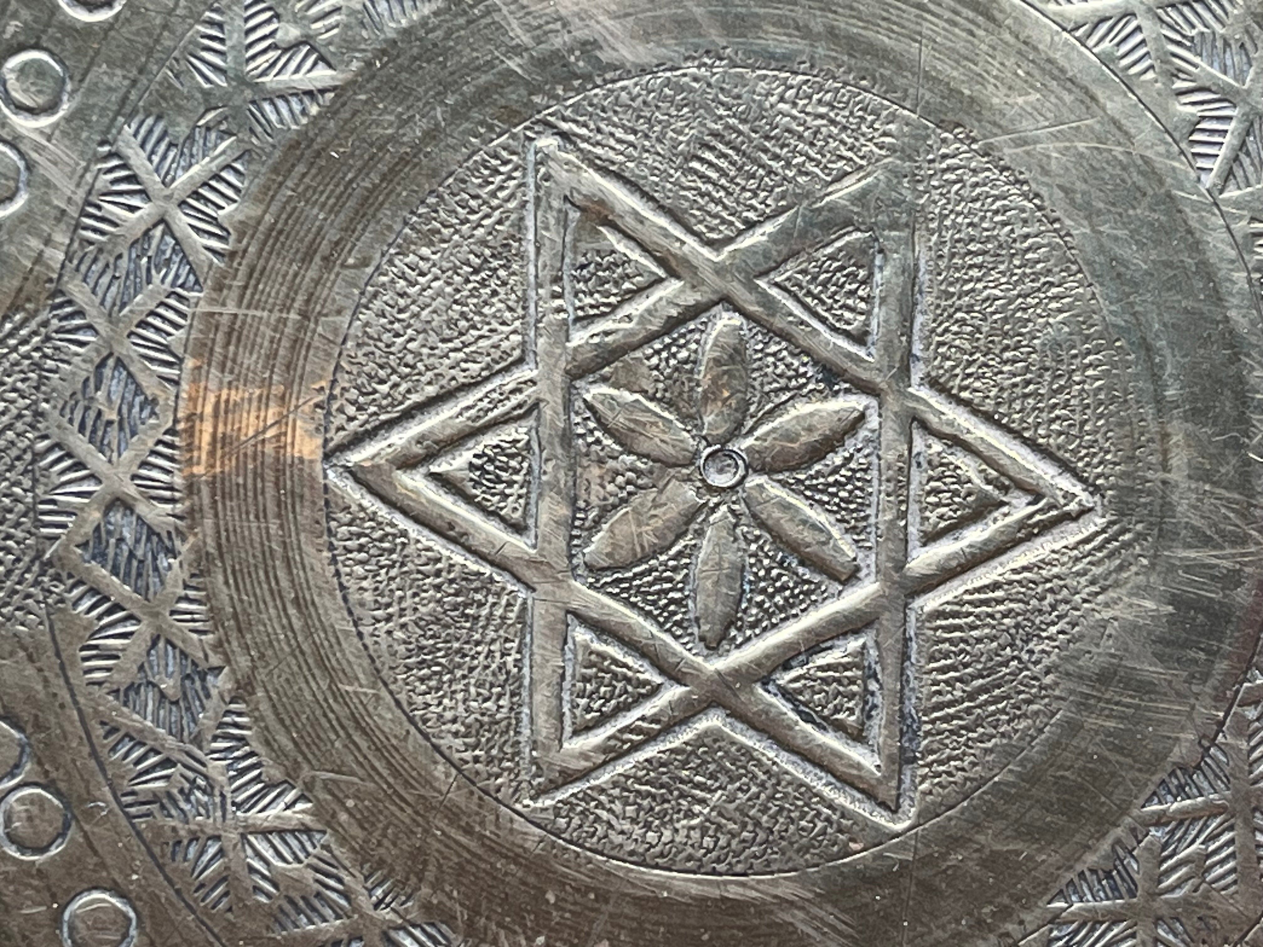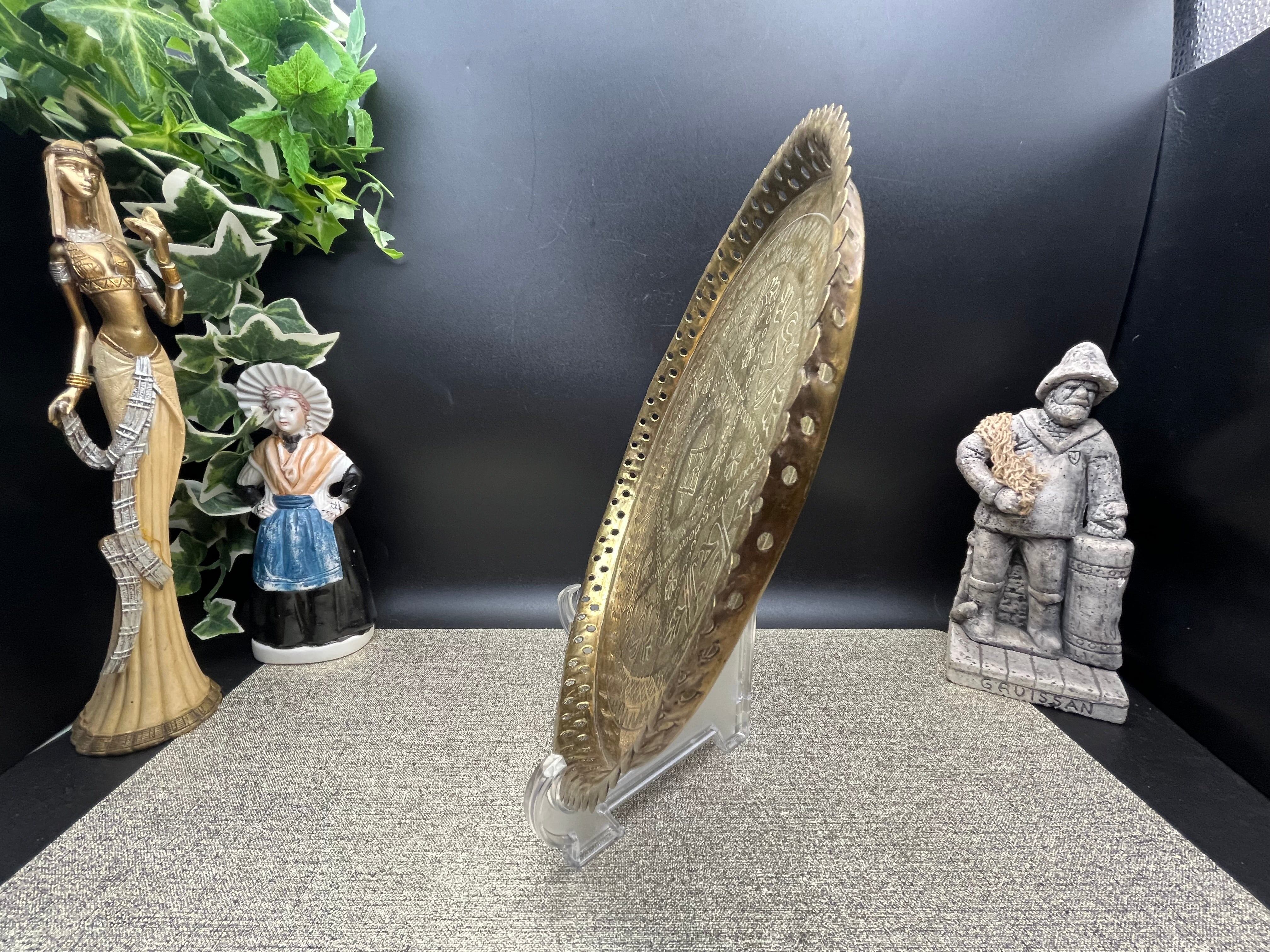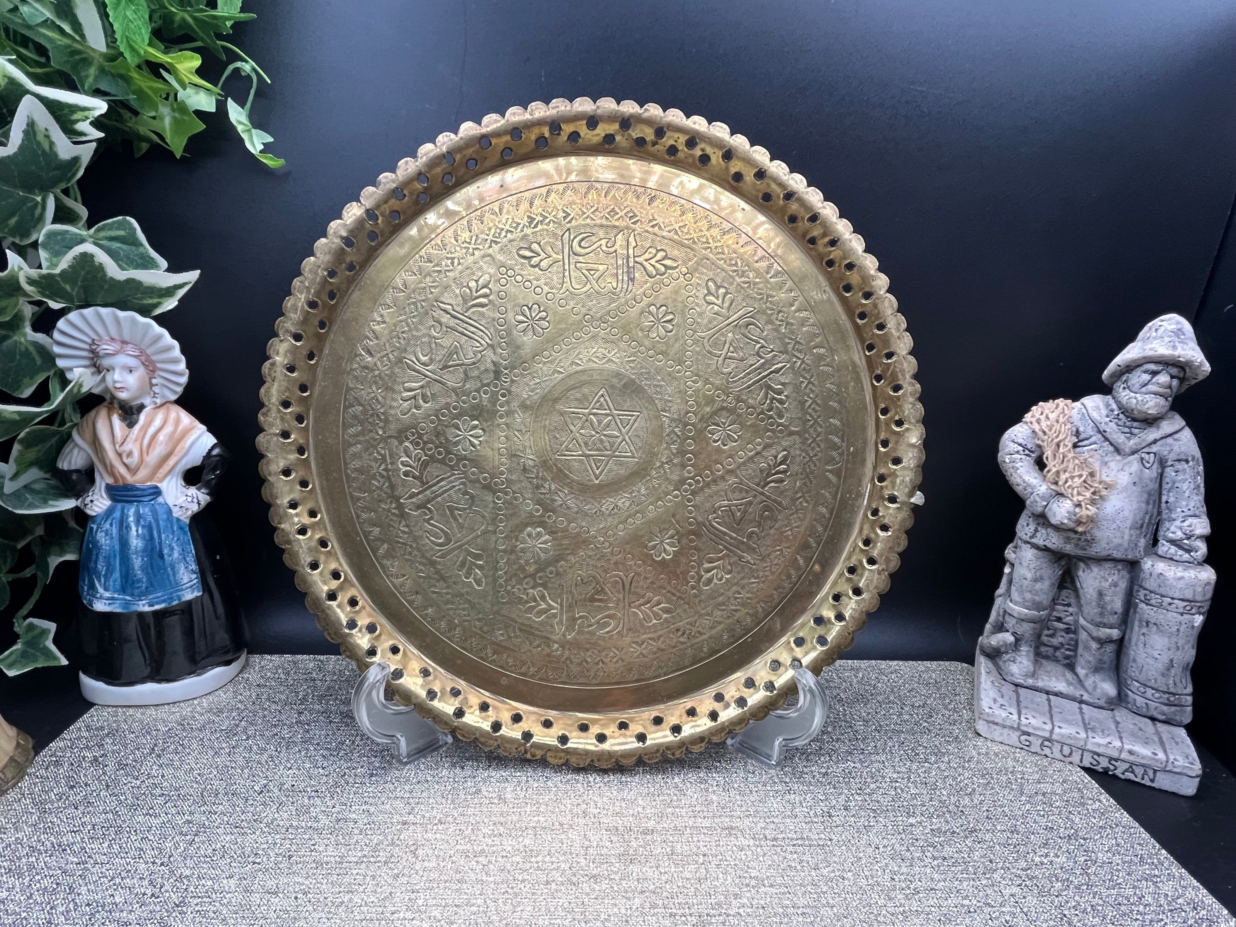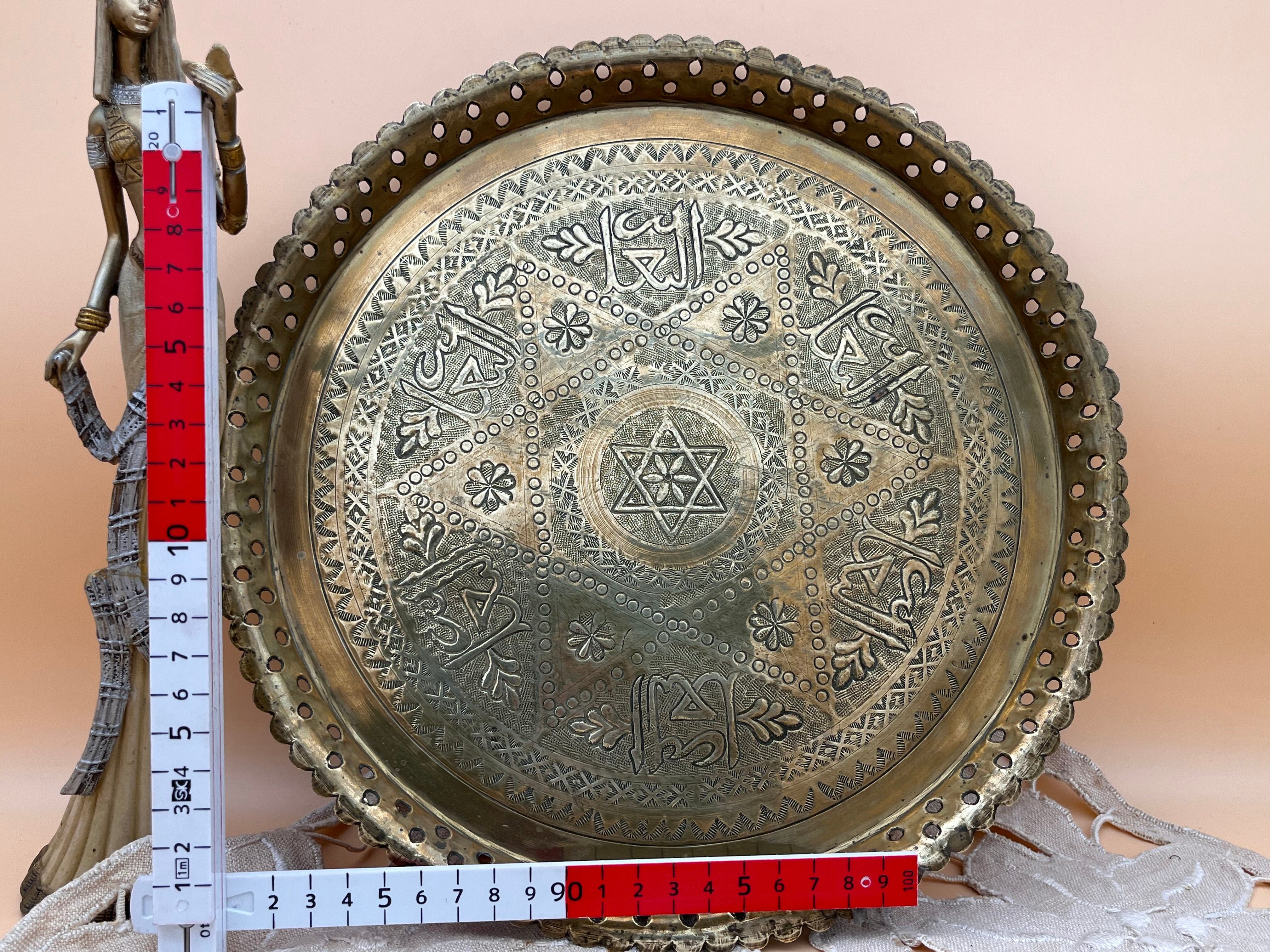 直径約28cm、高さ約2cmほどのサイズ感で、中央には六芒星モチーフと花文様が彫金され、周囲にはアラビア風の装飾文字や植物文様が繊細に刻まれています。縁には透かし細工が施されており、光を通して美しい陰影を生み出します。