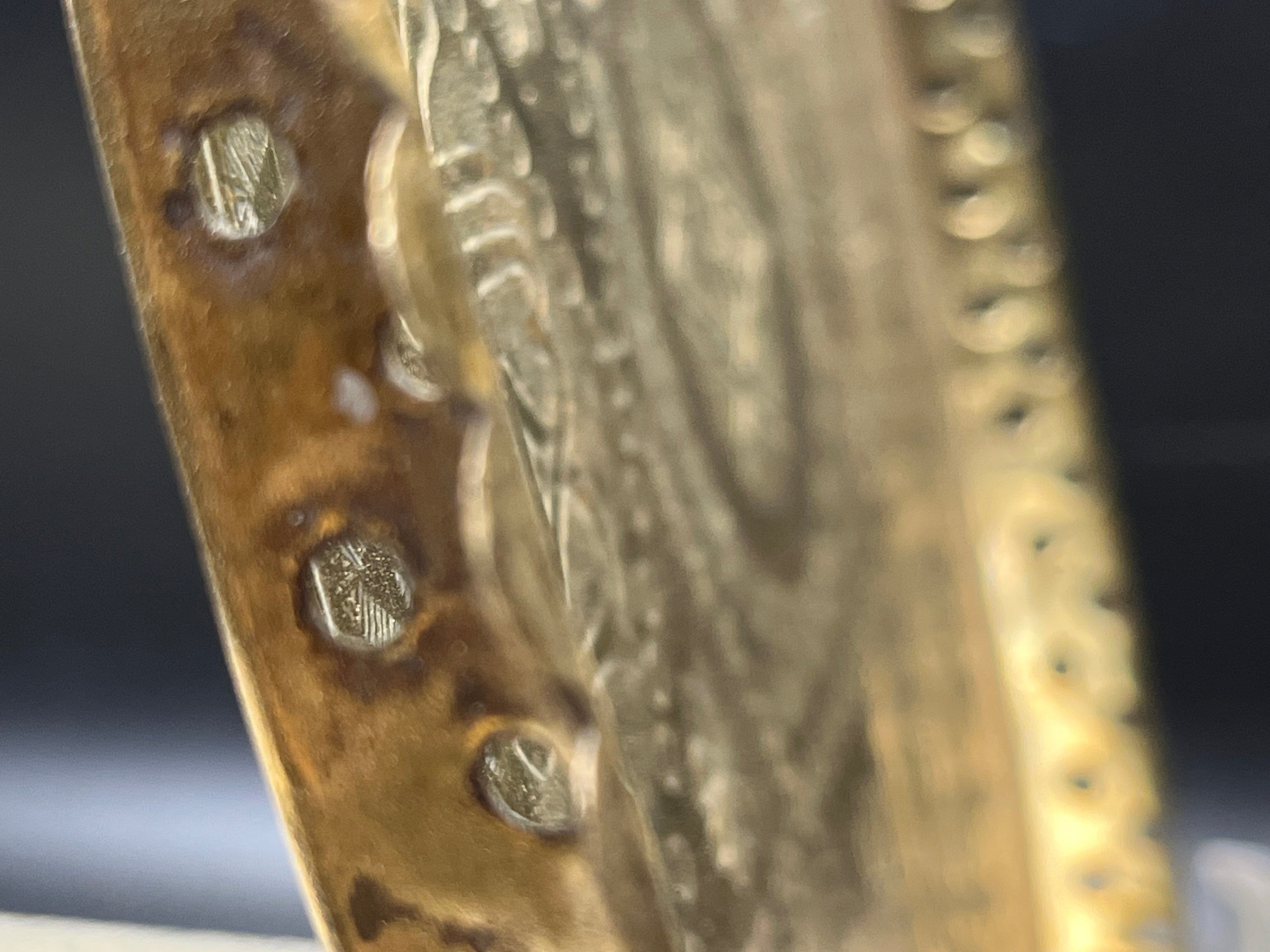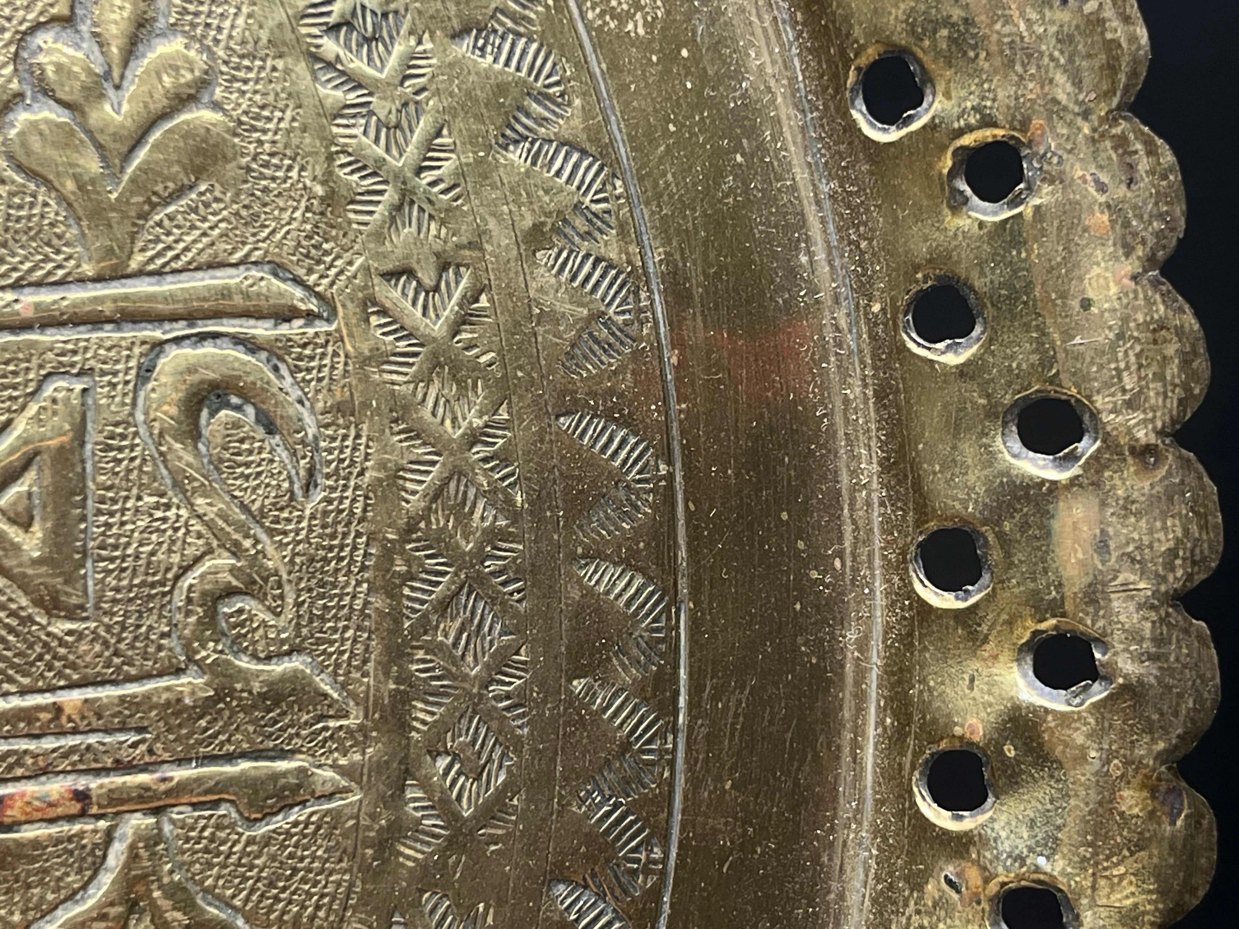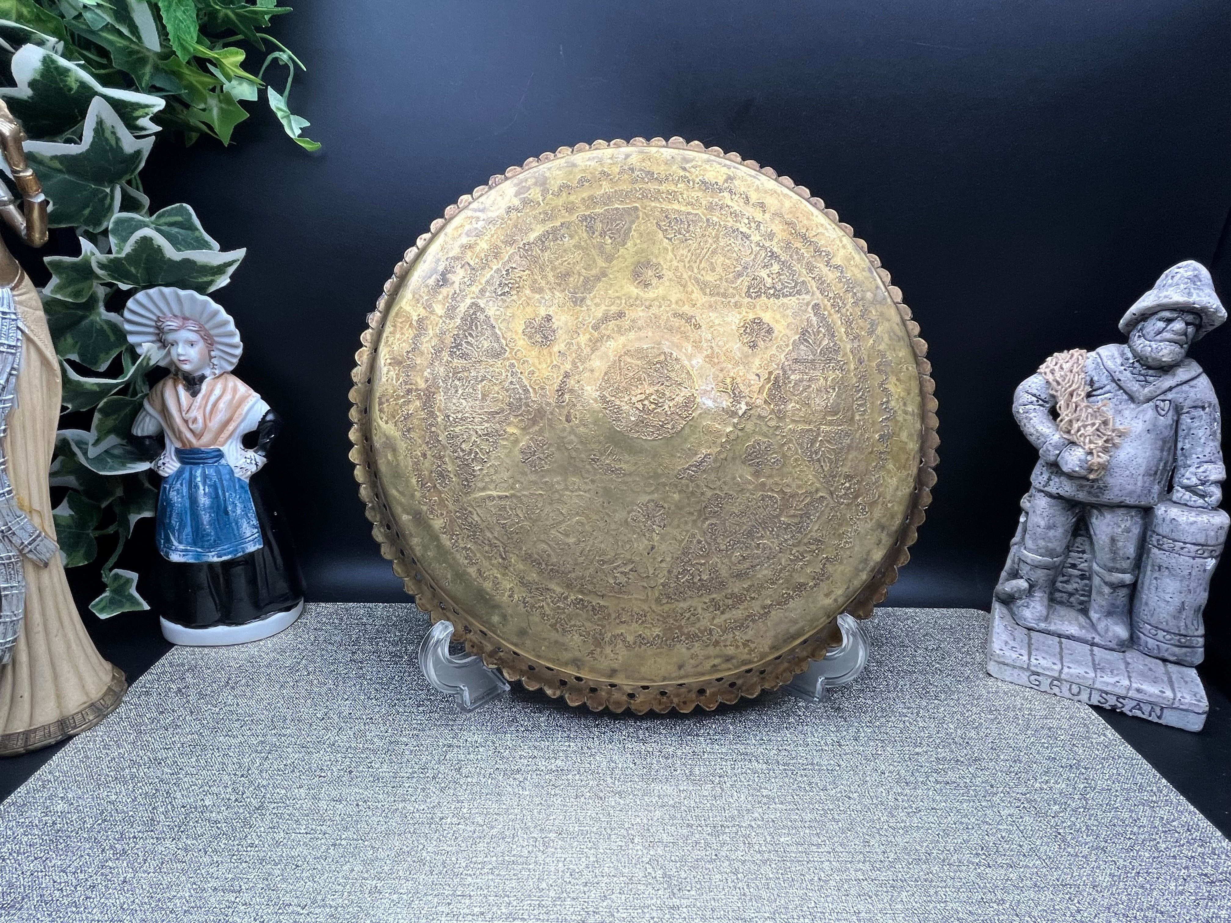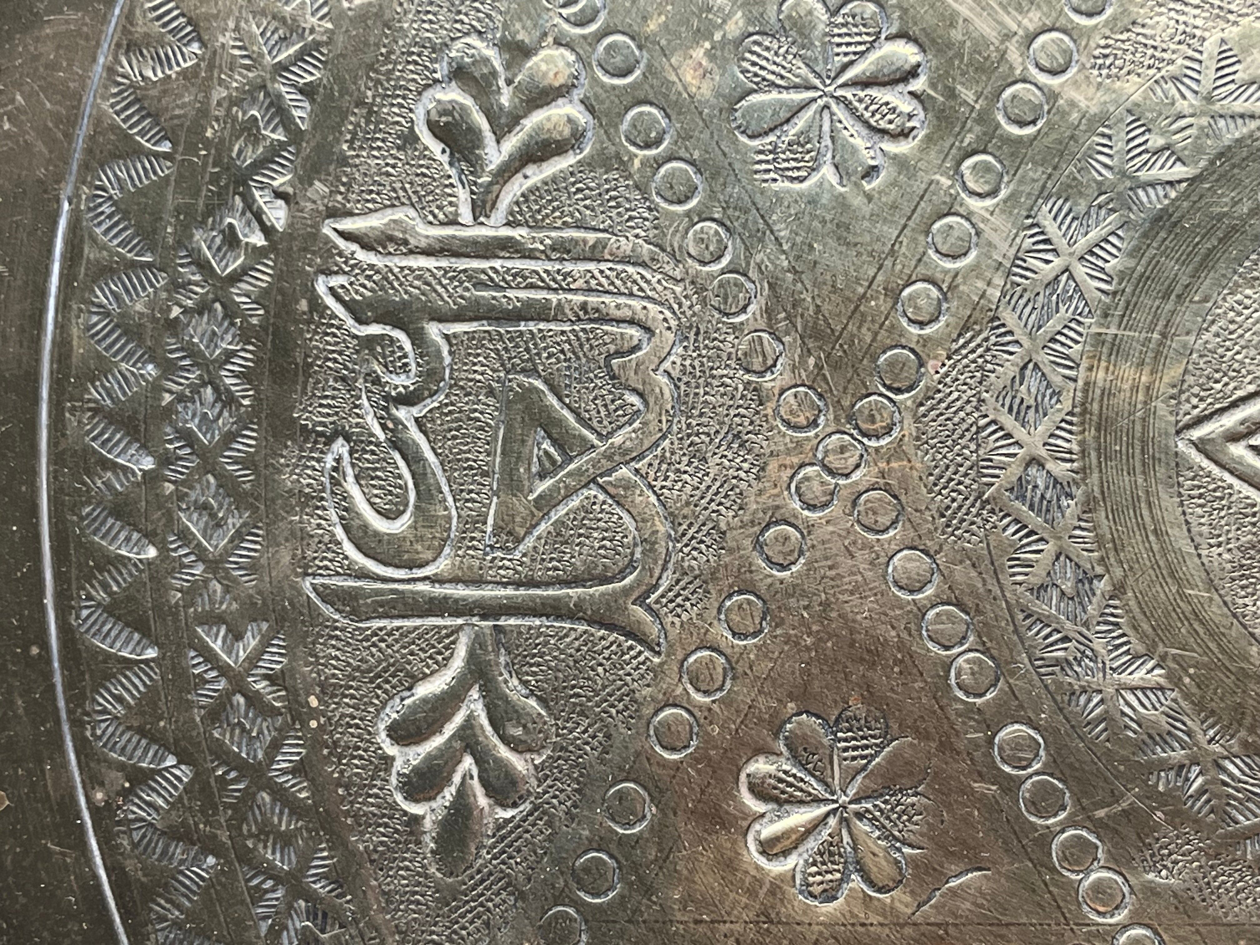 直径約28cm、高さ約2cmほどのサイズ感で、中央には六芒星モチーフと花文様が彫金され、周囲にはアラビア風の装飾文字や植物文様が繊細に刻まれています。縁には透かし細工が施されており、光を通して美しい陰影を生み出します。