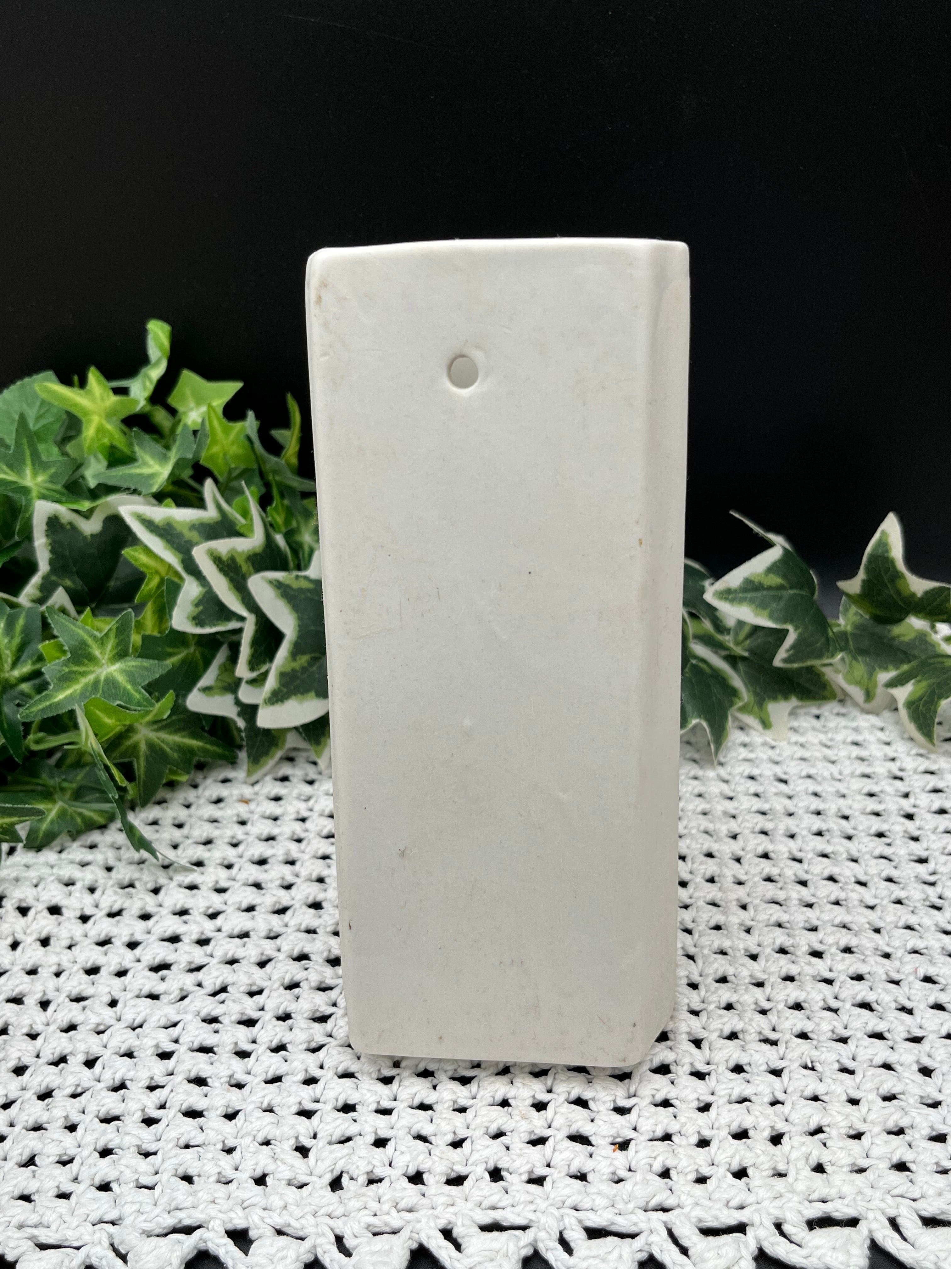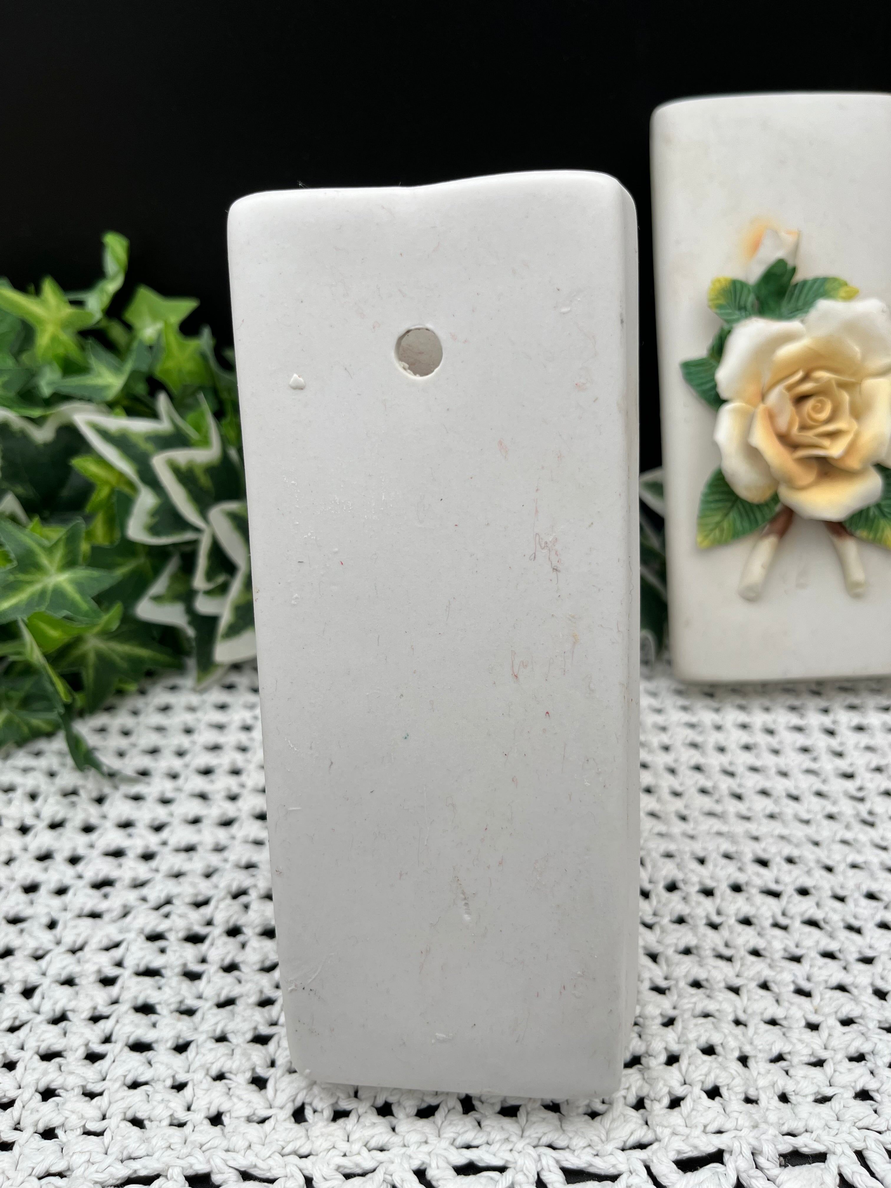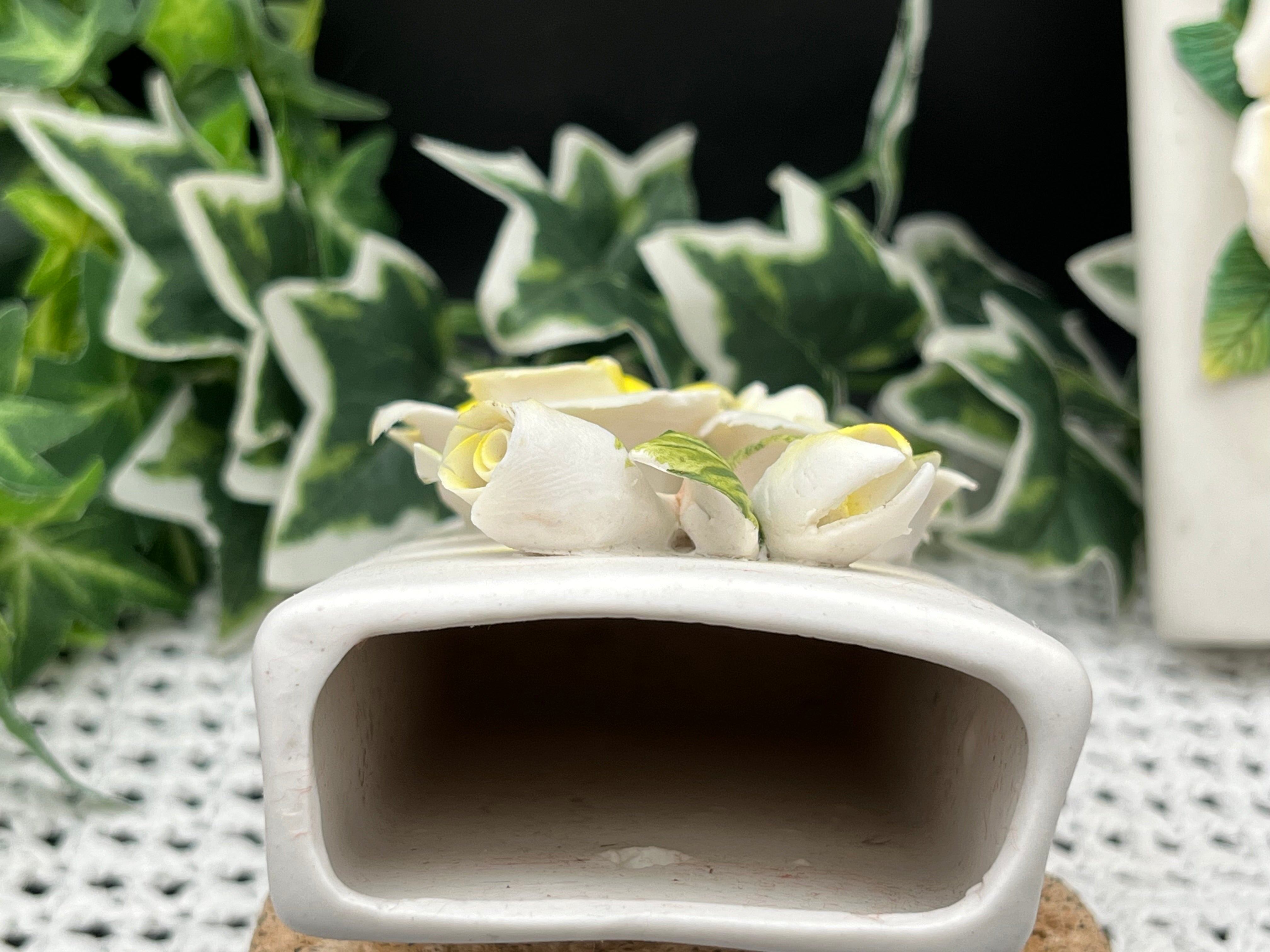 ベース部分はマット調の白い陶器で仕上げられ、正面には立体的な薔薇の花が精巧に施されています。淡いクリーム色と鮮やかなイエローの薔薇は、ひとつひとつハンドメイドで成形され、葉や枝の彩色も手描きのため表情豊か。まるで本物の花が咲いているかのような存在感があります。