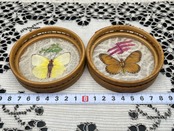 各コースターには、本物の蝶の羽や植物をもとにした装飾があしらわれ、竹製の枠に収められています。背景には和紙のような繊維質の台紙が用いられ、自然の美しさをそのまま切り取ったような趣をお楽しみいただけます。