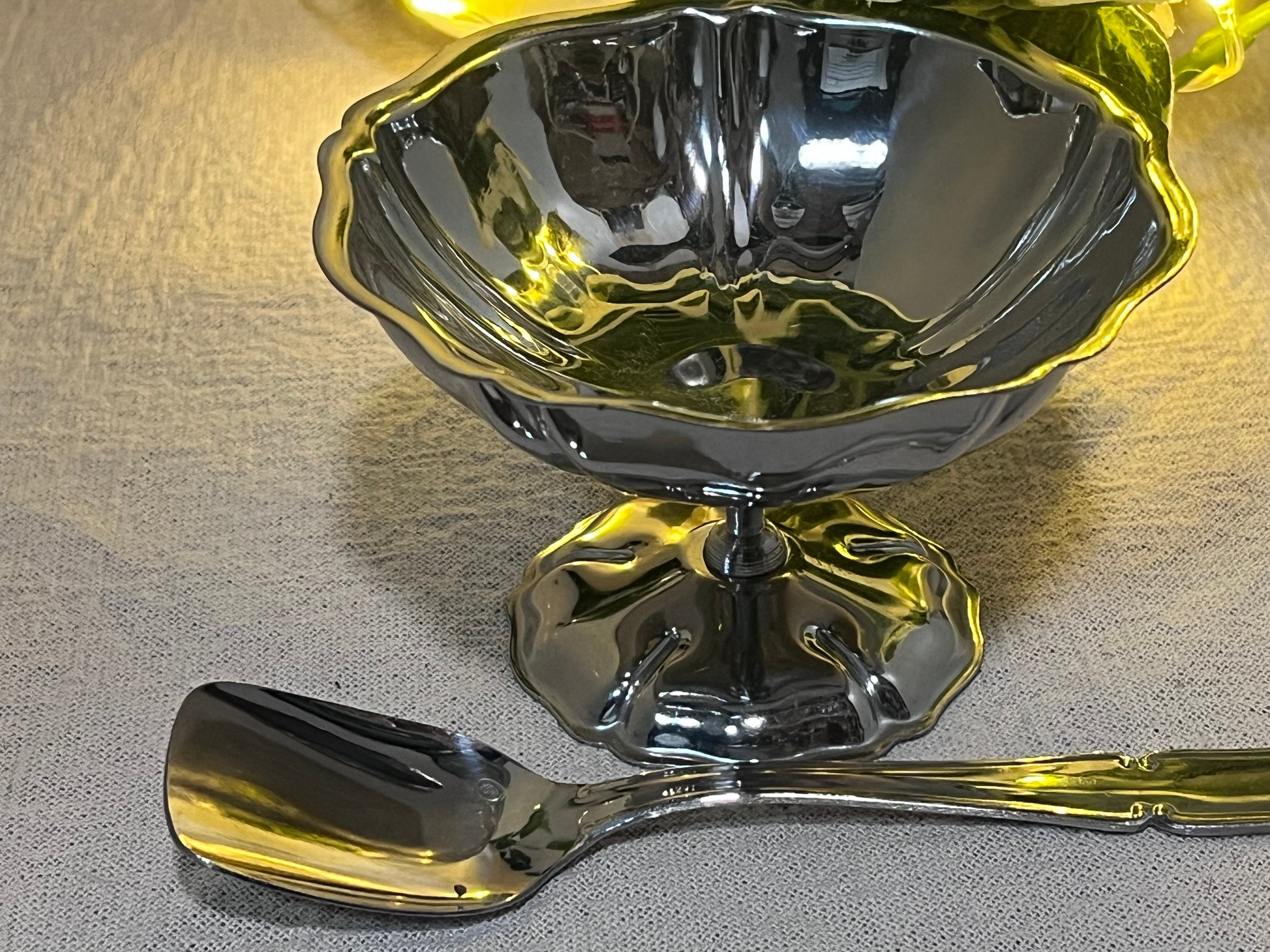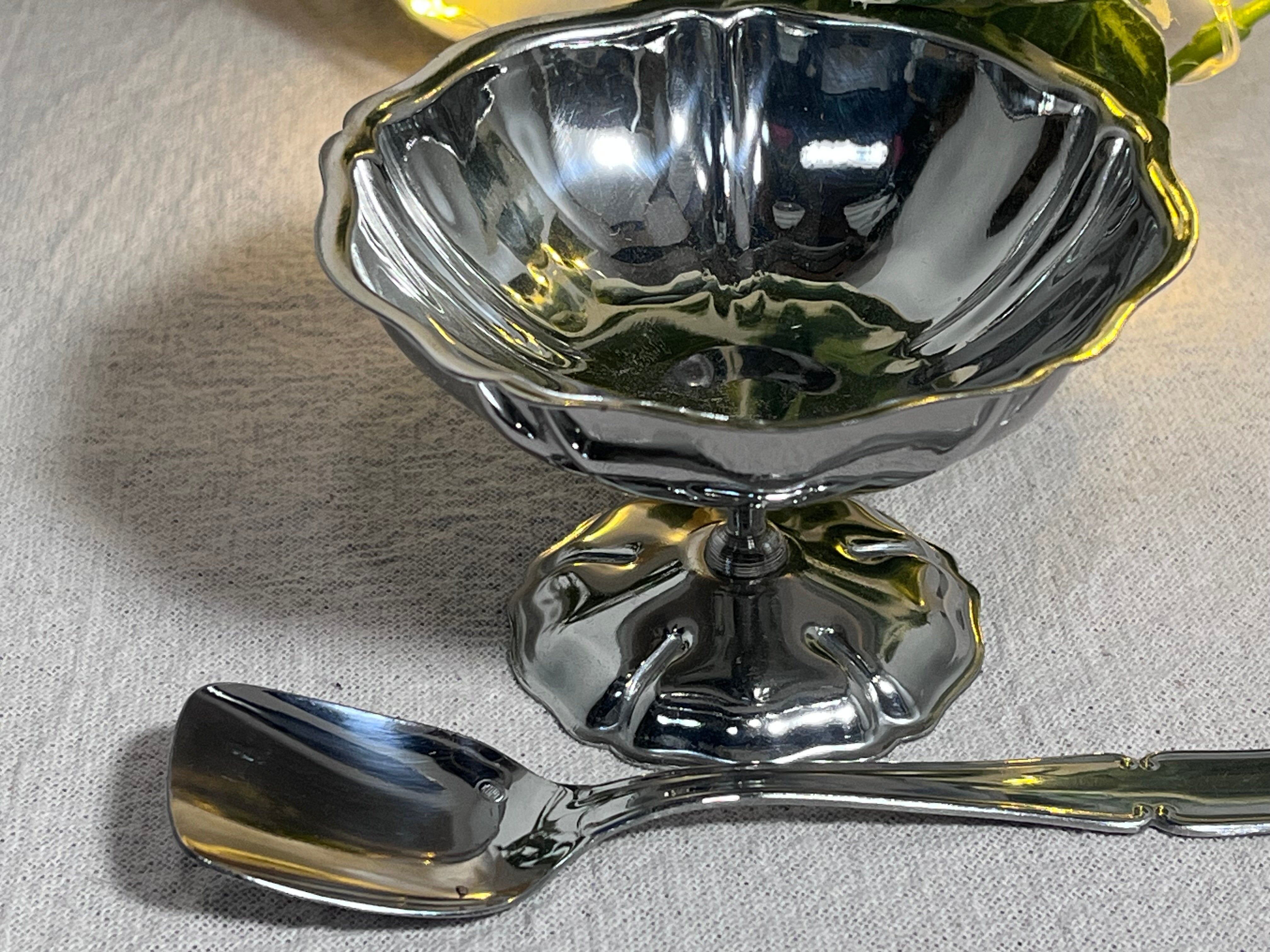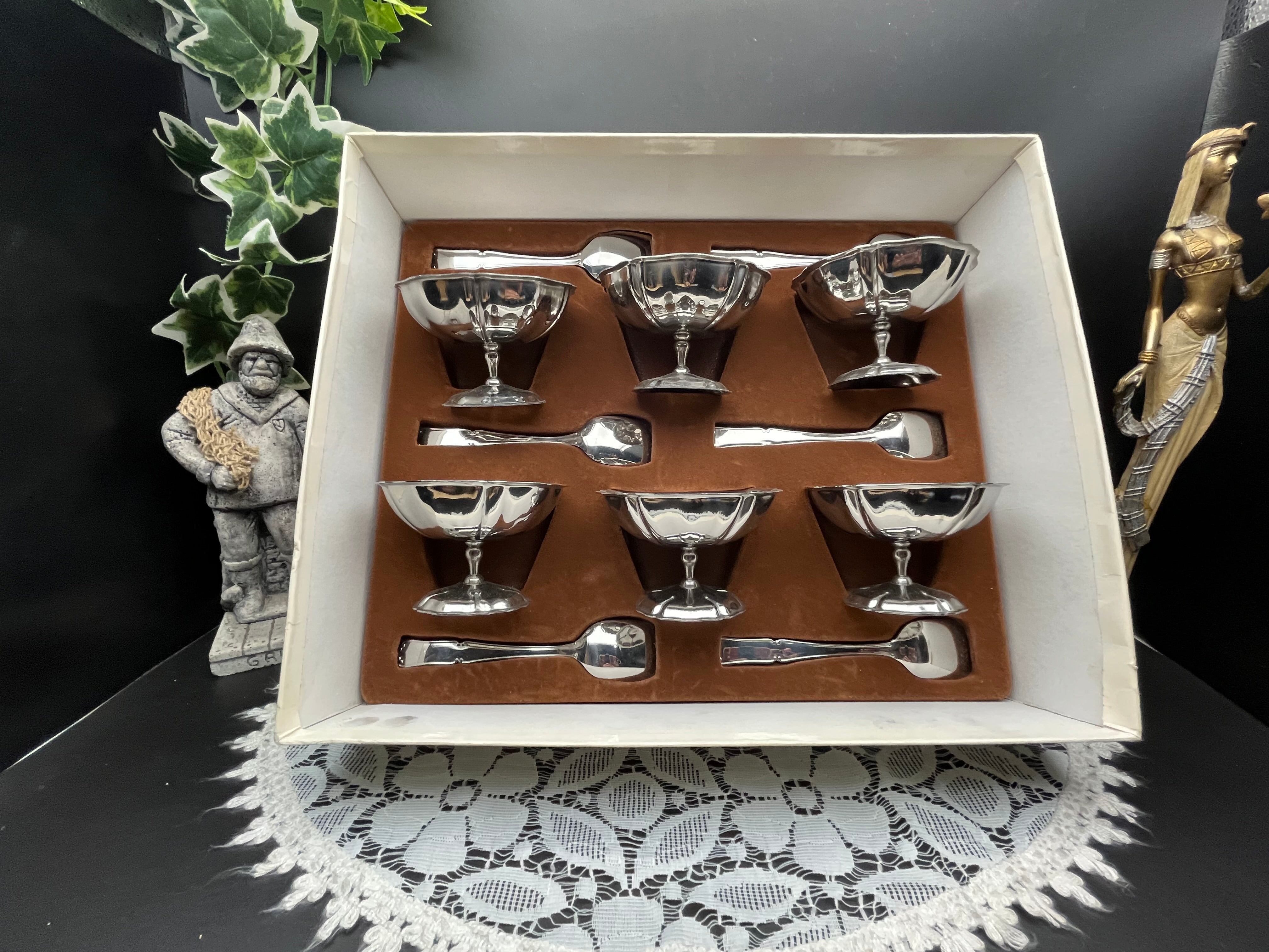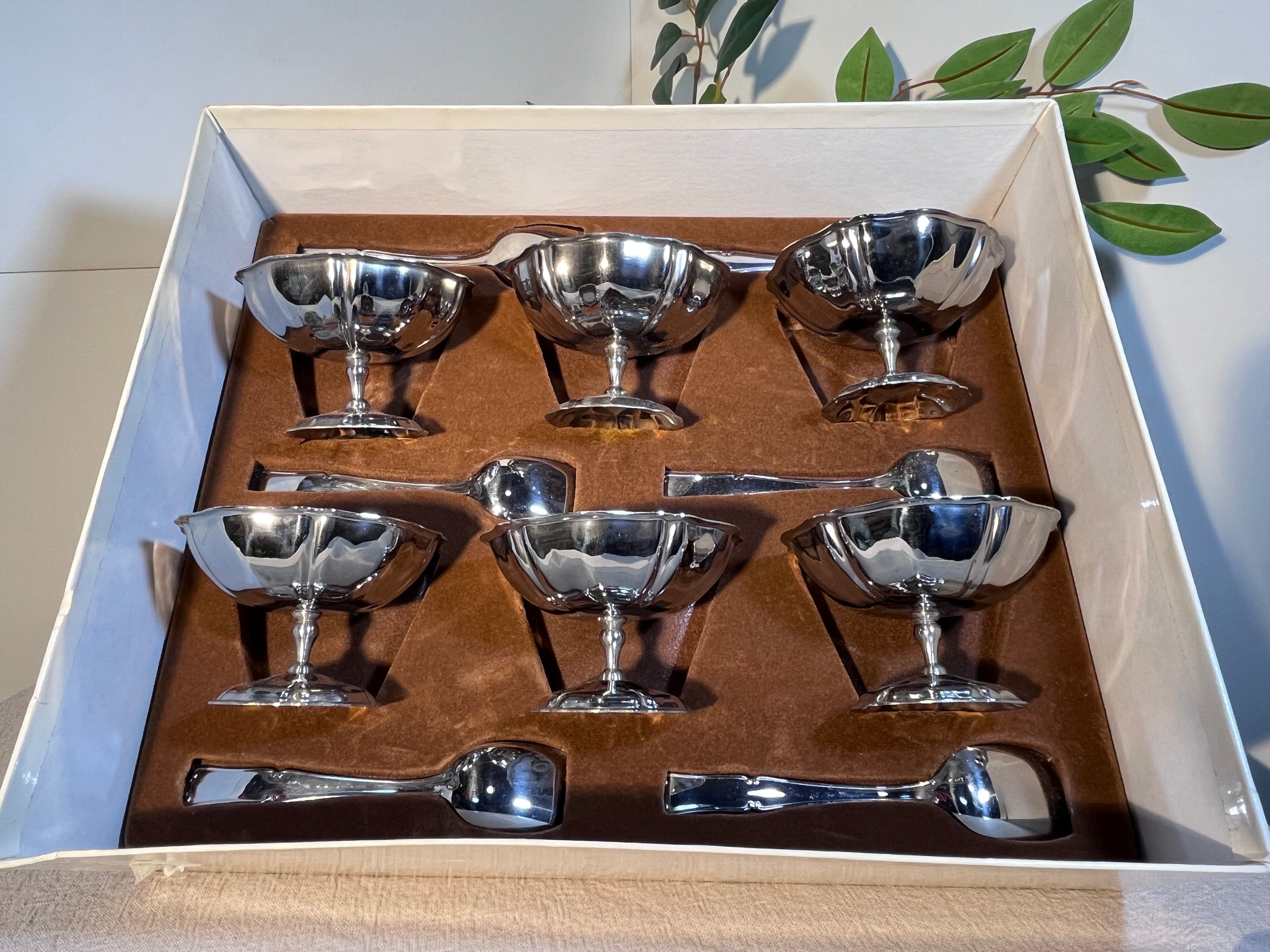 こちらは、ヨーロッパで製造された ヴィンテージのアルミ製アイスクリームカップ 6客セット です。オリジナルの化粧箱に収められ、各カップには専用スプーンが付属しています。