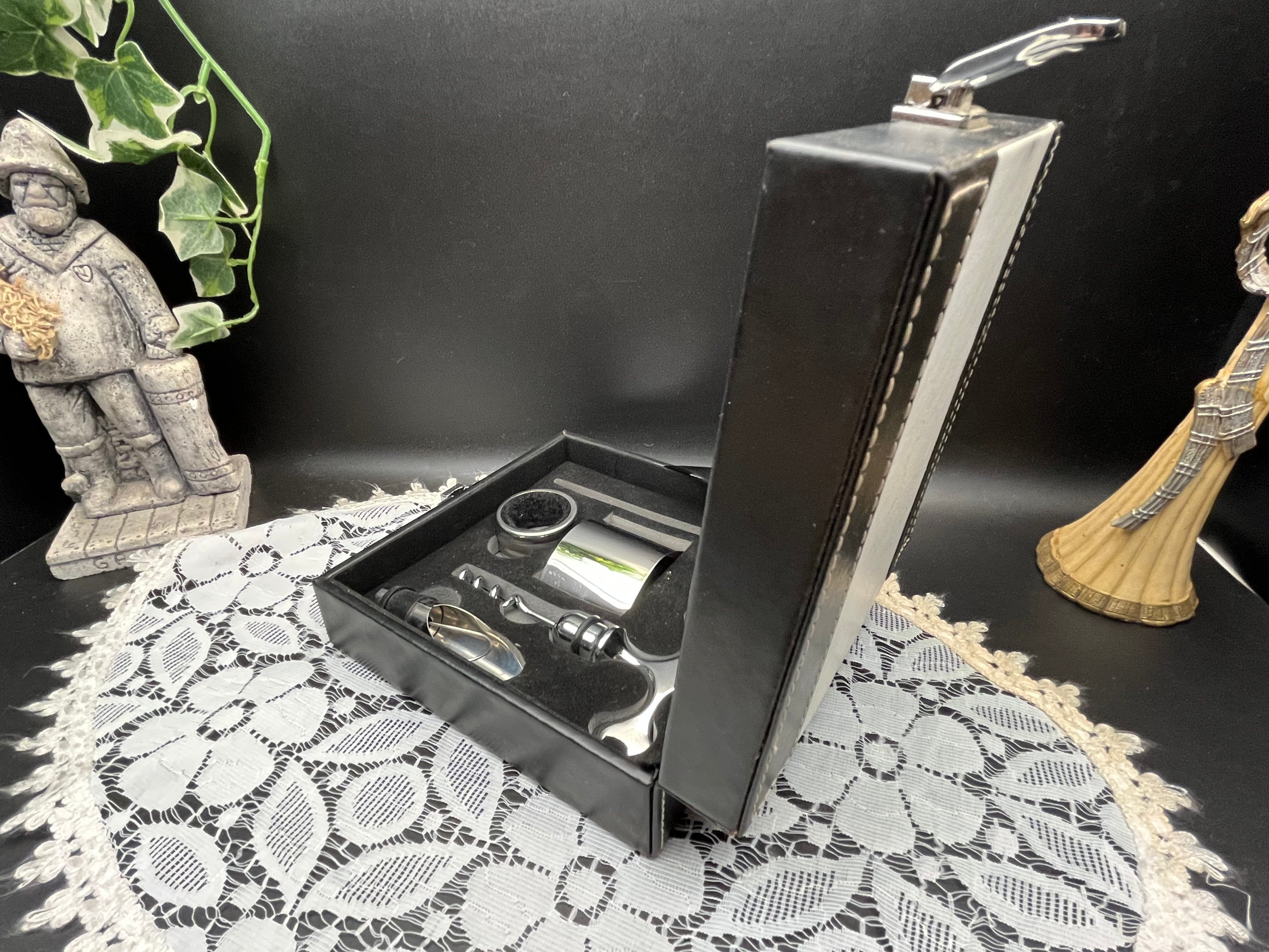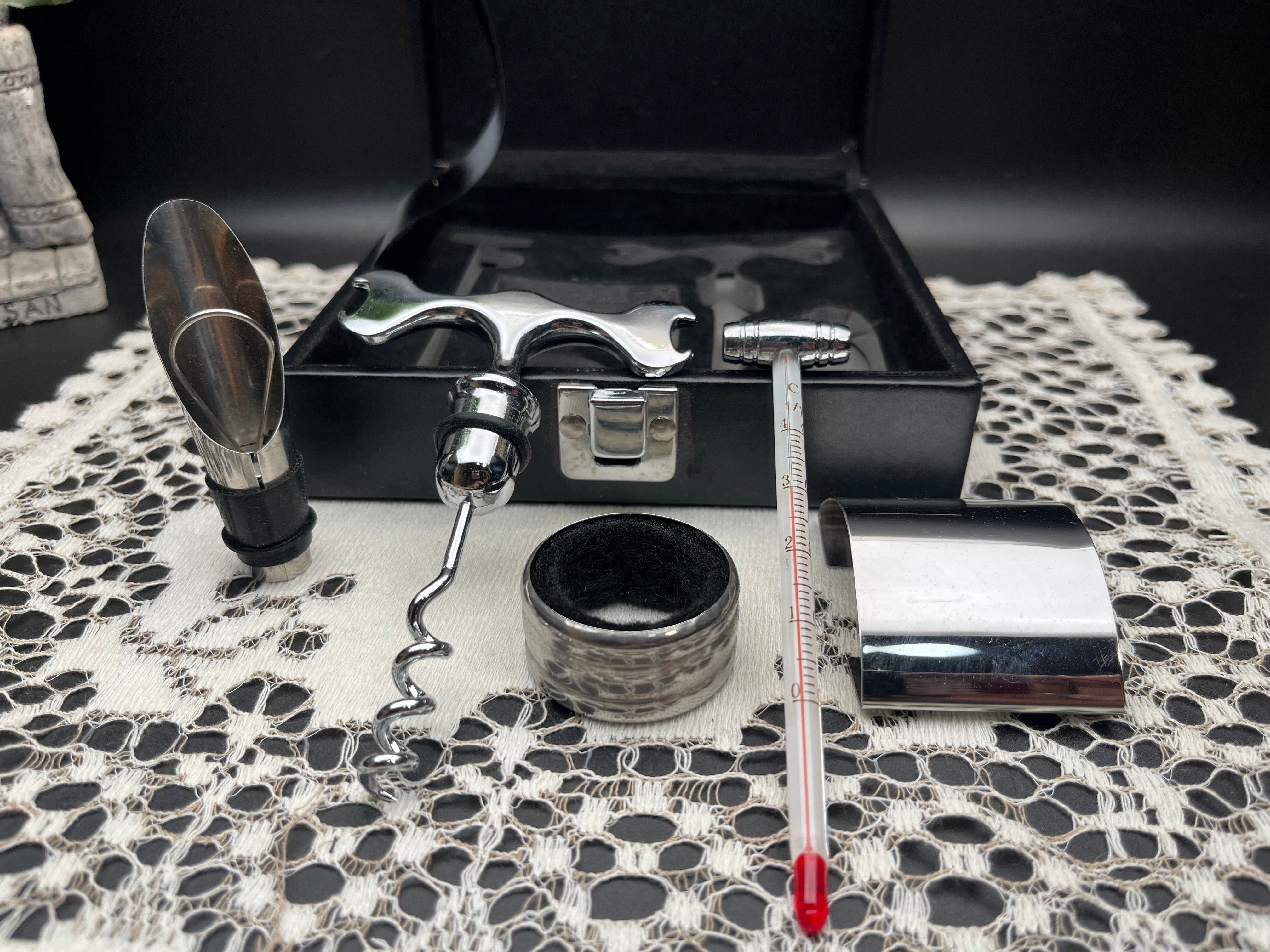 こちらは、ワインをより美味しく楽しむためのアクセサリーを揃えたソムリエセットです。黒のケースに収められ、ギフトやホームパーティ用としてもぴったりのアイテムです。