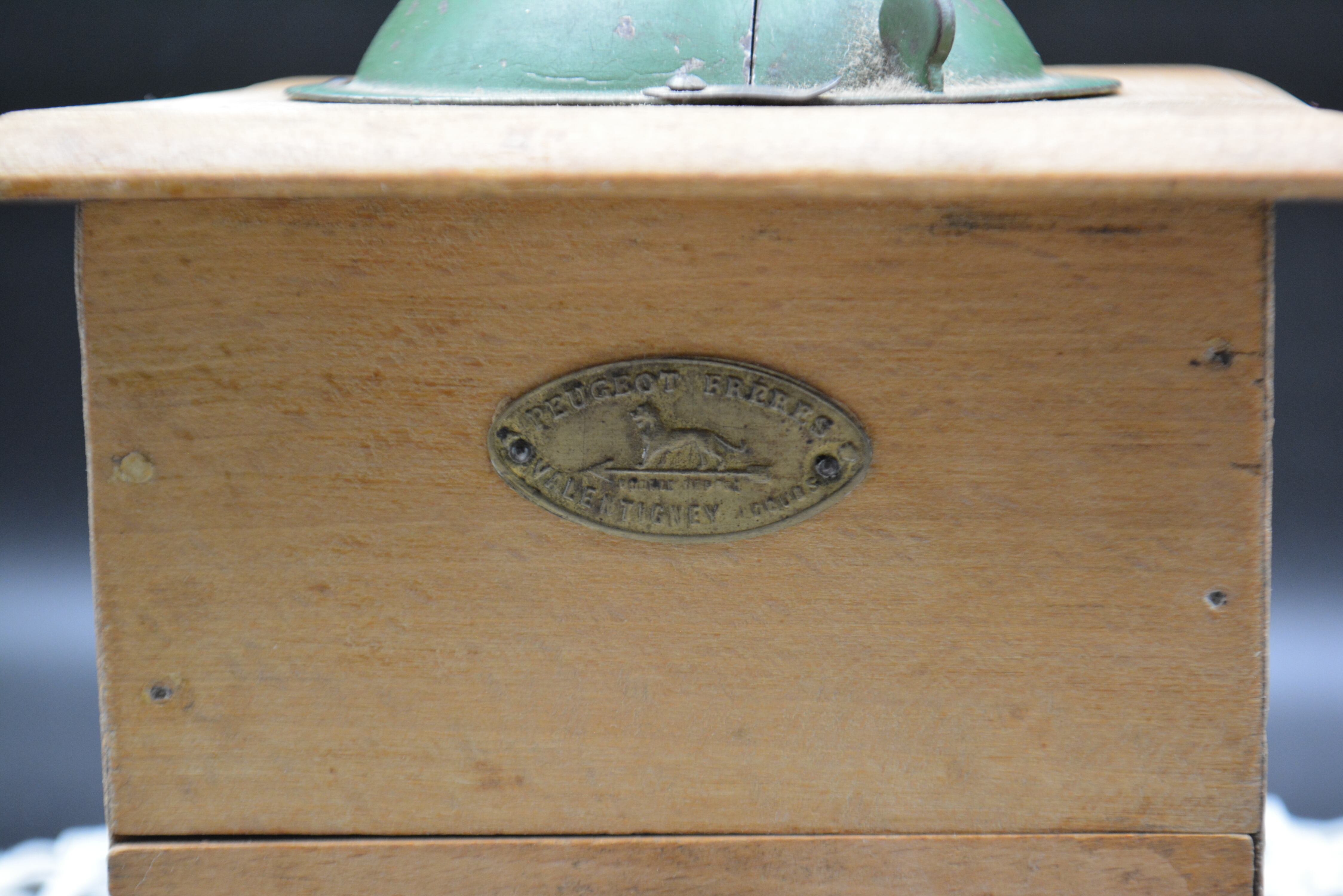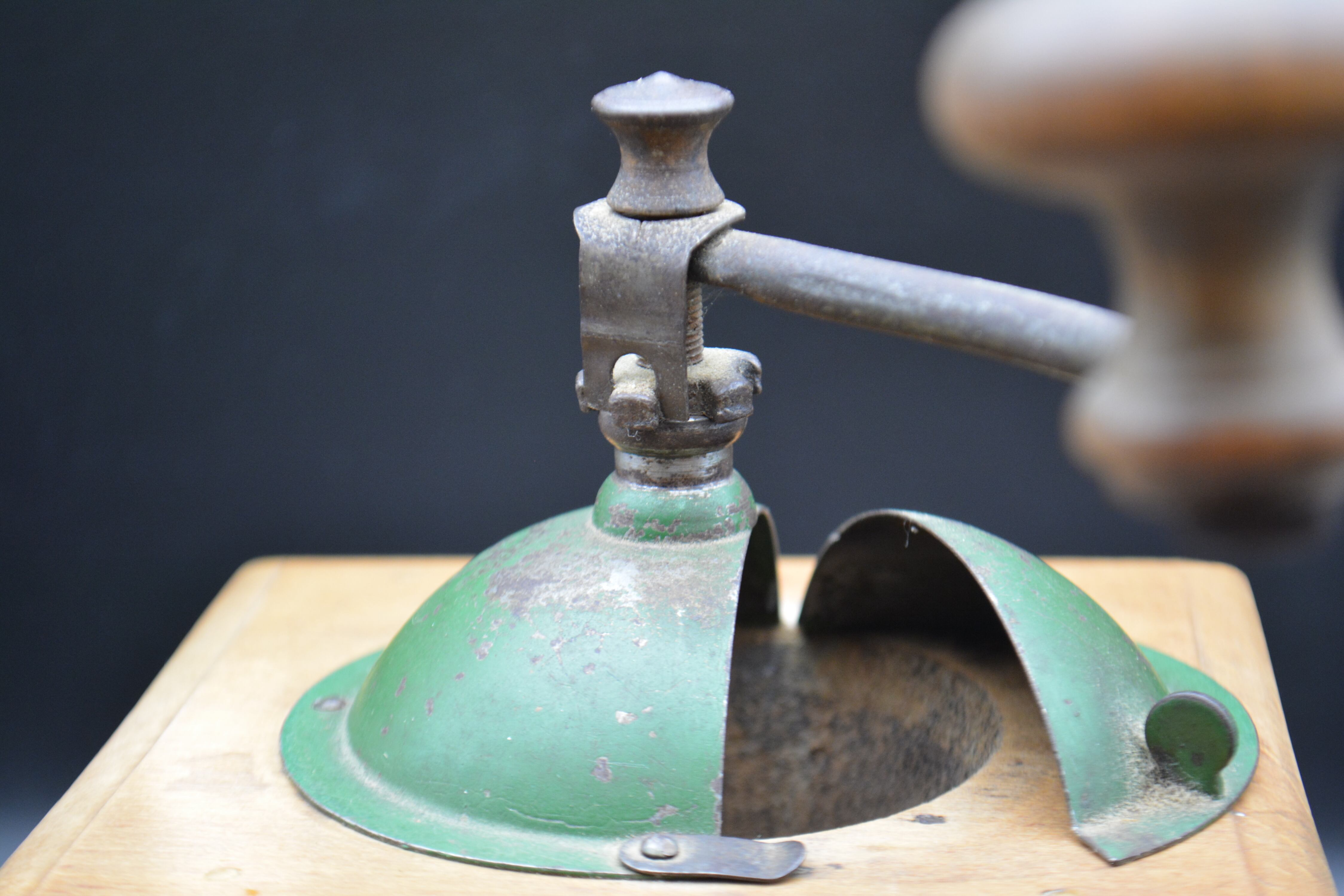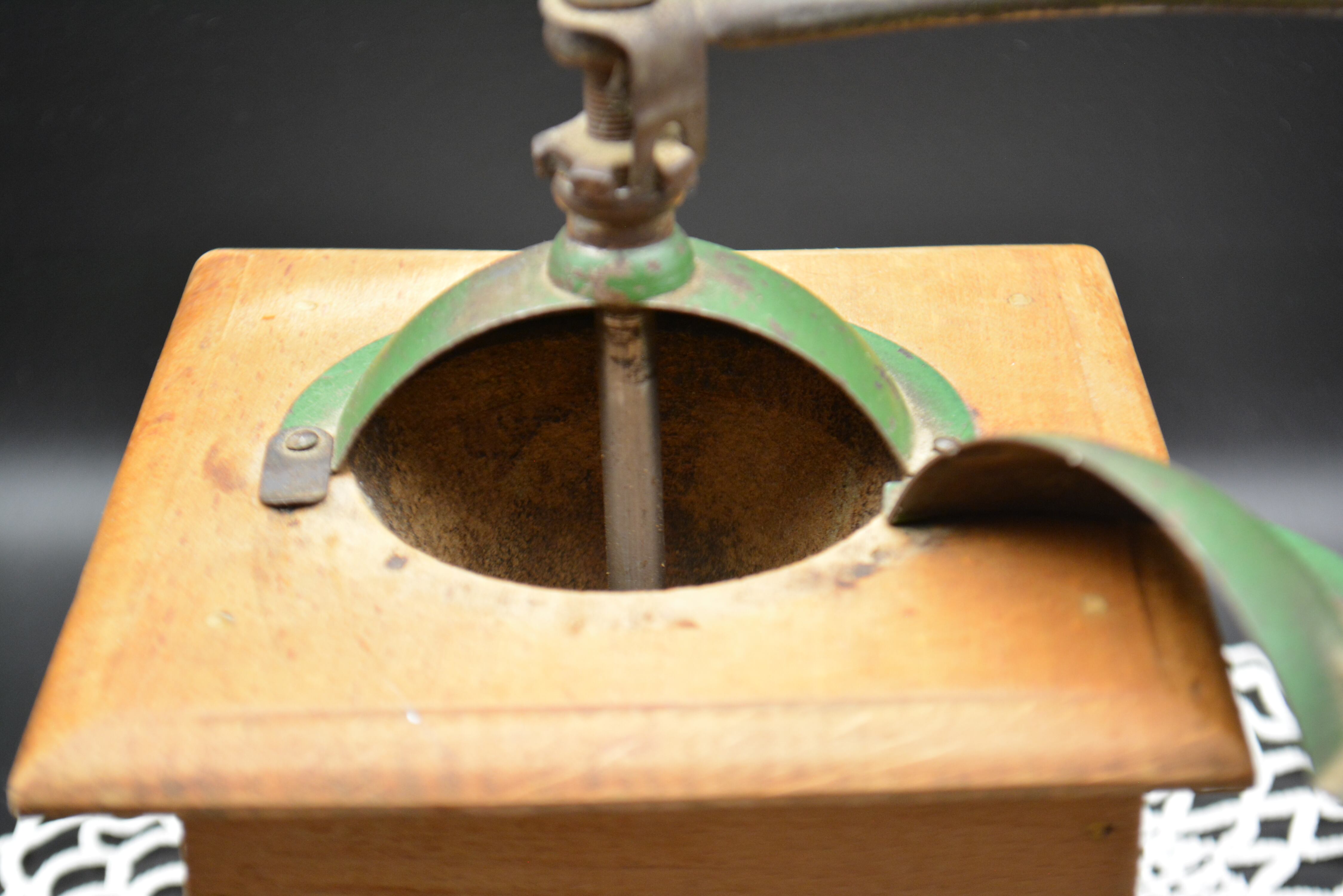 木製ボディにグリーンカラーの金属ホッパーを組み合わせたクラシカルなデザインは、1930年代前後のプジョーミルを代表するスタイル。長い歴史を経た温かみのある木の風合いと、味わい深いペイントの剥がれが、アンティークならではの魅力を感じさせます。