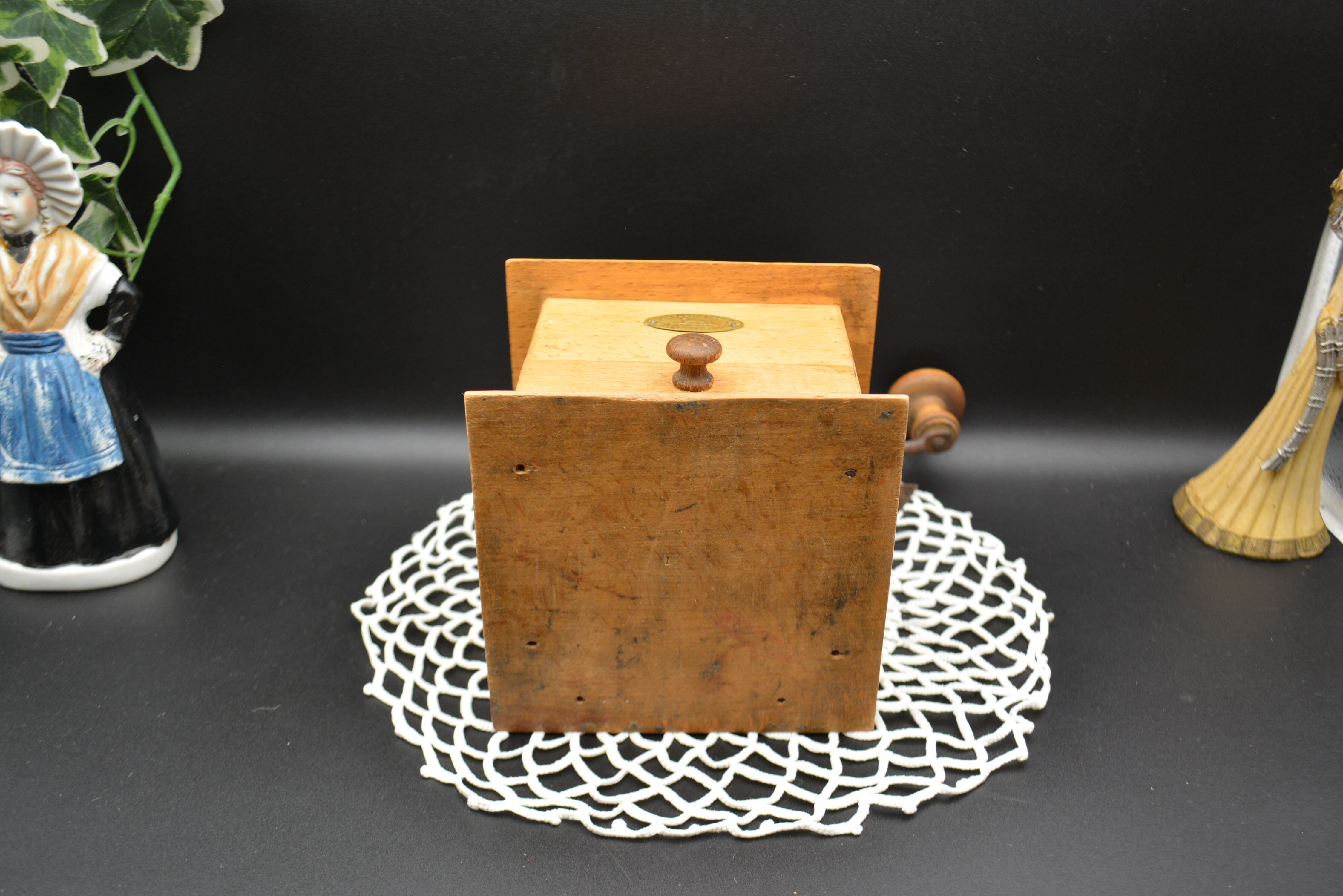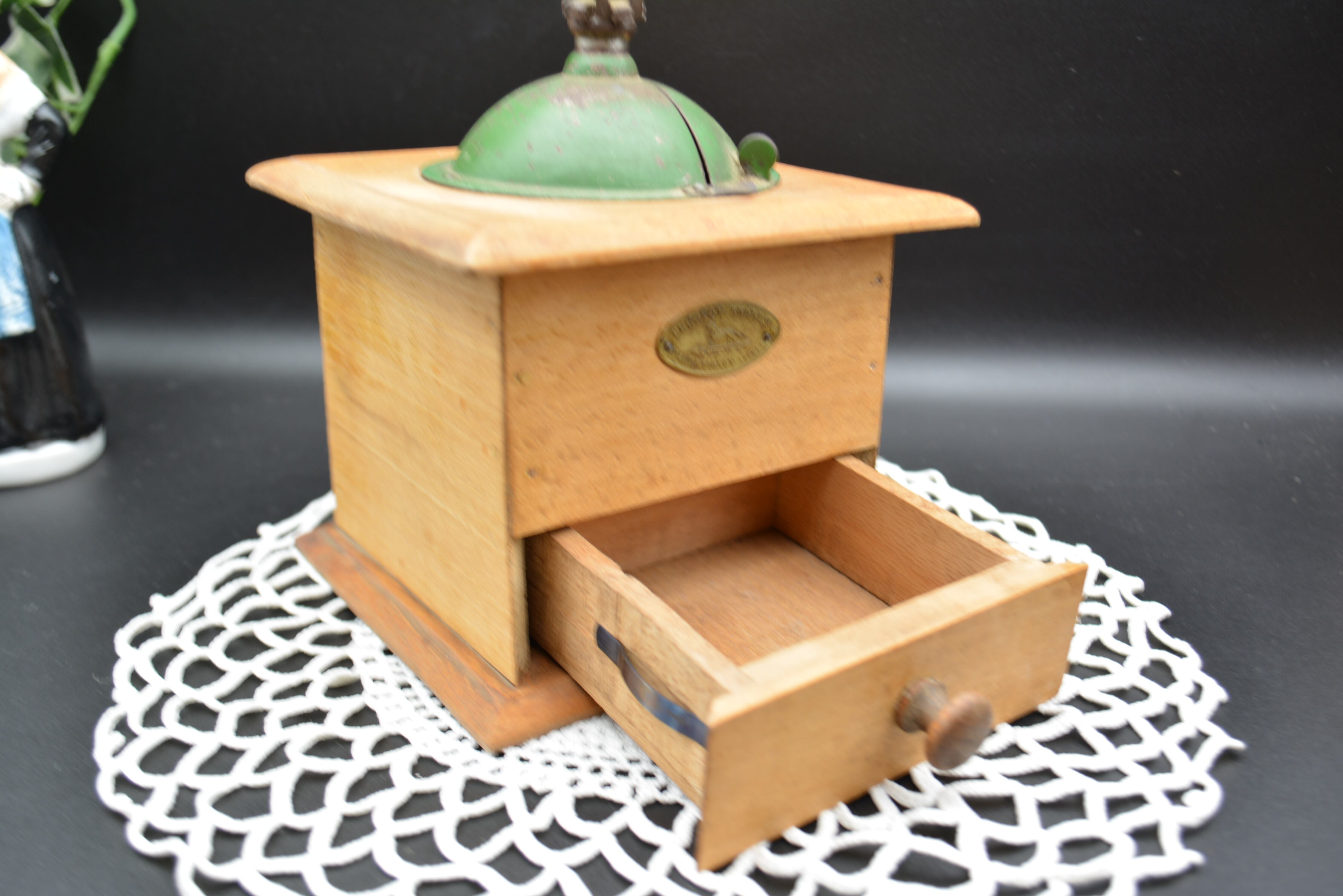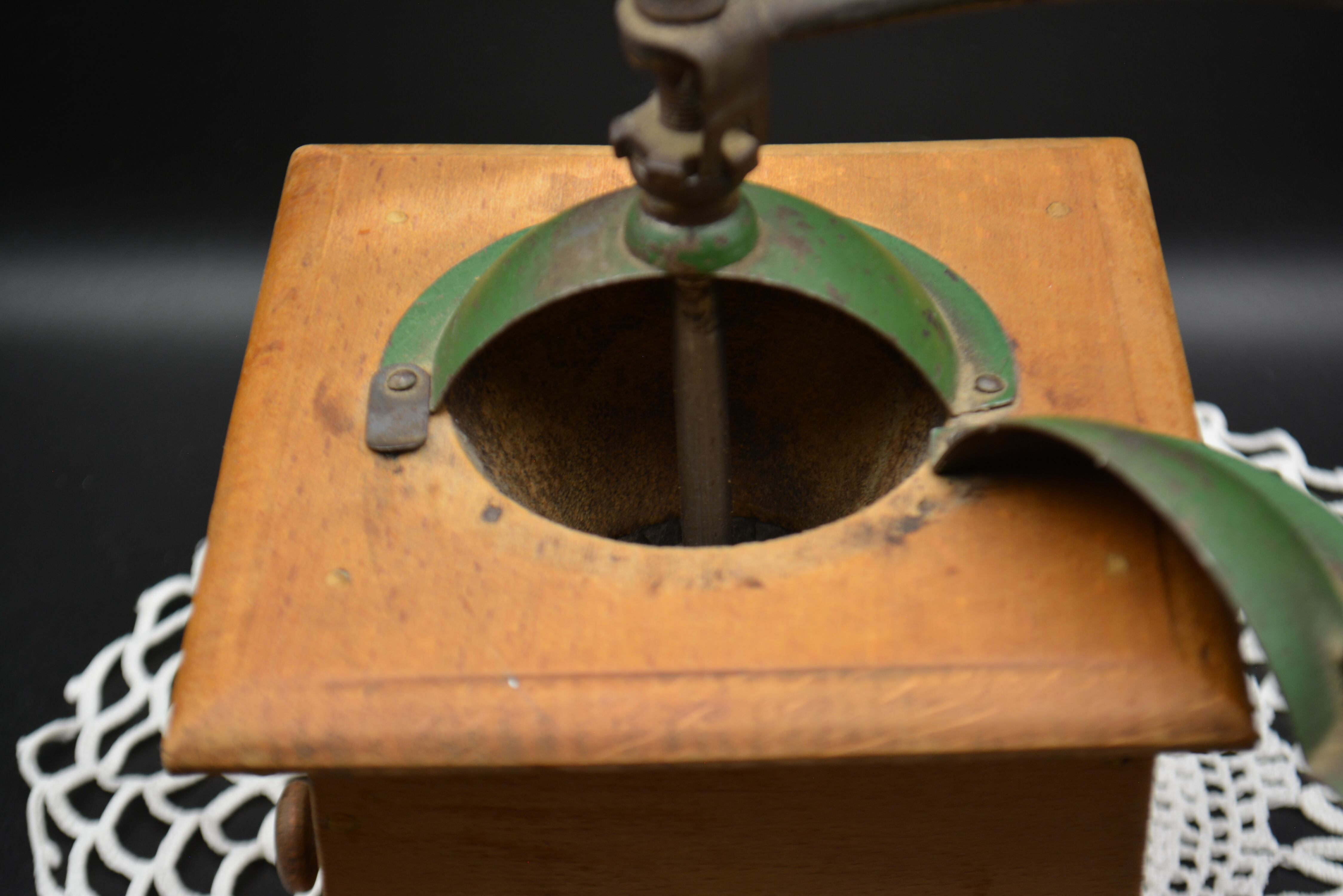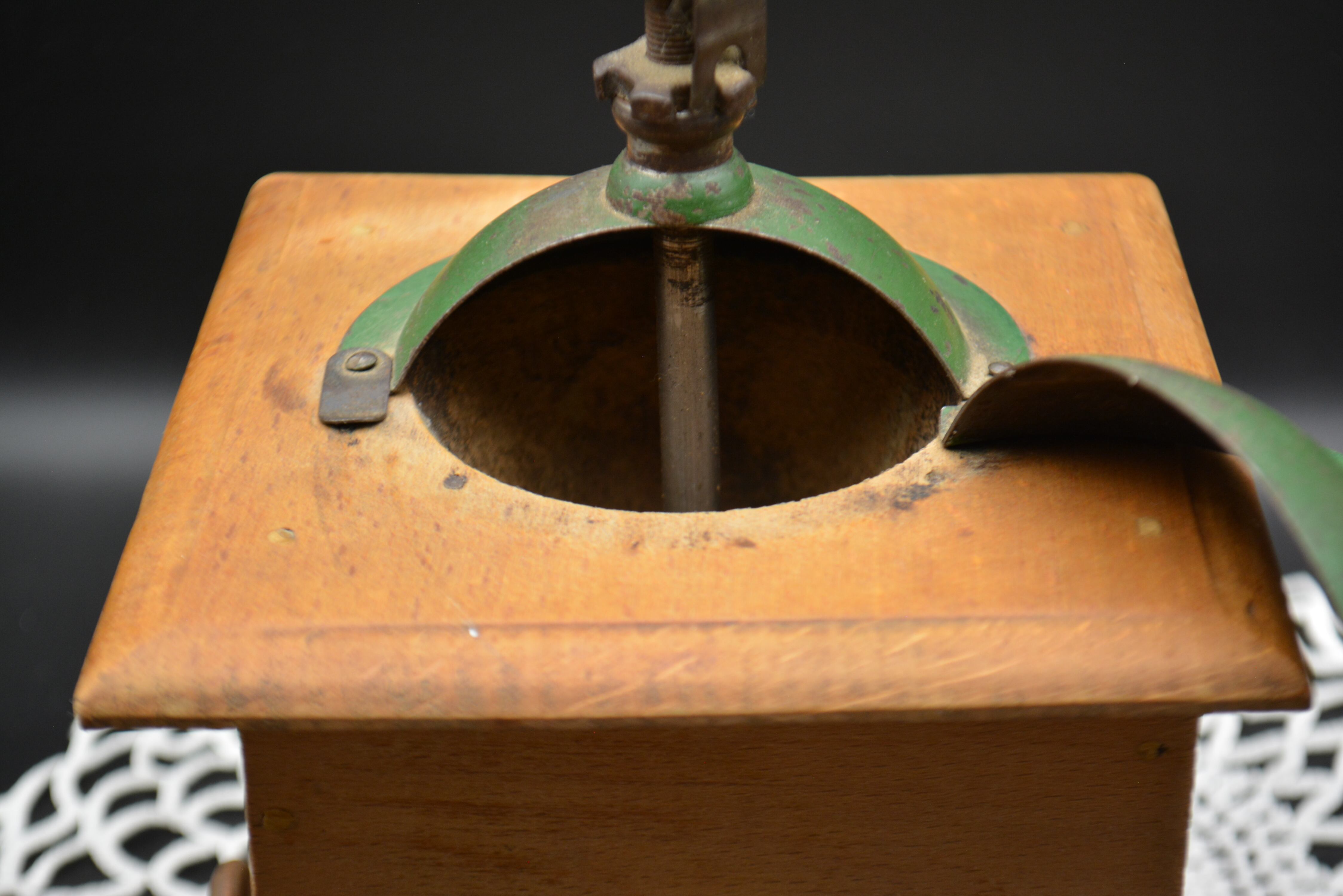 木製ボディにグリーンカラーの金属ホッパーを組み合わせたクラシカルなデザインは、1930年代前後のプジョーミルを代表するスタイル。長い歴史を経た温かみのある木の風合いと、味わい深いペイントの剥がれが、アンティークならではの魅力を感じさせます。