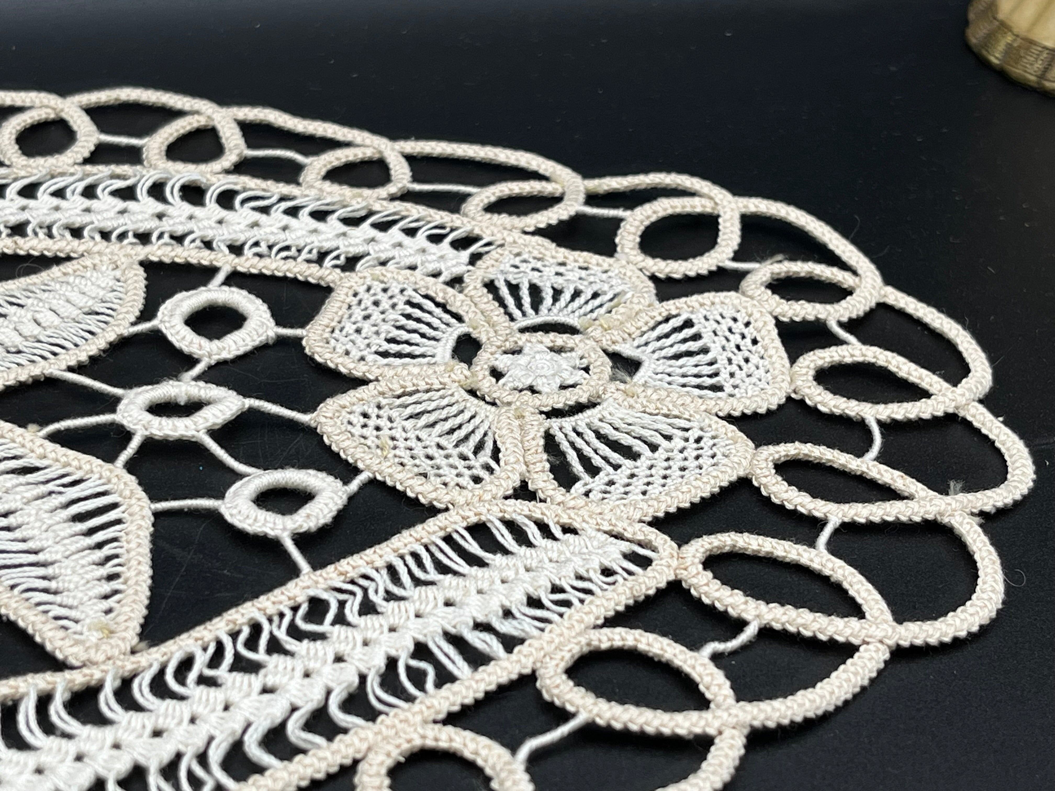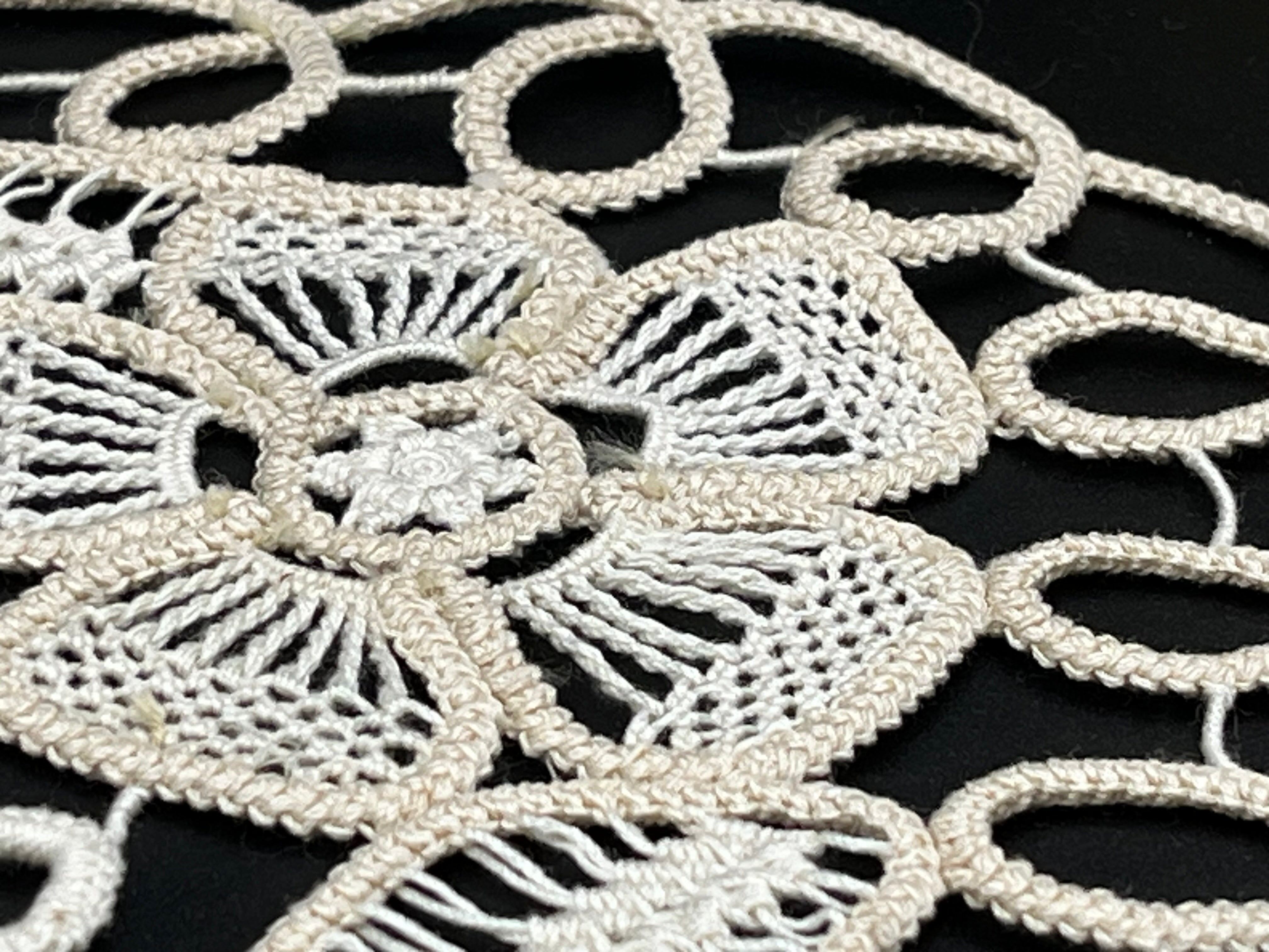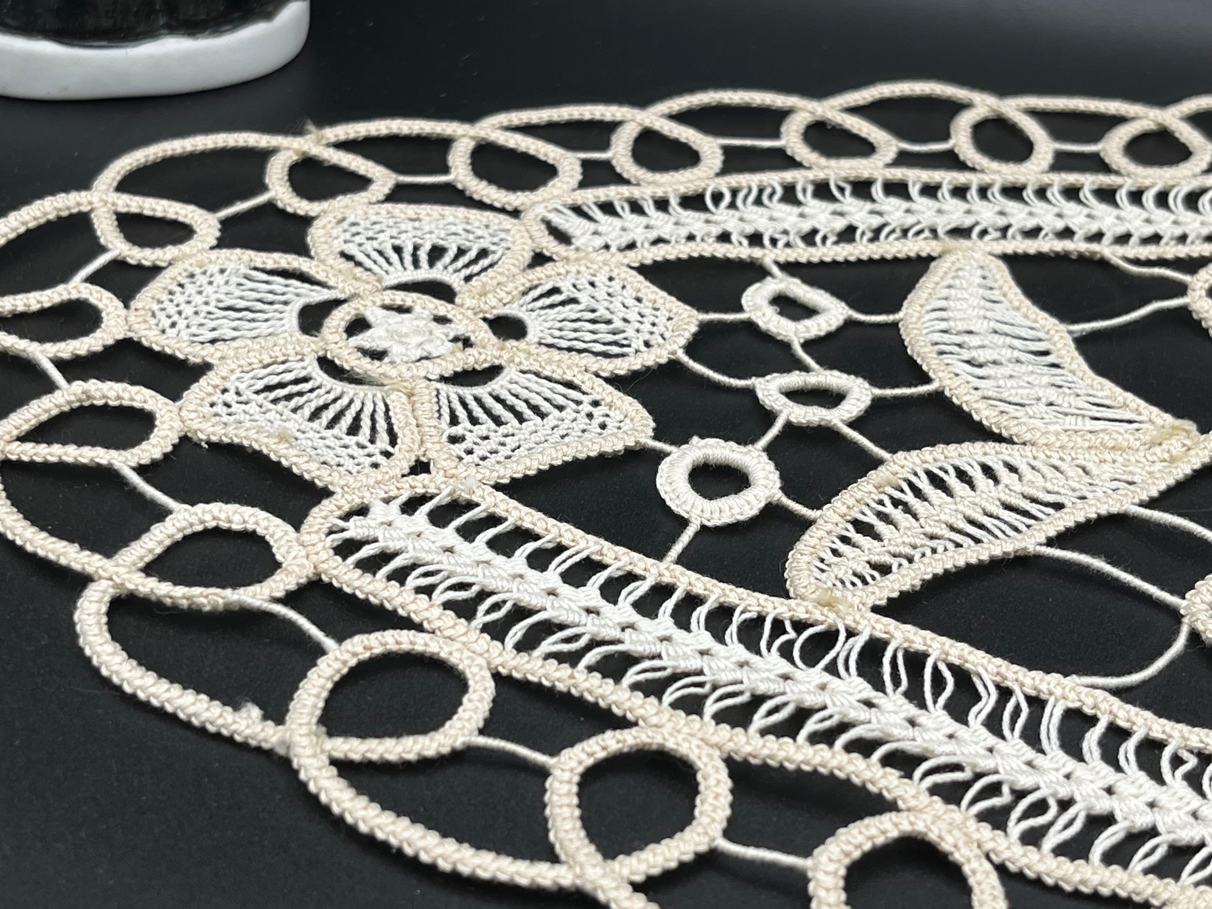 こちらは、フランスやベルギーを中心に20世紀前半に制作されたとみられる 手編みのクロシェレース・ドイリー です。花とリーフモチーフを丁寧に編み込み、縁取りには大きな輪を連ねたデザインが施されています。透かし模様が美しく、テーブルセンターピースとしてはもちろん、花瓶やアンティーク雑貨との相性も抜群です。