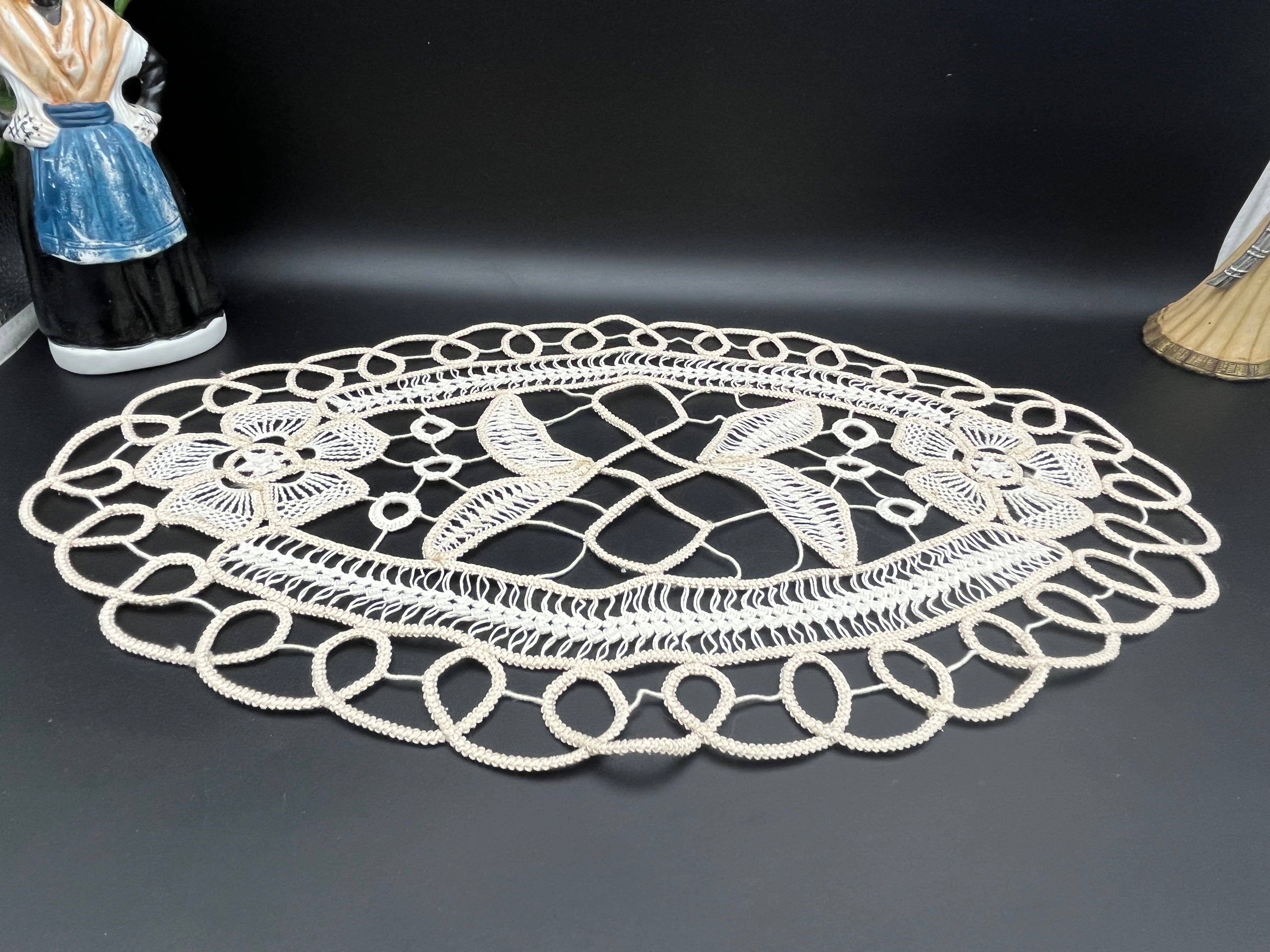 フランスアンティーク クロシェレース 花とリーフモチーフ楕円形ドイリー