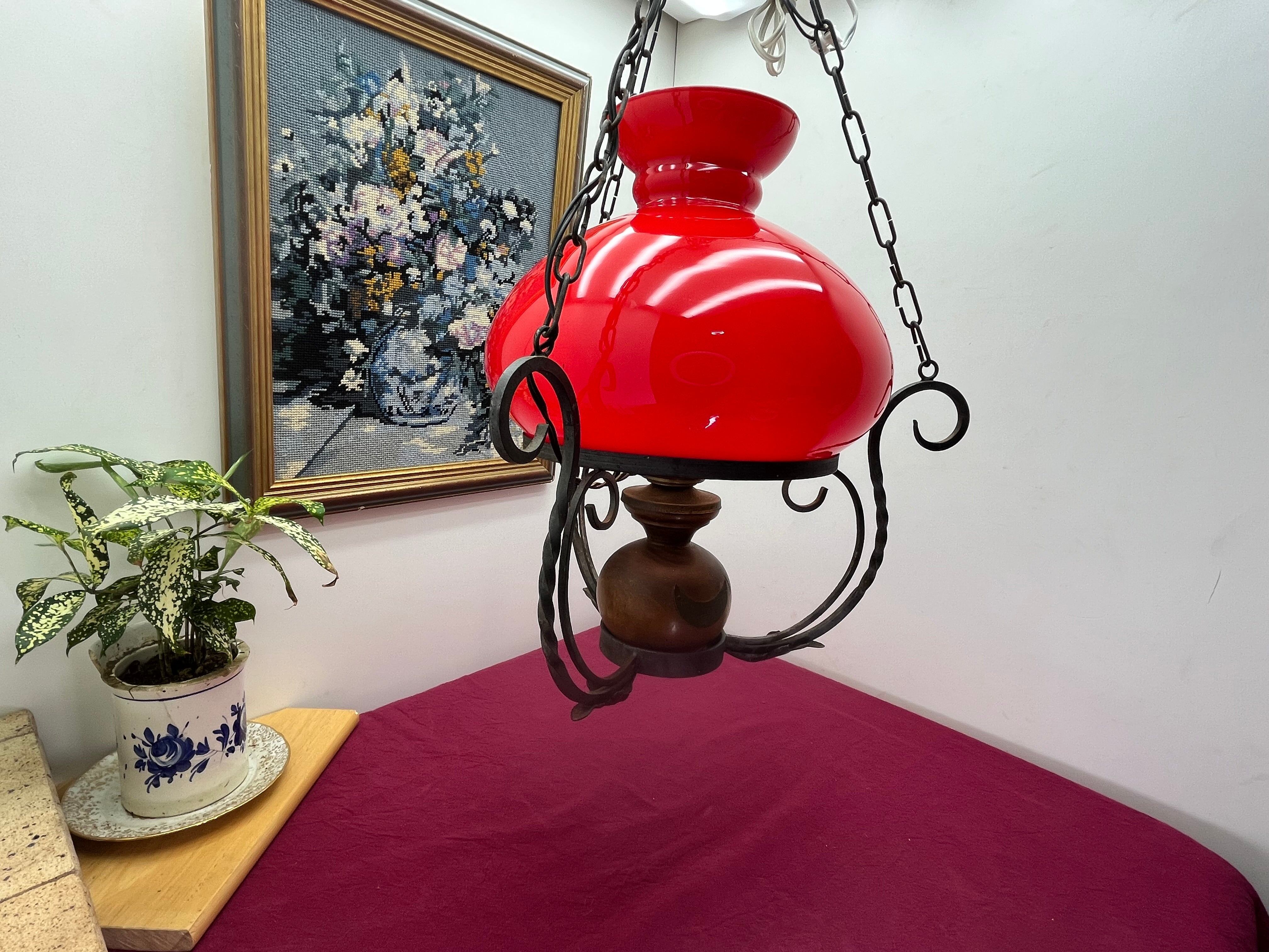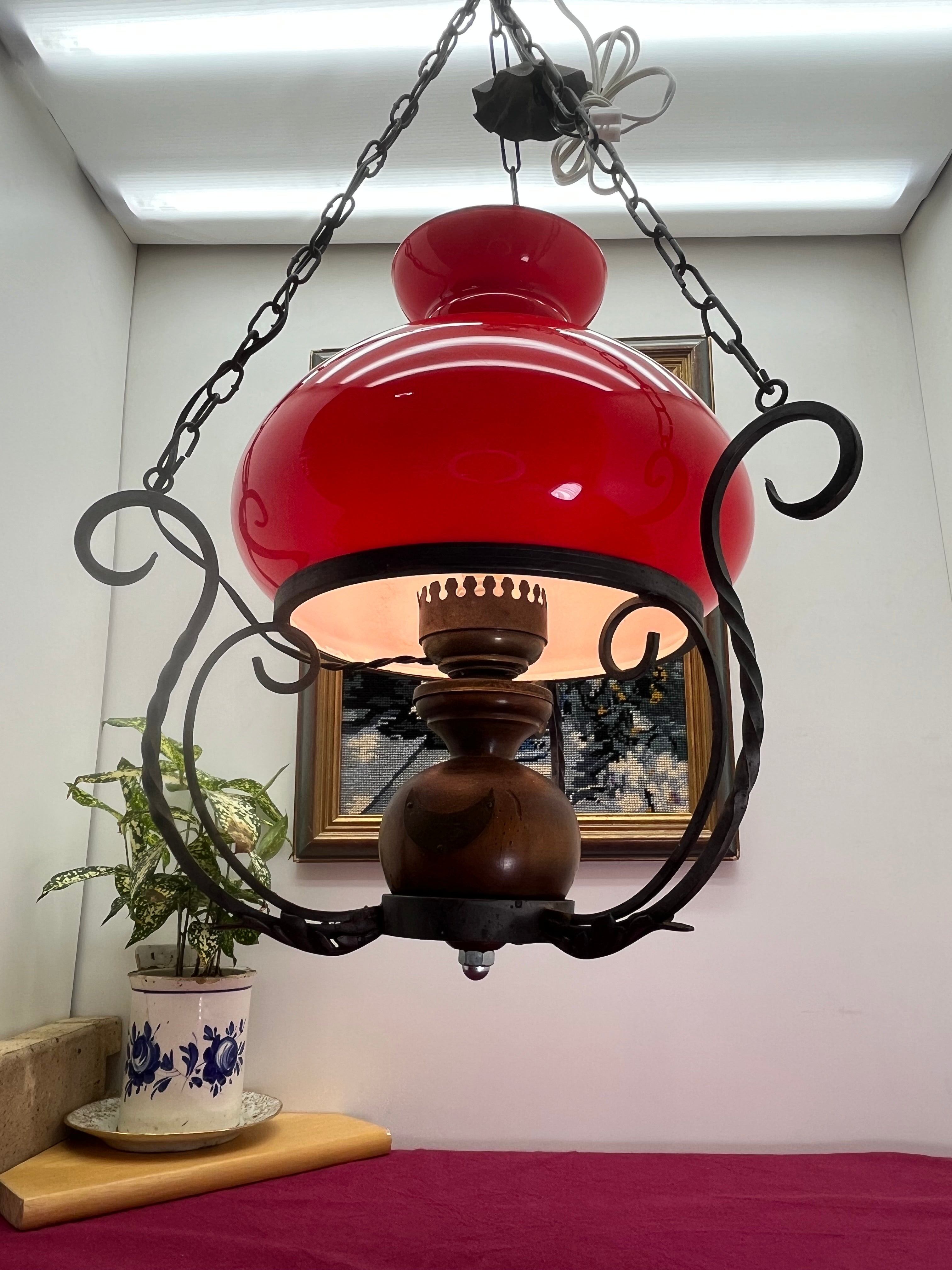 貴重なアンティークレッドガラス アイアンウッド装飾 ペンダントライト