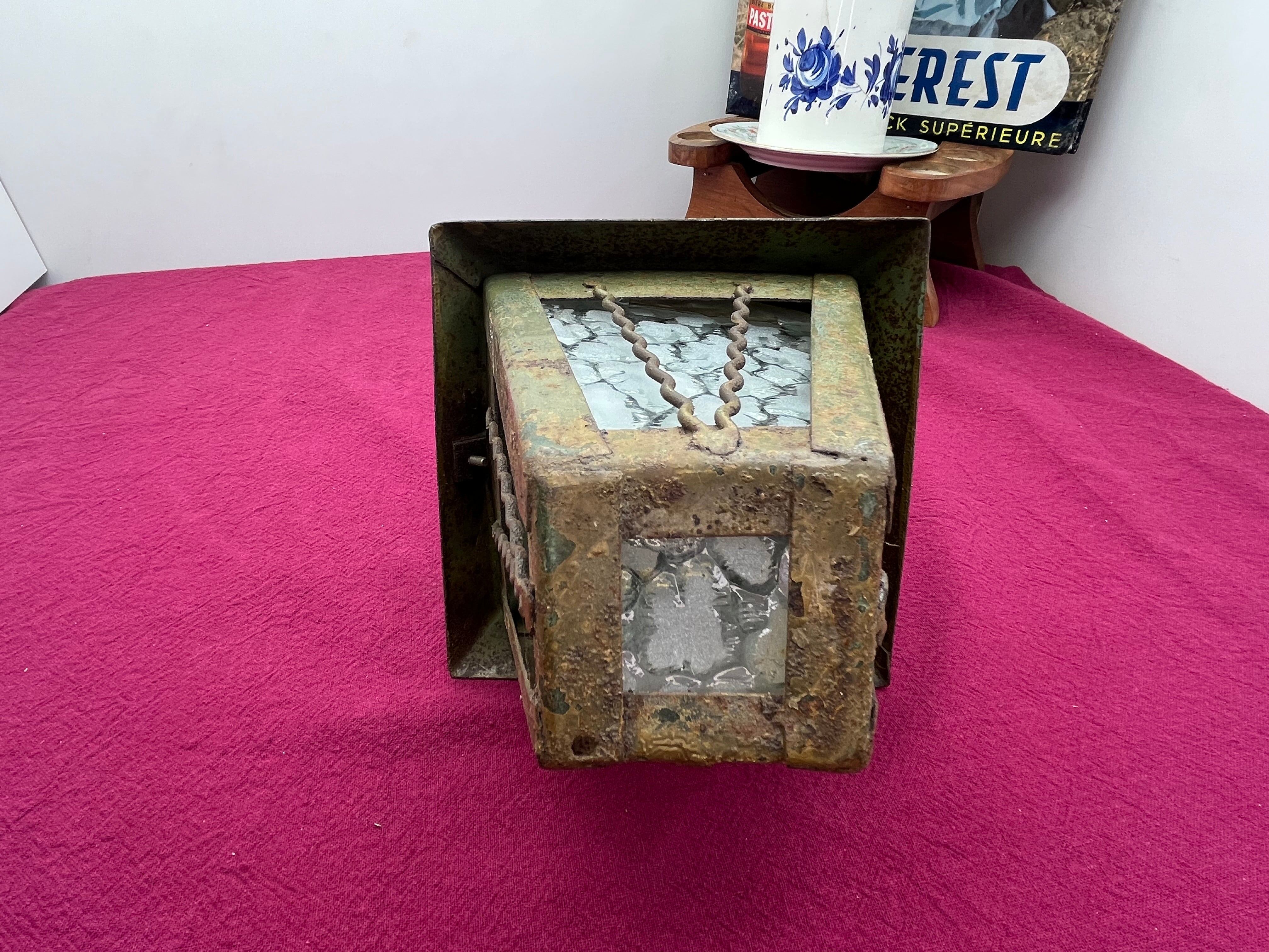 重厚なアイアンフレームに、アンティーク調の波模様入りガラスを組み合わせたデザインが特徴。トップには「錨(いかり)」モチーフの装飾が施され、まるでヨーロッパの古い灯台や船小屋にあったようなノスタルジックな佇まいです。