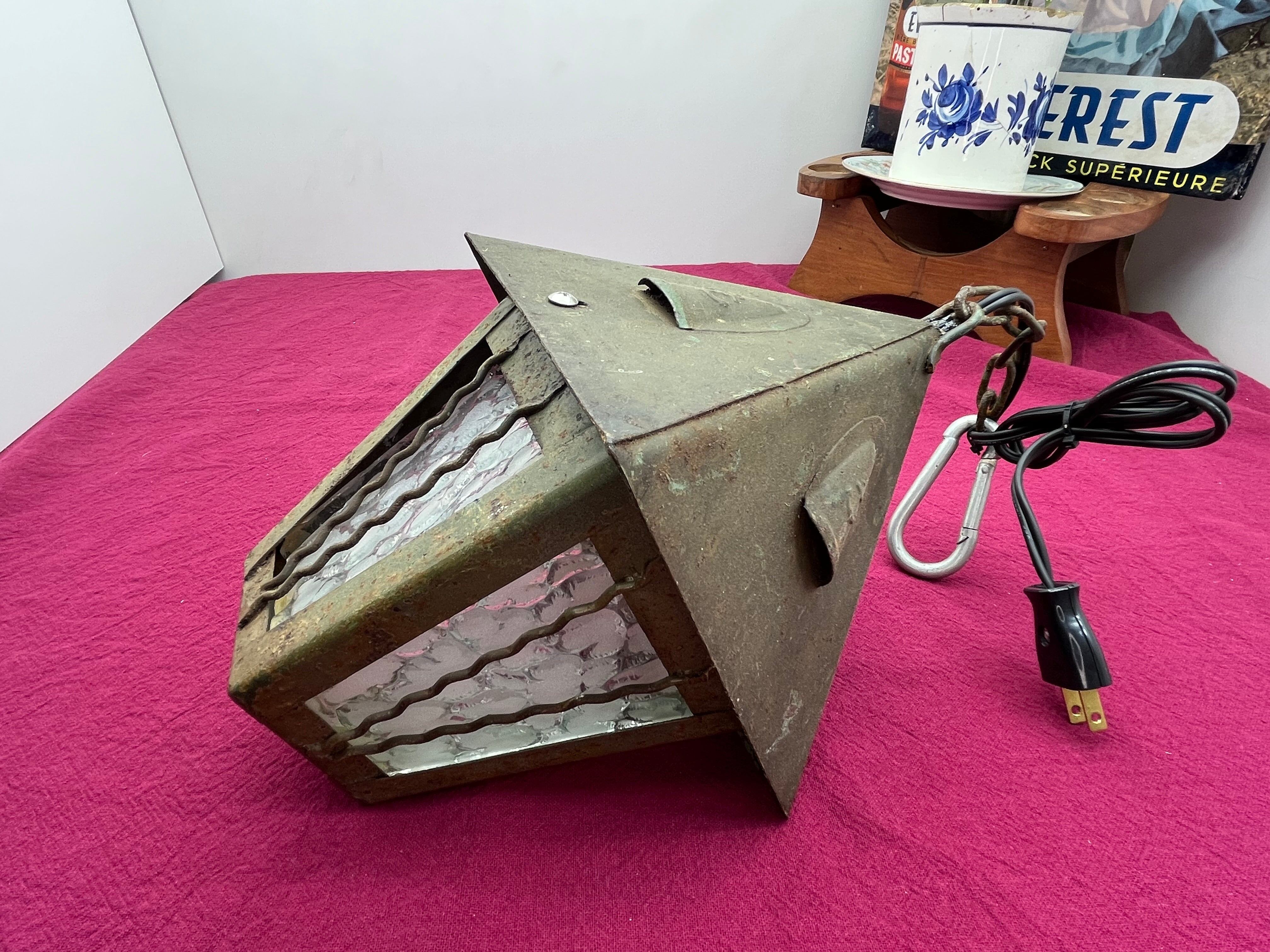 経年による錆とくすみが、むしろこのランプの魅力を引き立てており、インダストリアルスタイルやブロカント系インテリアとの相性は抜群です。