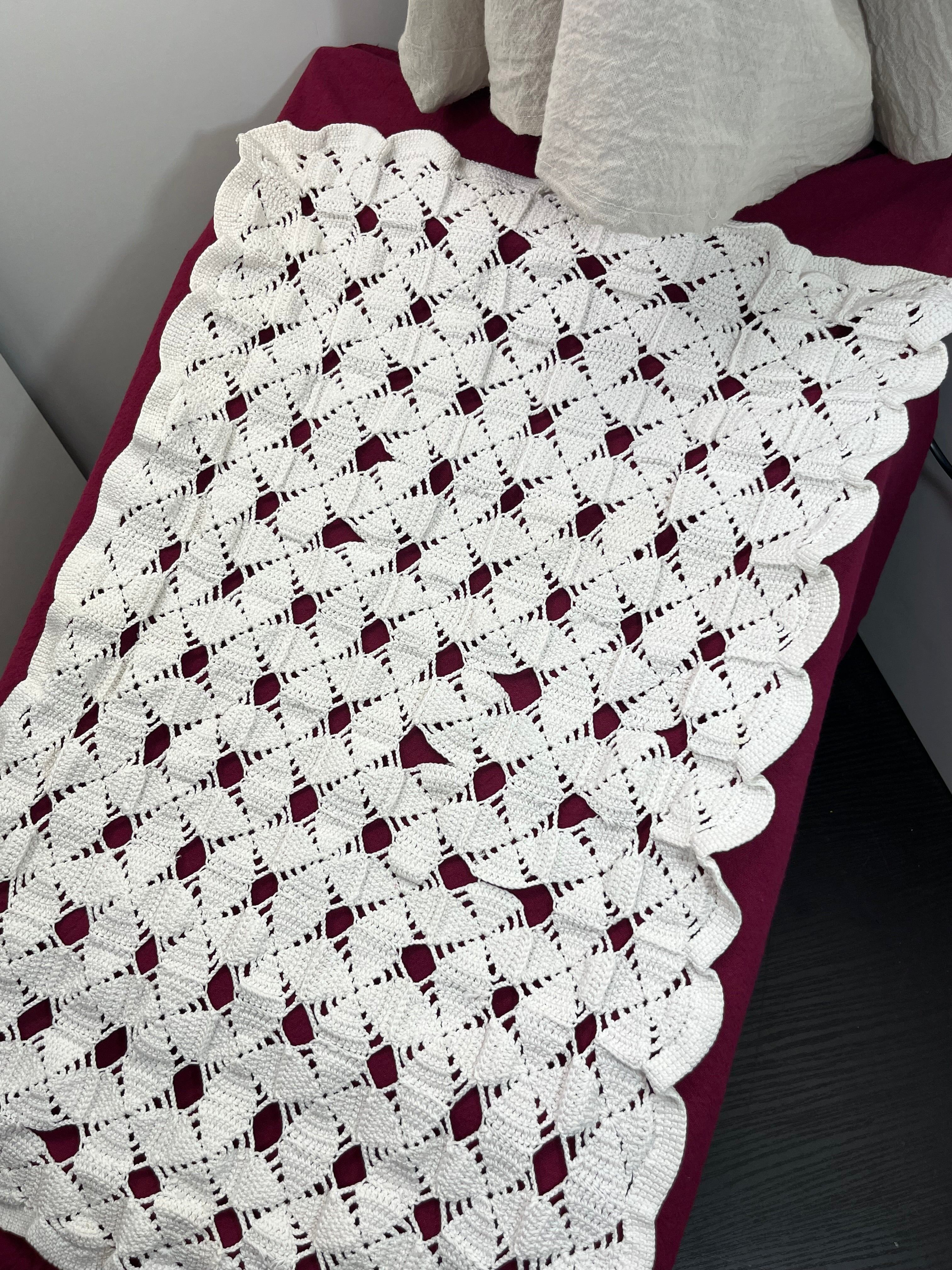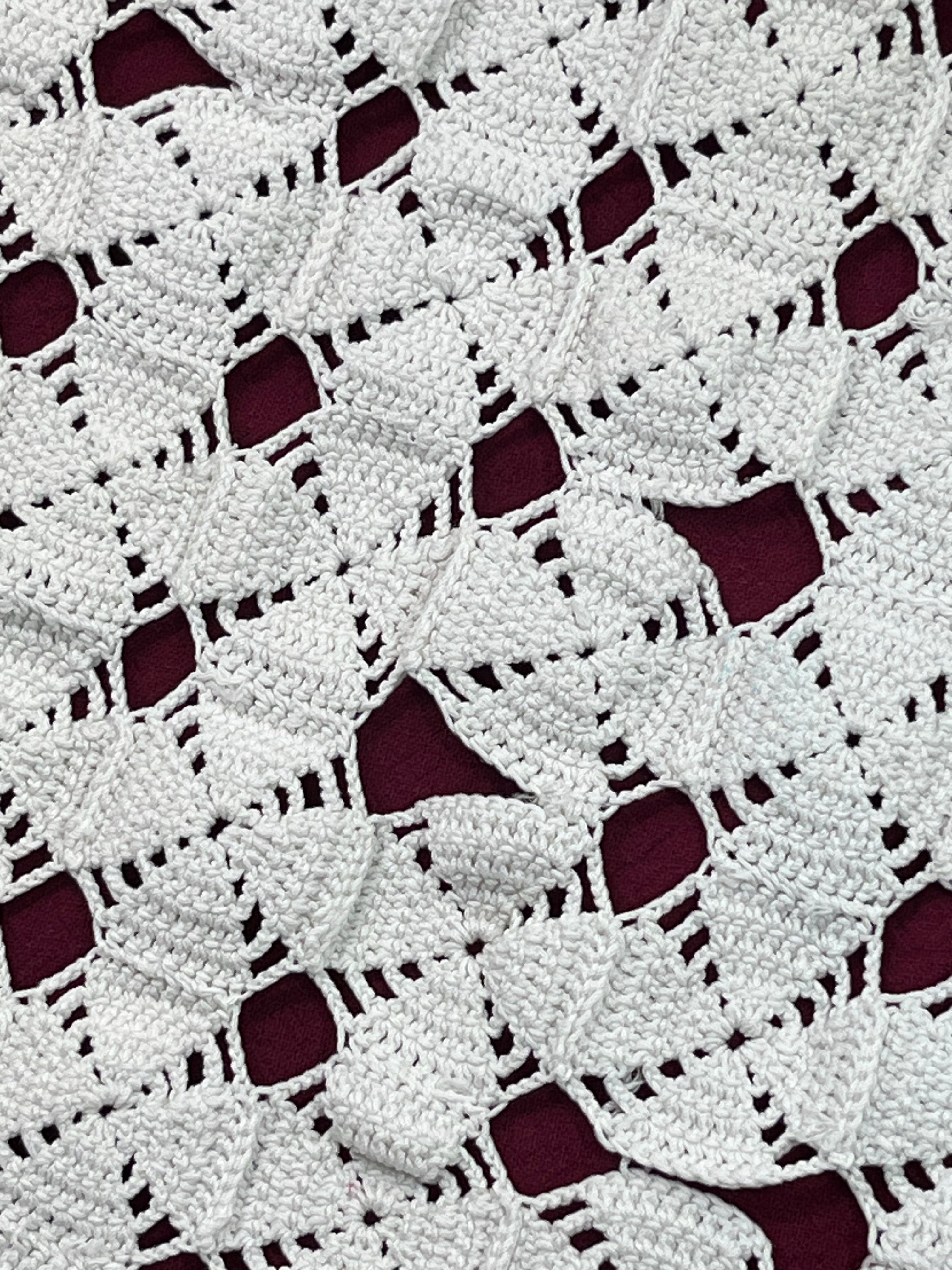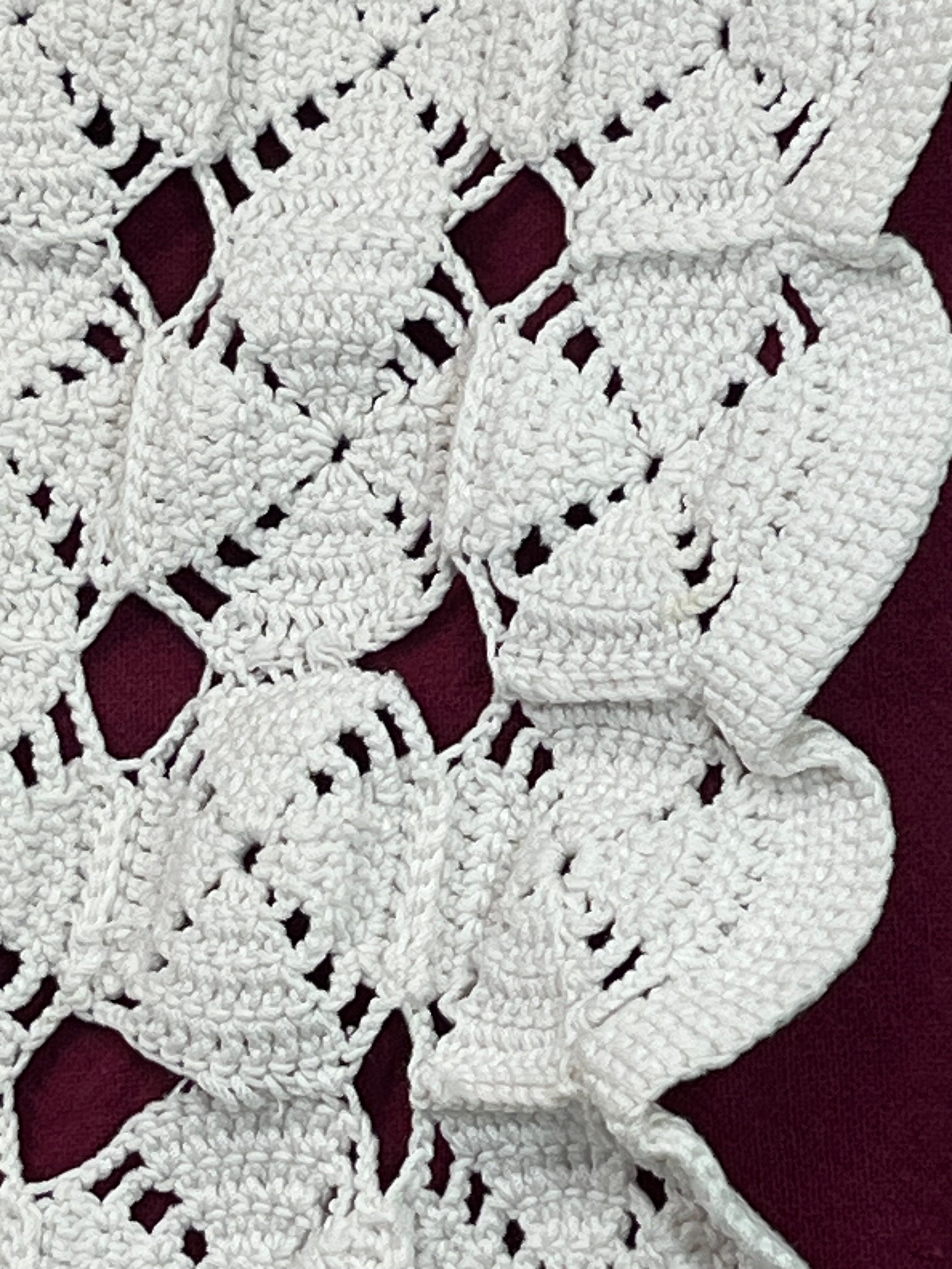 繊細で立体感のある編み模様が美しい、手編みアンティークレースのテーブルランナーです。上質なコットン糸を丁寧に編み上げ、規則的な幾何学模様が柔らかな陰影を生み出します。清潔感のあるホワイトカラーは、アンティーク食器や花瓶、雑貨との相性も抜群。