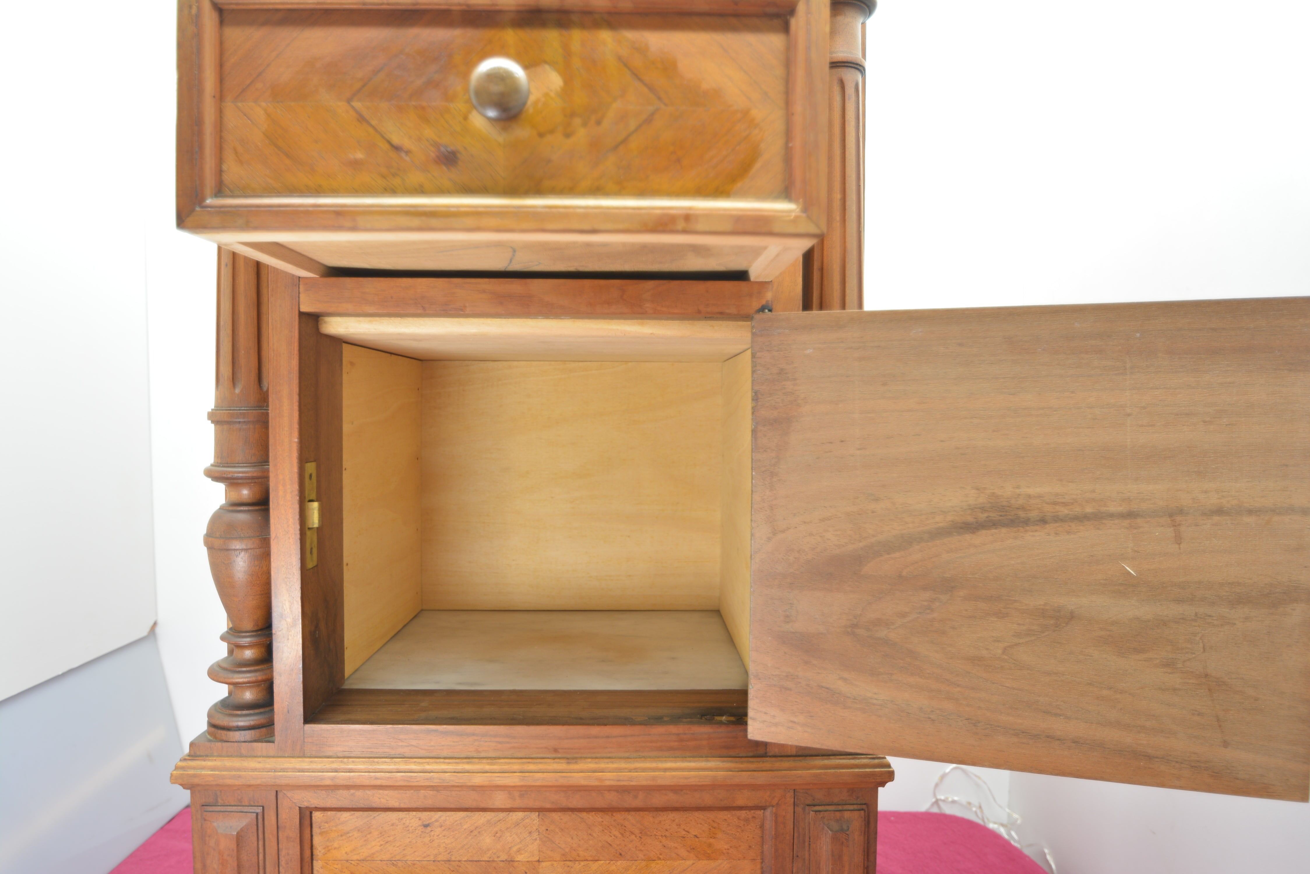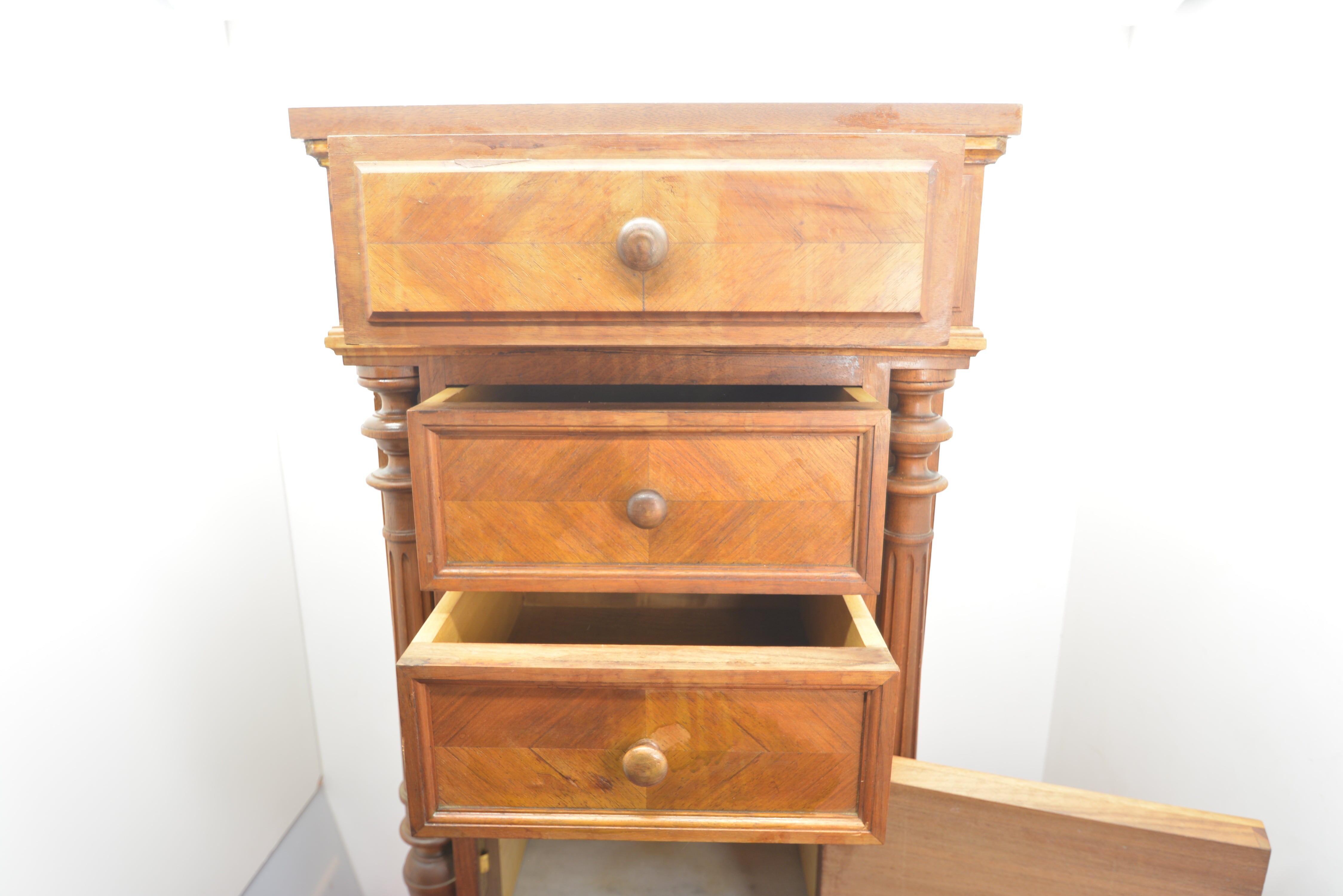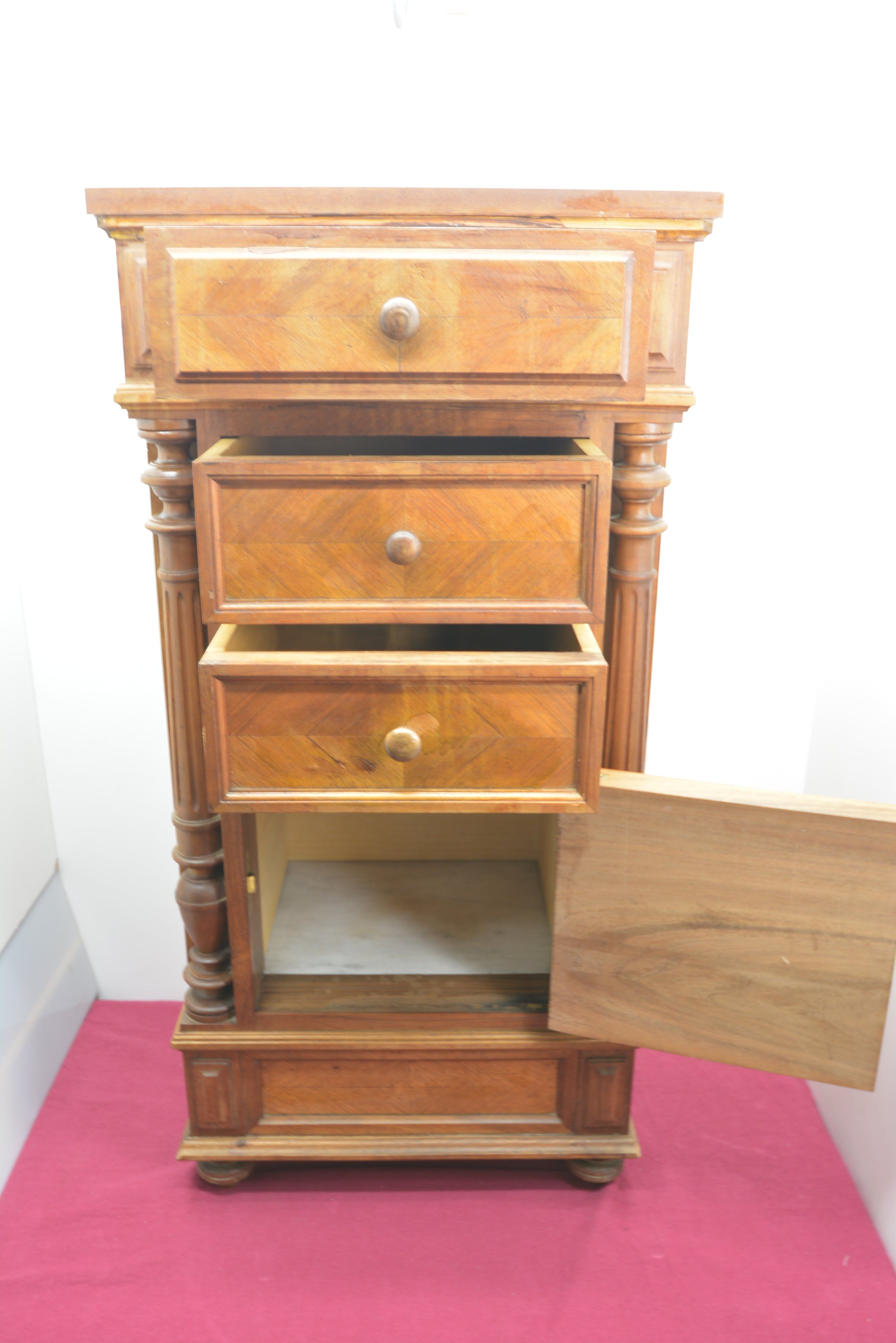 本体は無垢材に寄木細工の美しい矢羽模様(ヘリンボーン)を施し、引き出しは大小3段と収納力抜群。下段には片開きの扉付き収納スペース(内張大理石)も備え、実用性にも優れています。