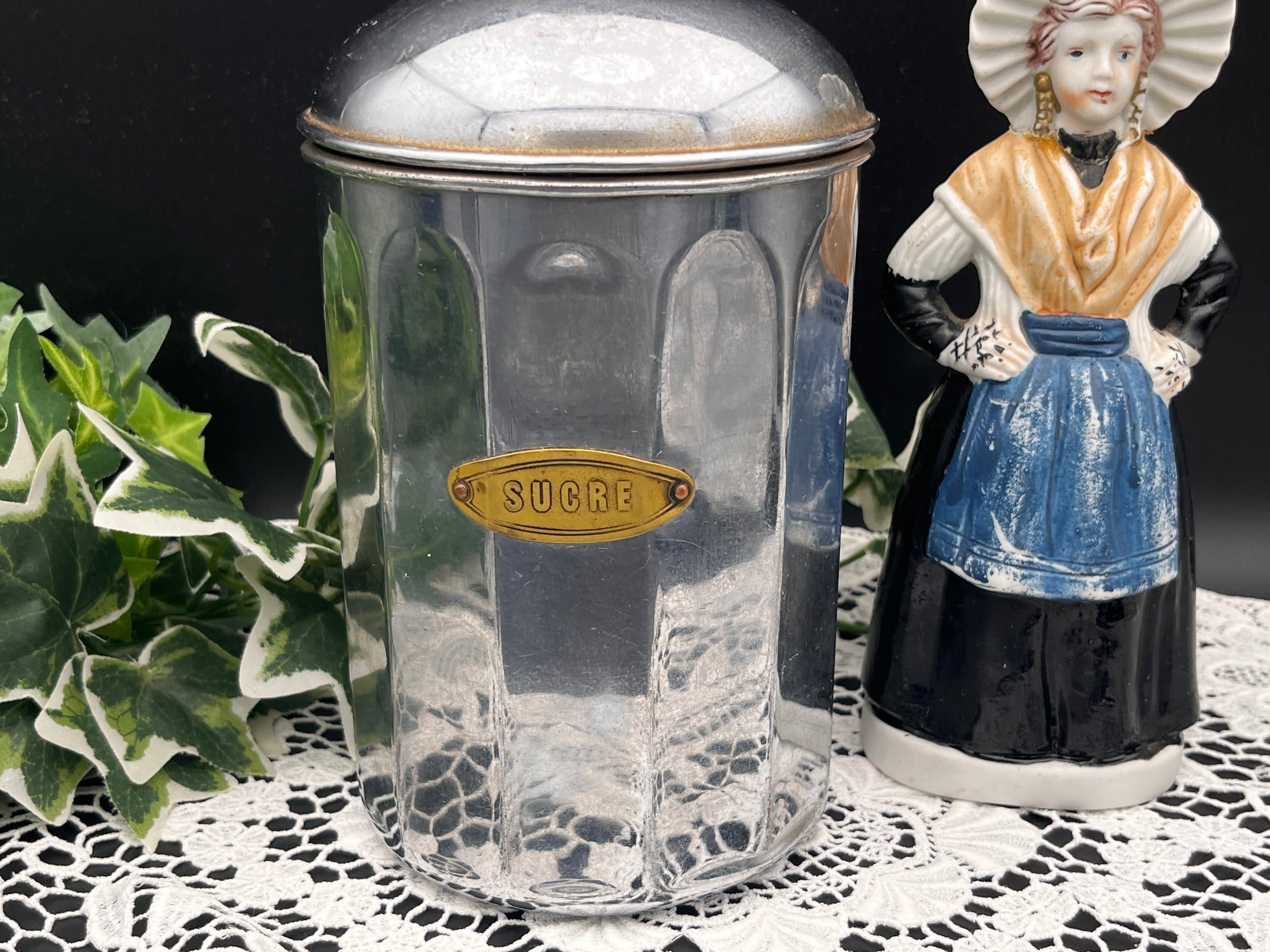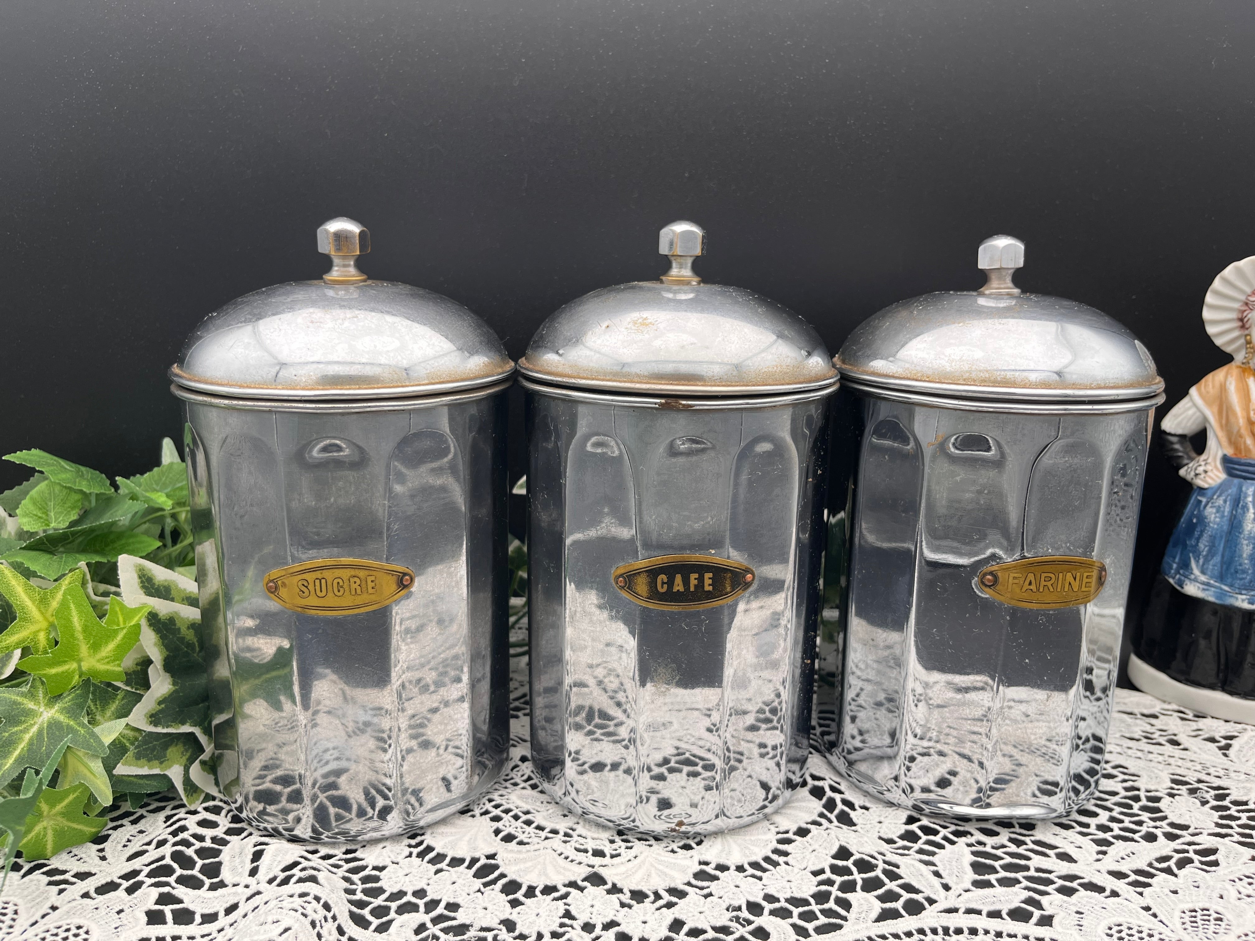 フランスの古き良きキッチンを思わせる、クローム仕上げのメタルキャニスター3点セットです。
