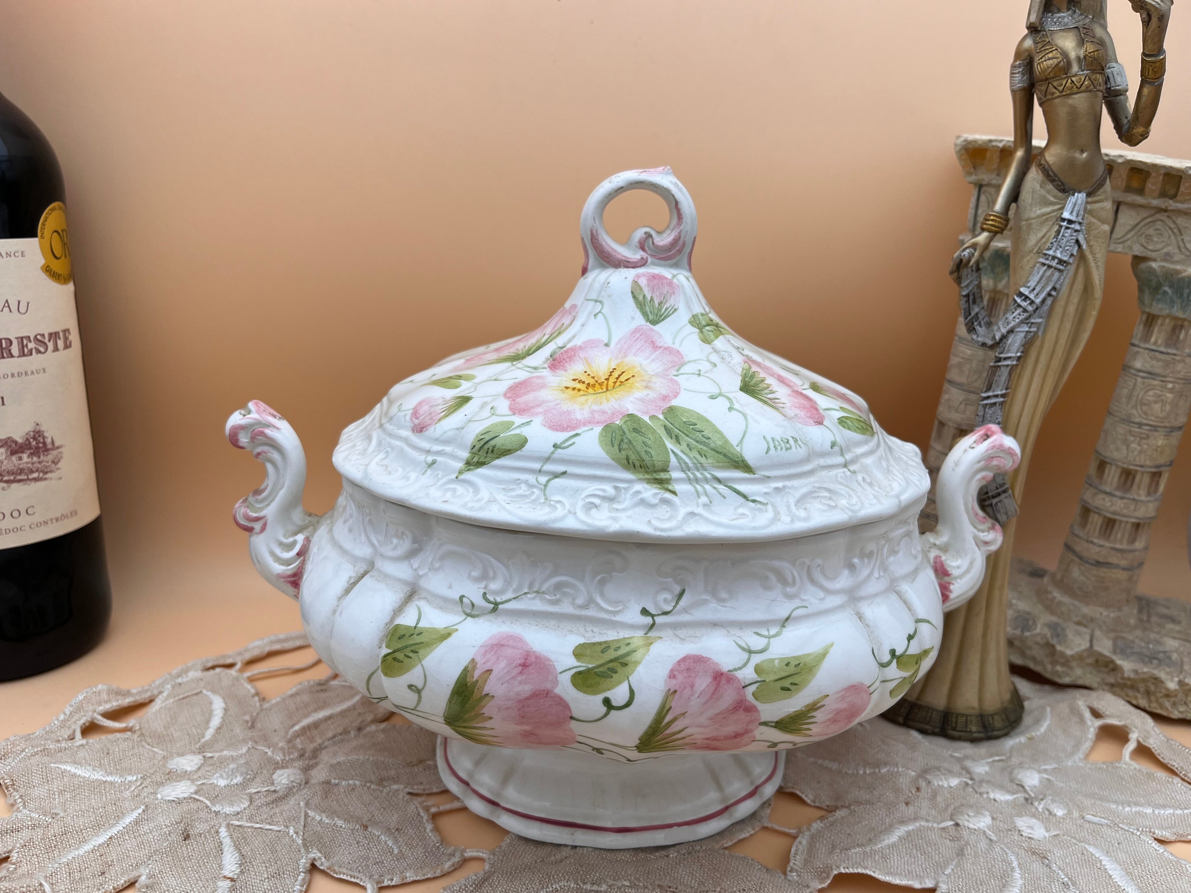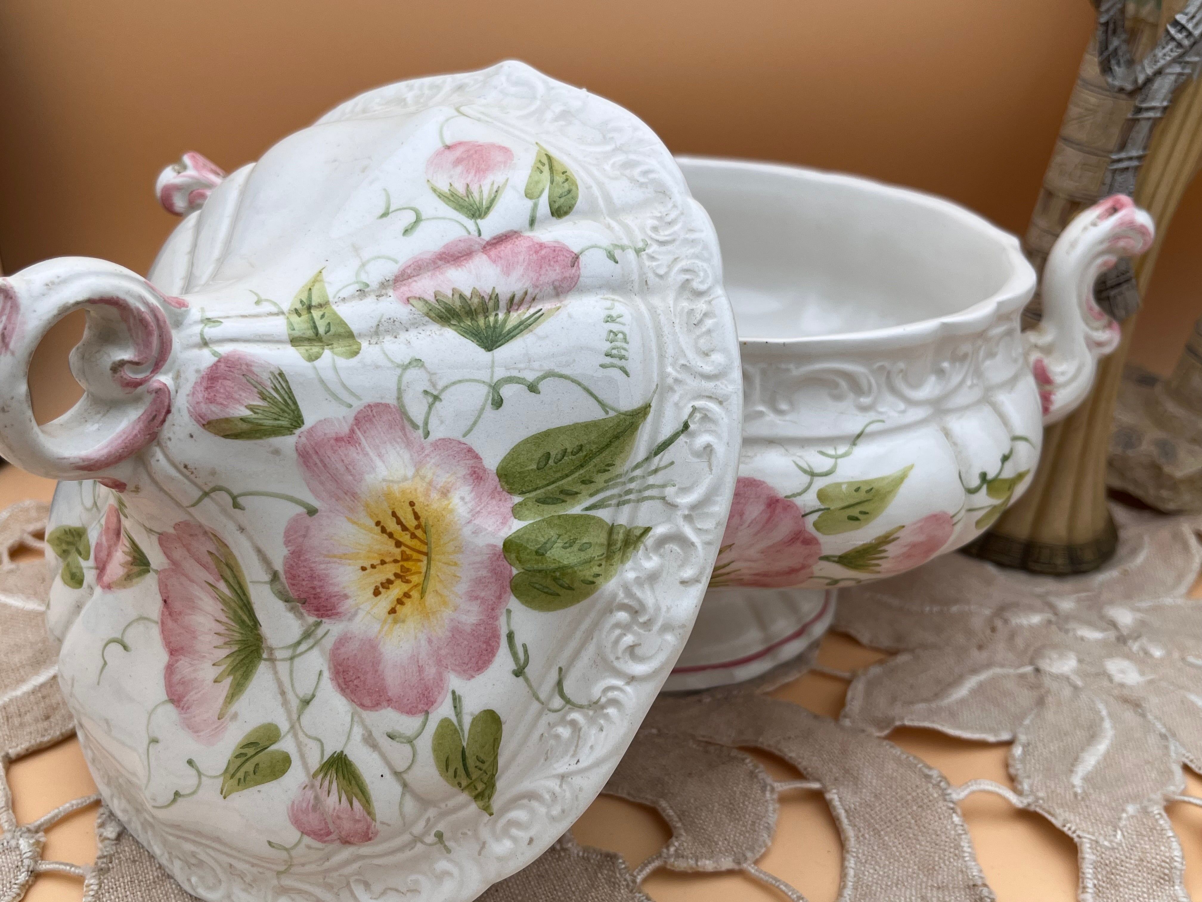 イタリアの名陶産地「Bassano(バッサーノ)」で製造された、華やかなハンドペイントのスープチュリーンです。優雅な白磁にエンボス模様が浮き立ち、そこに繊細な筆致で描かれたピンクの花々と葉が、食卓を彩る美しいアクセントとなっています。