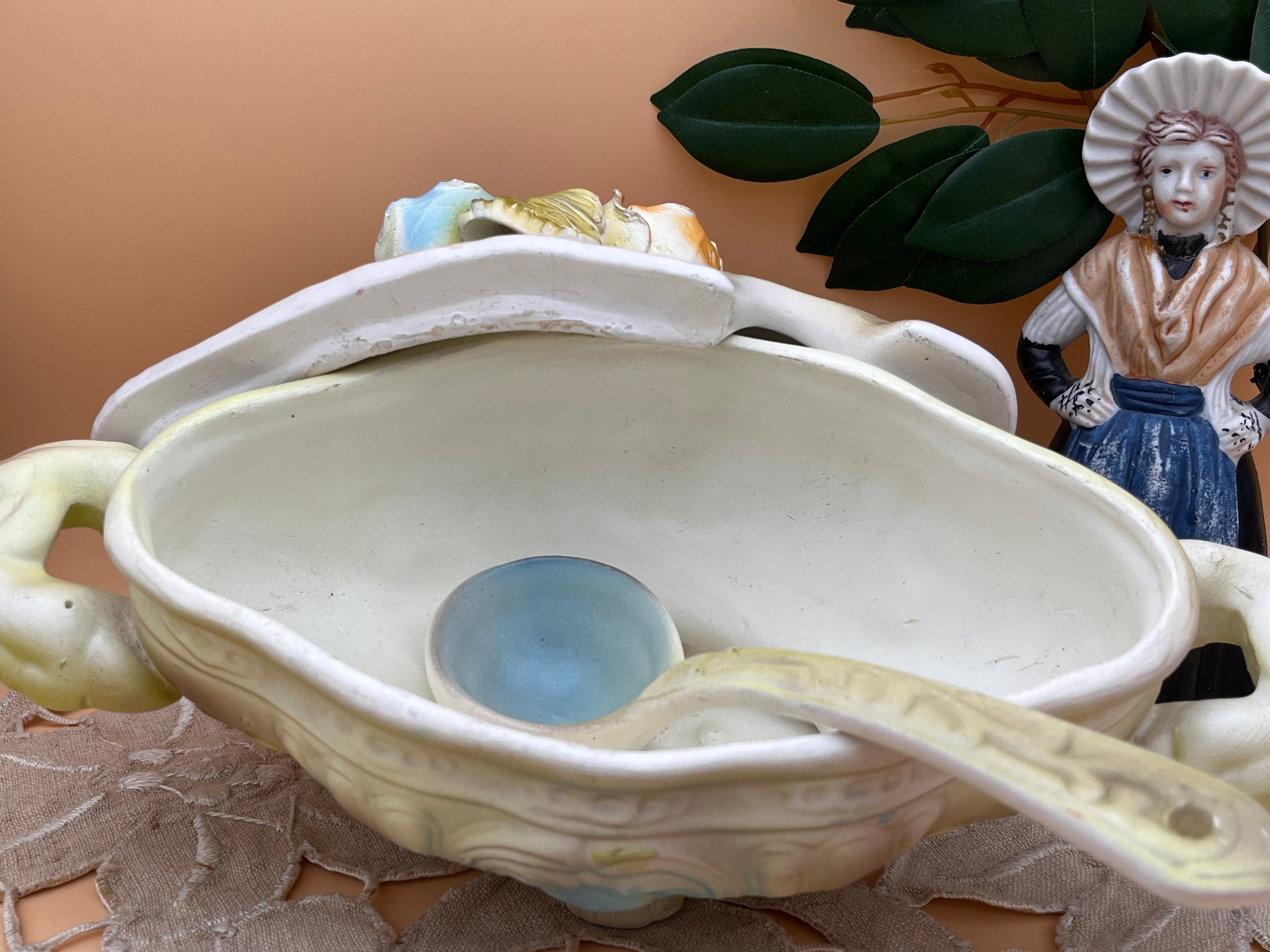本体には優美な曲線模様が施され、両側の取っ手と脚付きのデザインがクラシカルな雰囲気を演出。蓋の花飾りは立体的で、ブルー・ピンク・イエローの色合いが柔らかく調和しています。レードル(スープ用おたま)も付属し、蓋には専用のカトラリー差し込み口も備えられています。