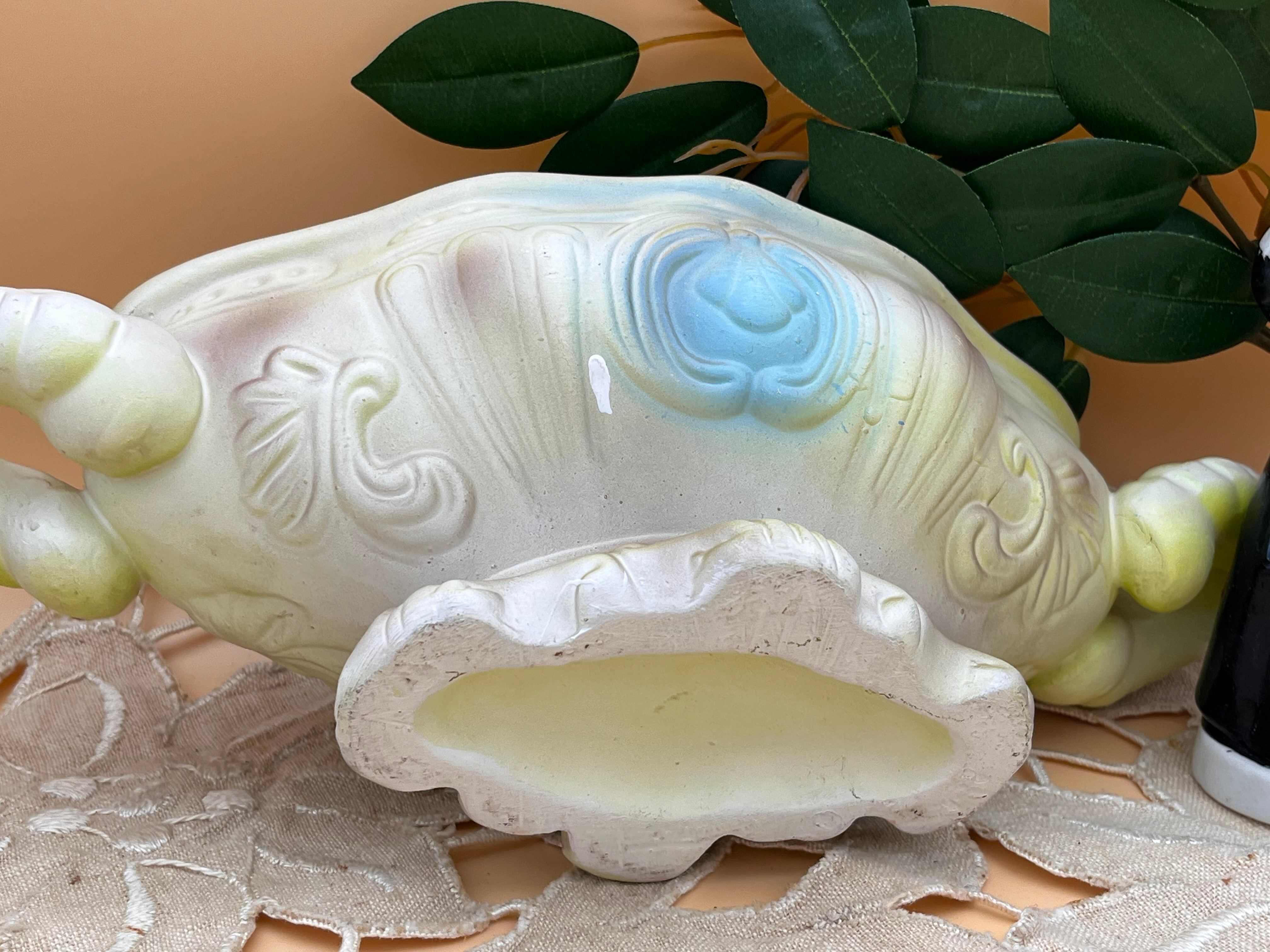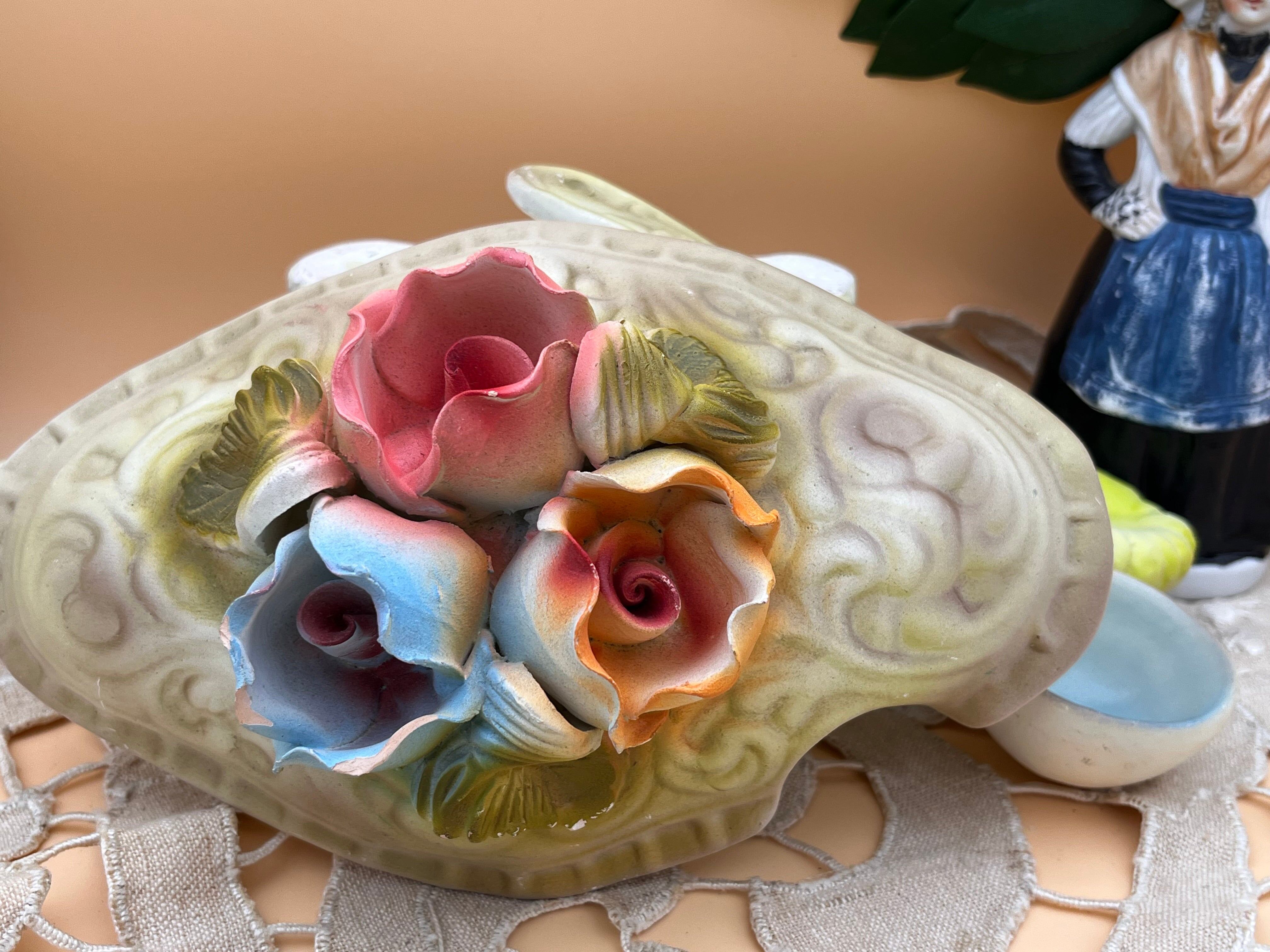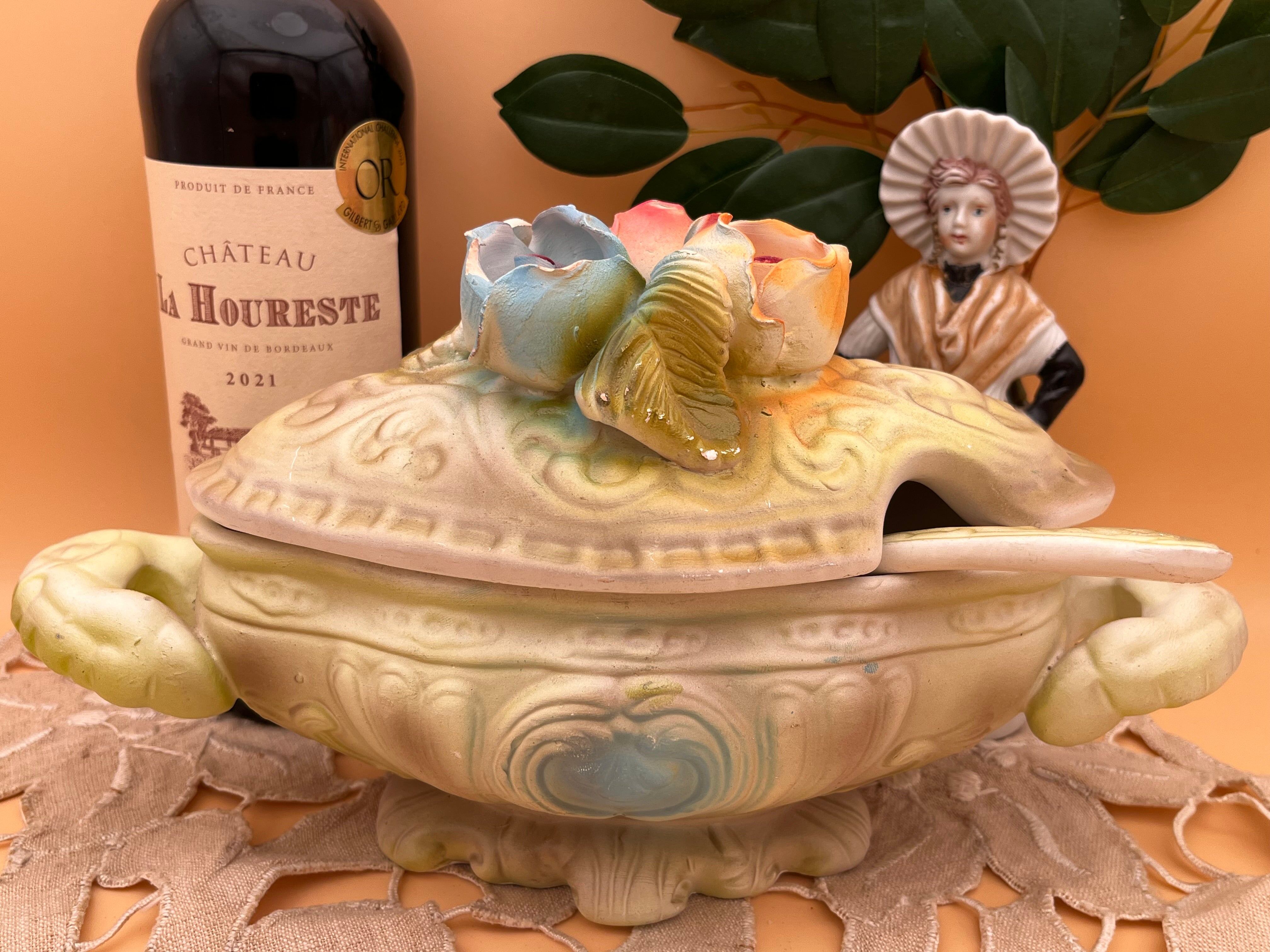 美しいパステルカラーの薔薇と蝶が蓋を飾る、西洋アンティークのスープチュリーン(スープボウル)です。陶器ならではの重厚感と繊細な立体装飾が魅力で、眺めているだけで優雅な食卓の風景が広がります。
