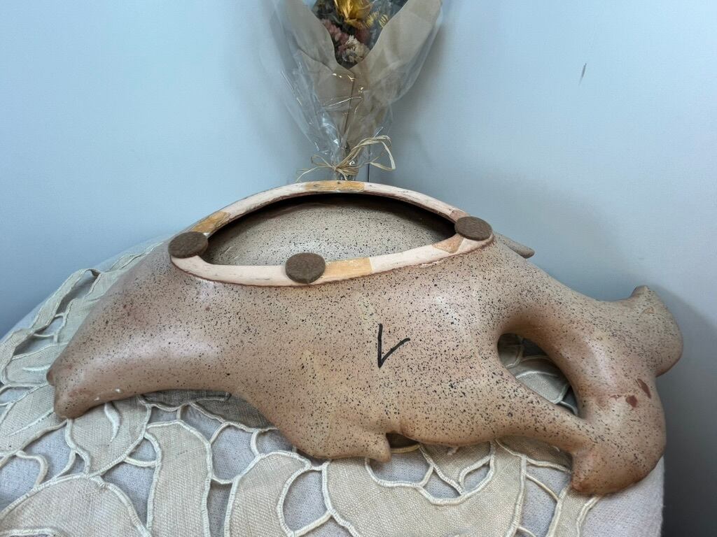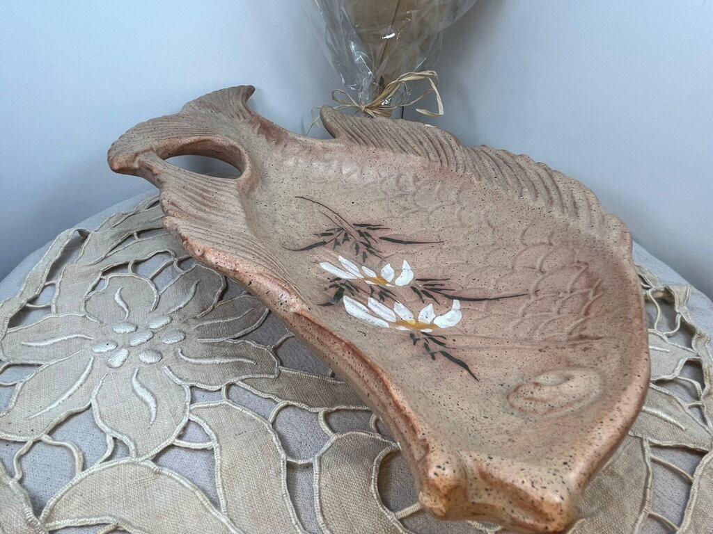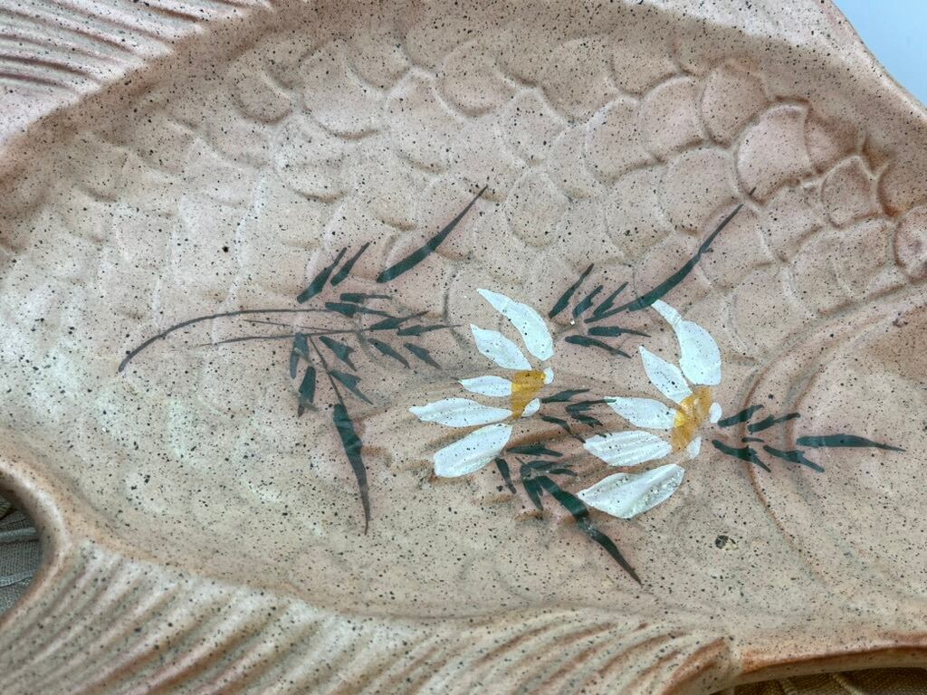 可愛らしく個性的な魚の形をした、アンティークの陶器製プレートです。淡いベージュ〜サーモンピンクの地に、手描きで可憐な白い花があしらわれた味わい深い一品。西洋の伝統的なハンドクラフトによるもので、1960〜1980年代頃のヨーロッパ製と推定されます。