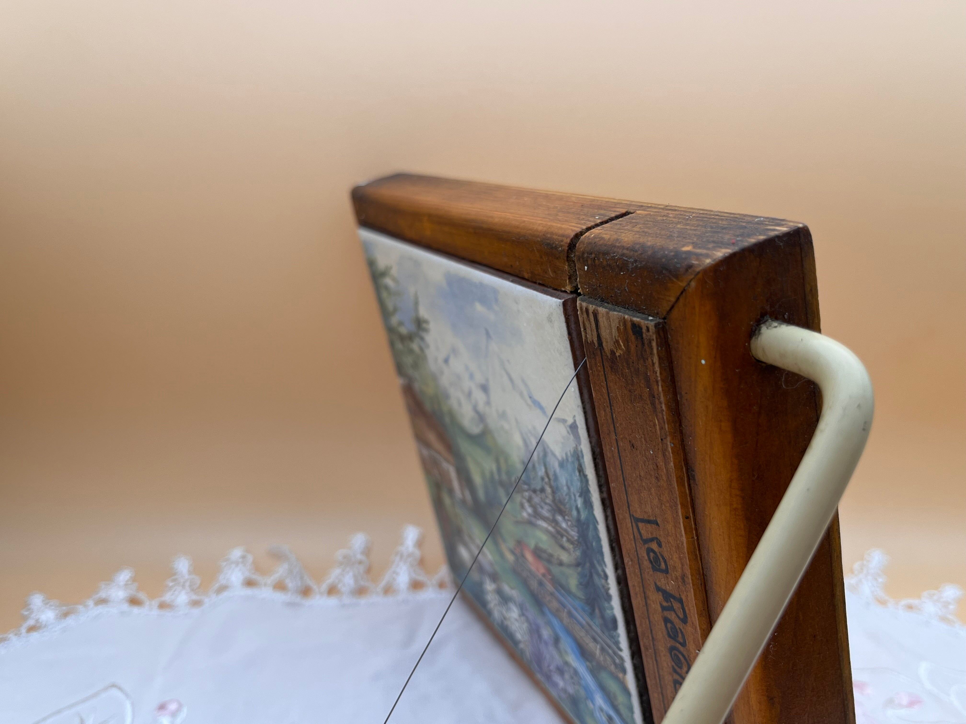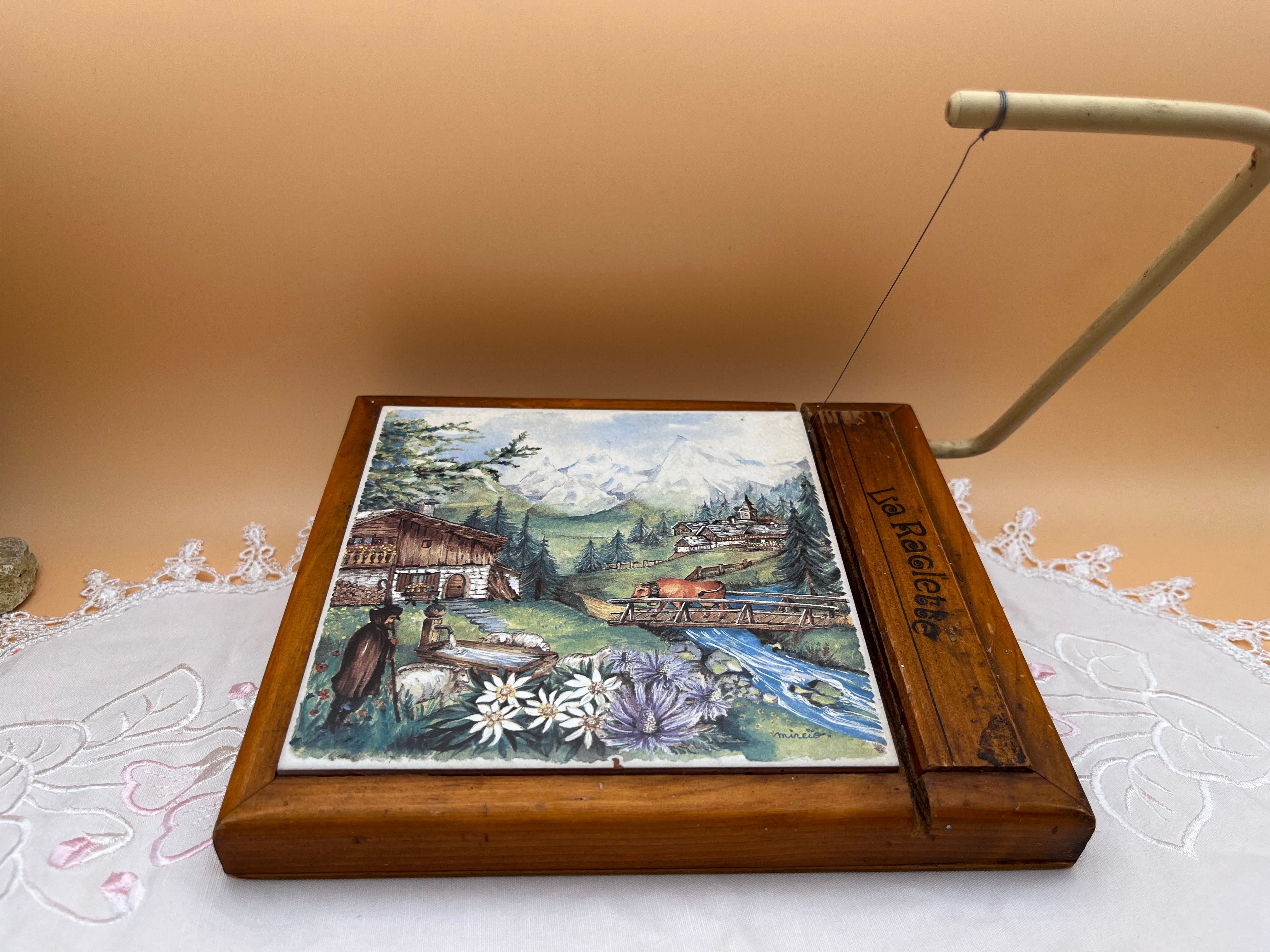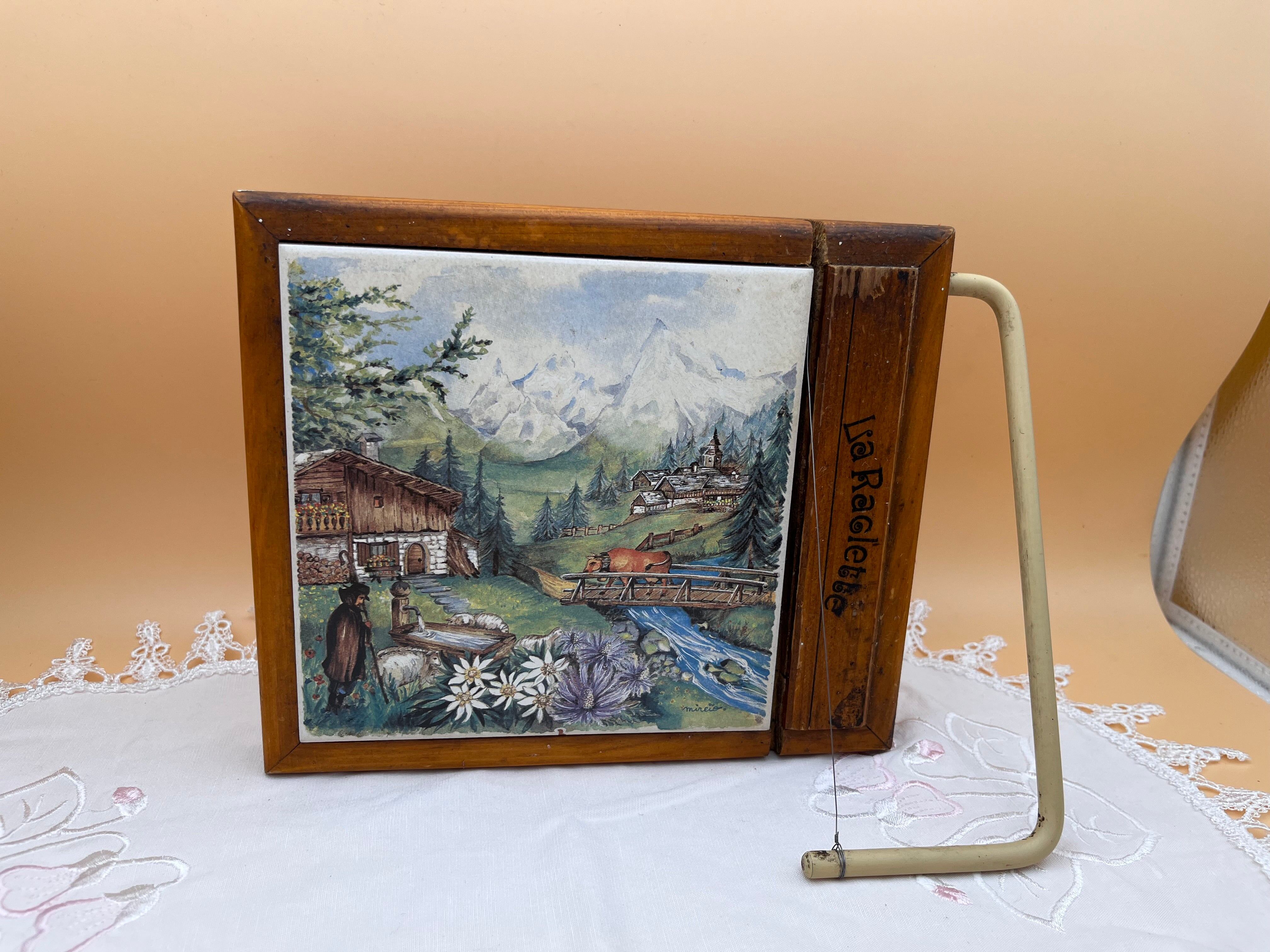 美しいアルプスの風景画が描かれたタイルプレートと、木製フレーム、ワイヤーカッターが一体となった**ヴィンテージのチーズカッター《La Raclette》**のご紹介です。