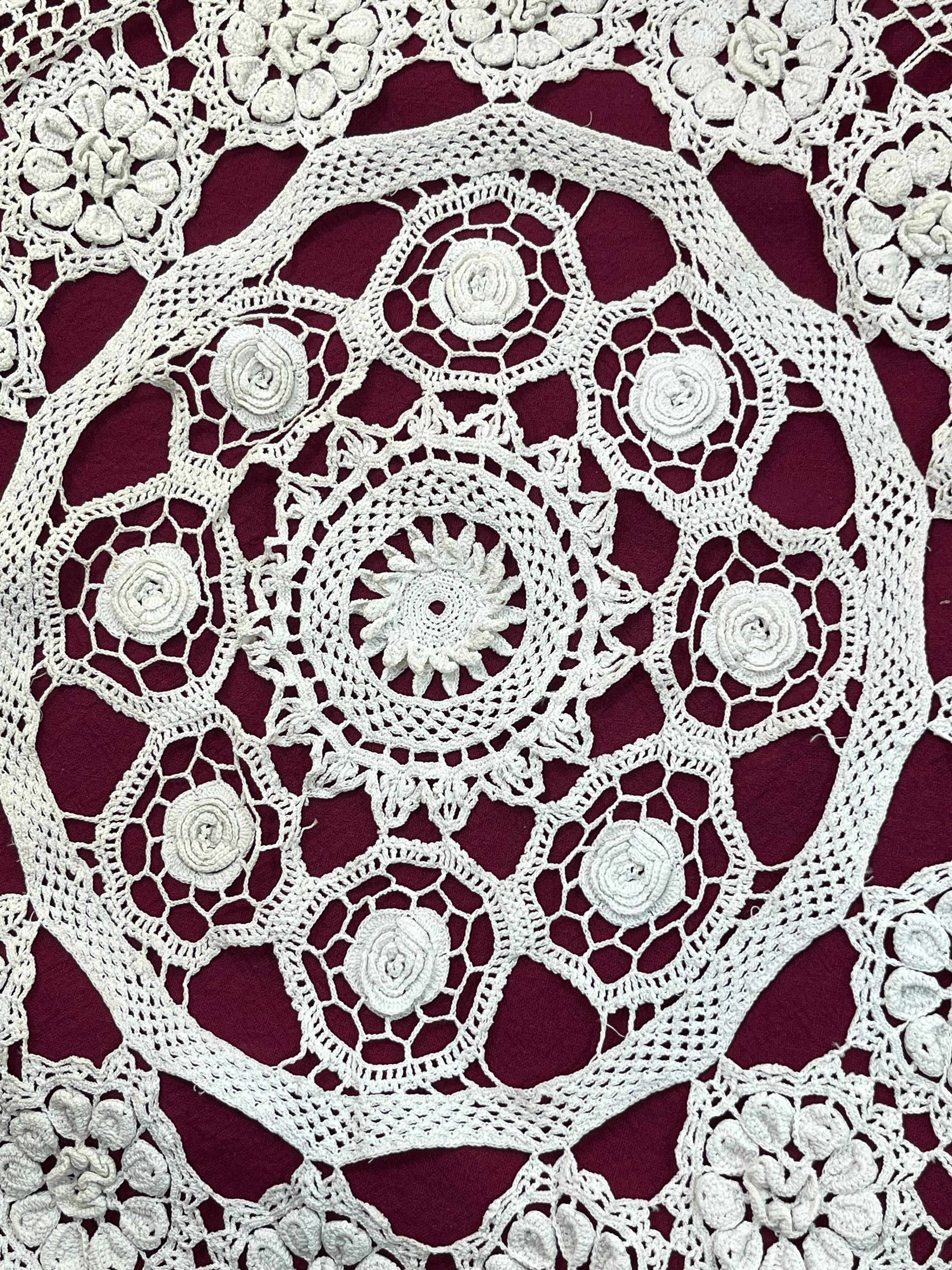 手編みの丁寧な仕上がりが美しく、バラを思わせる立体的な花モチーフが繊細に編み込まれています。中央の円形パターンから外周に向かって幾何学模様が広がるデザインは、まさに職人技の光る一品。