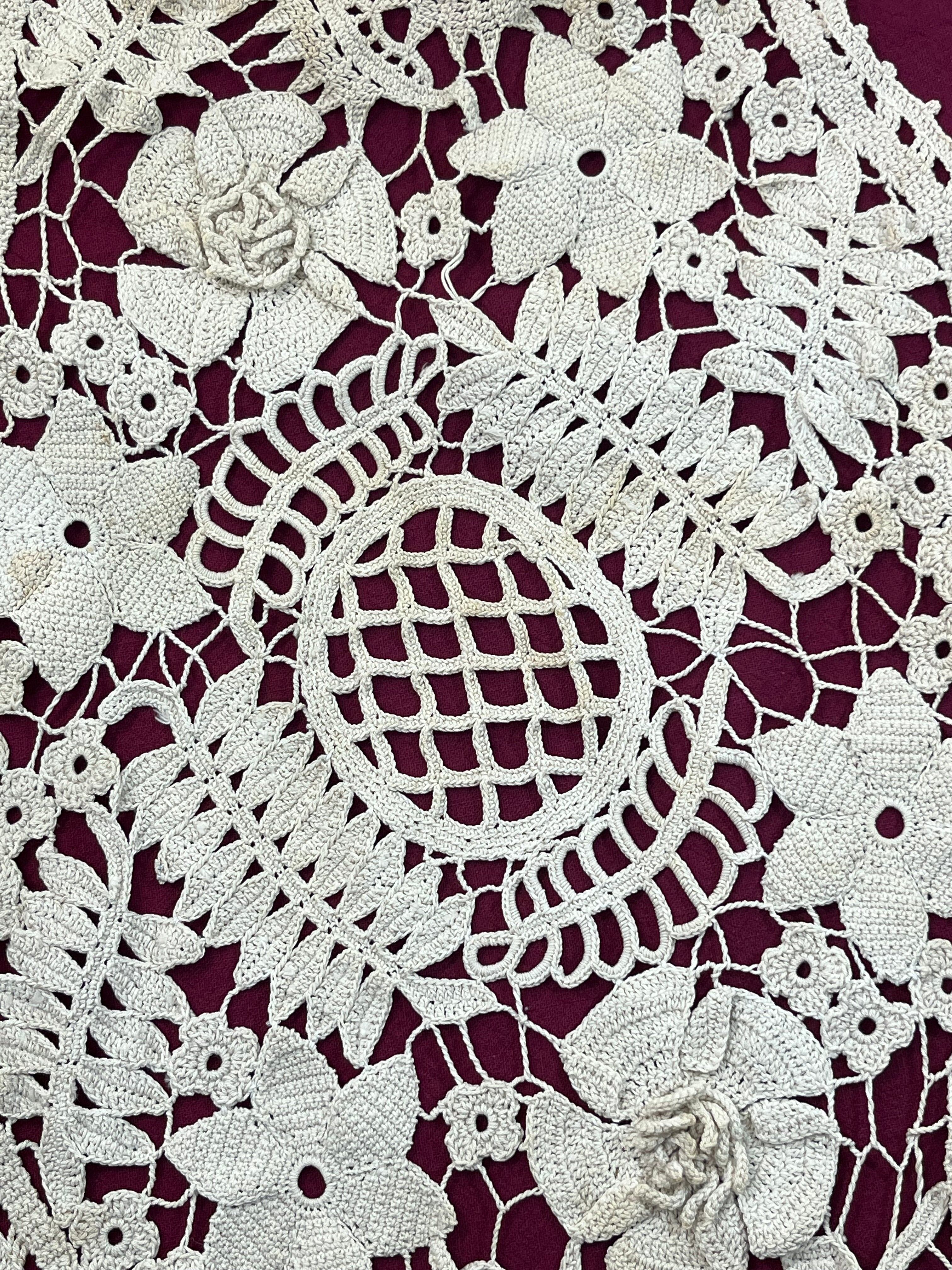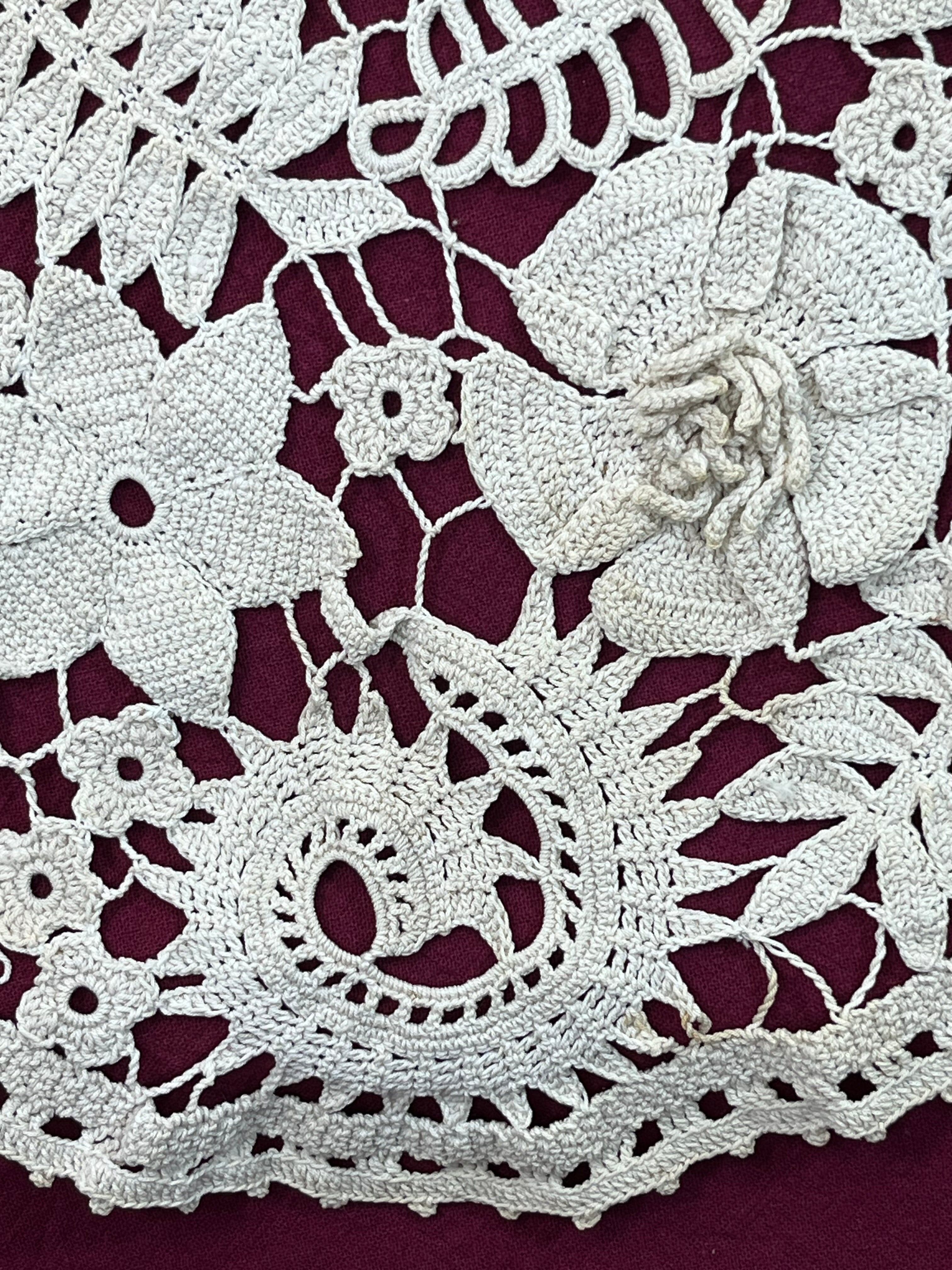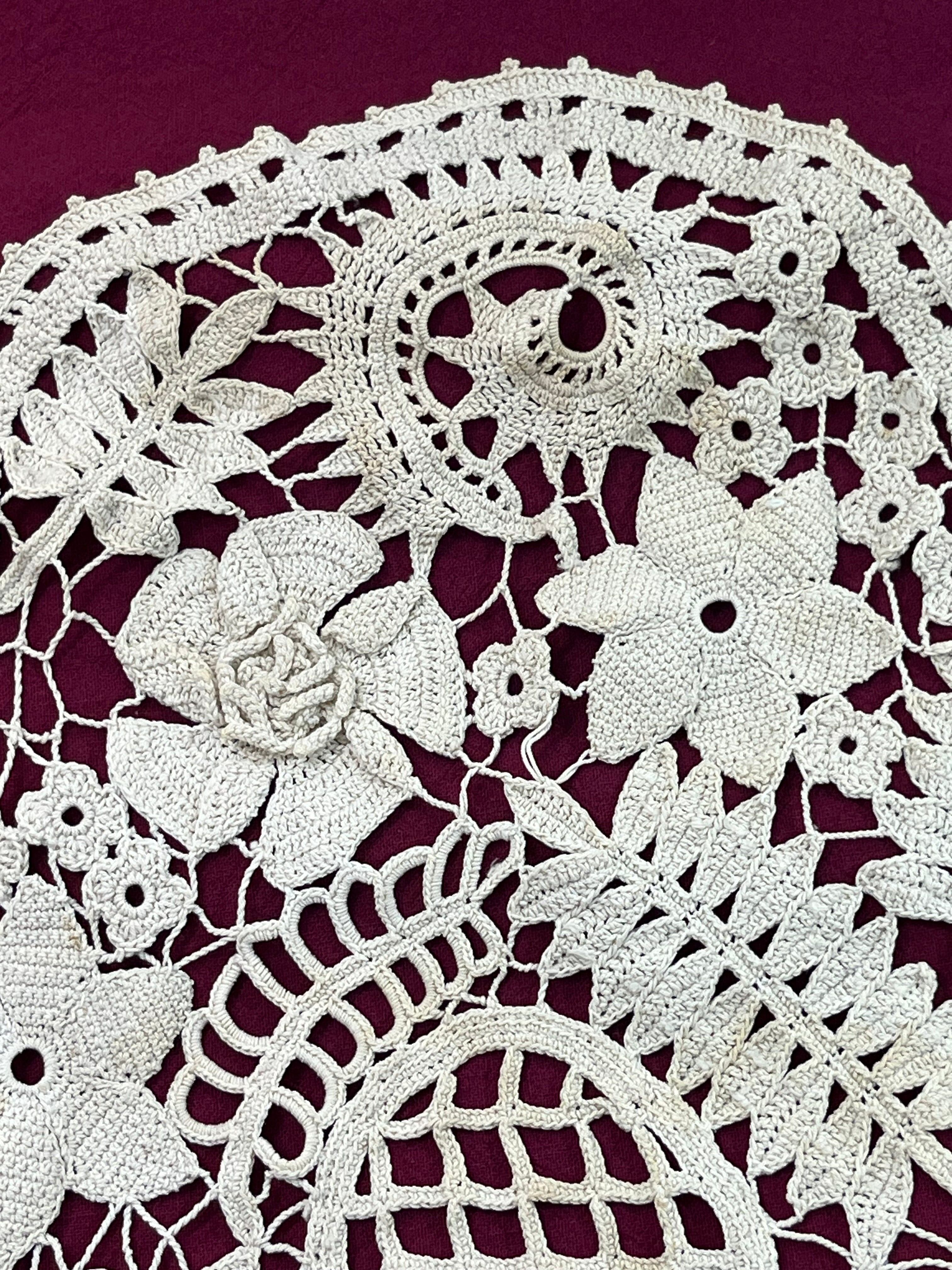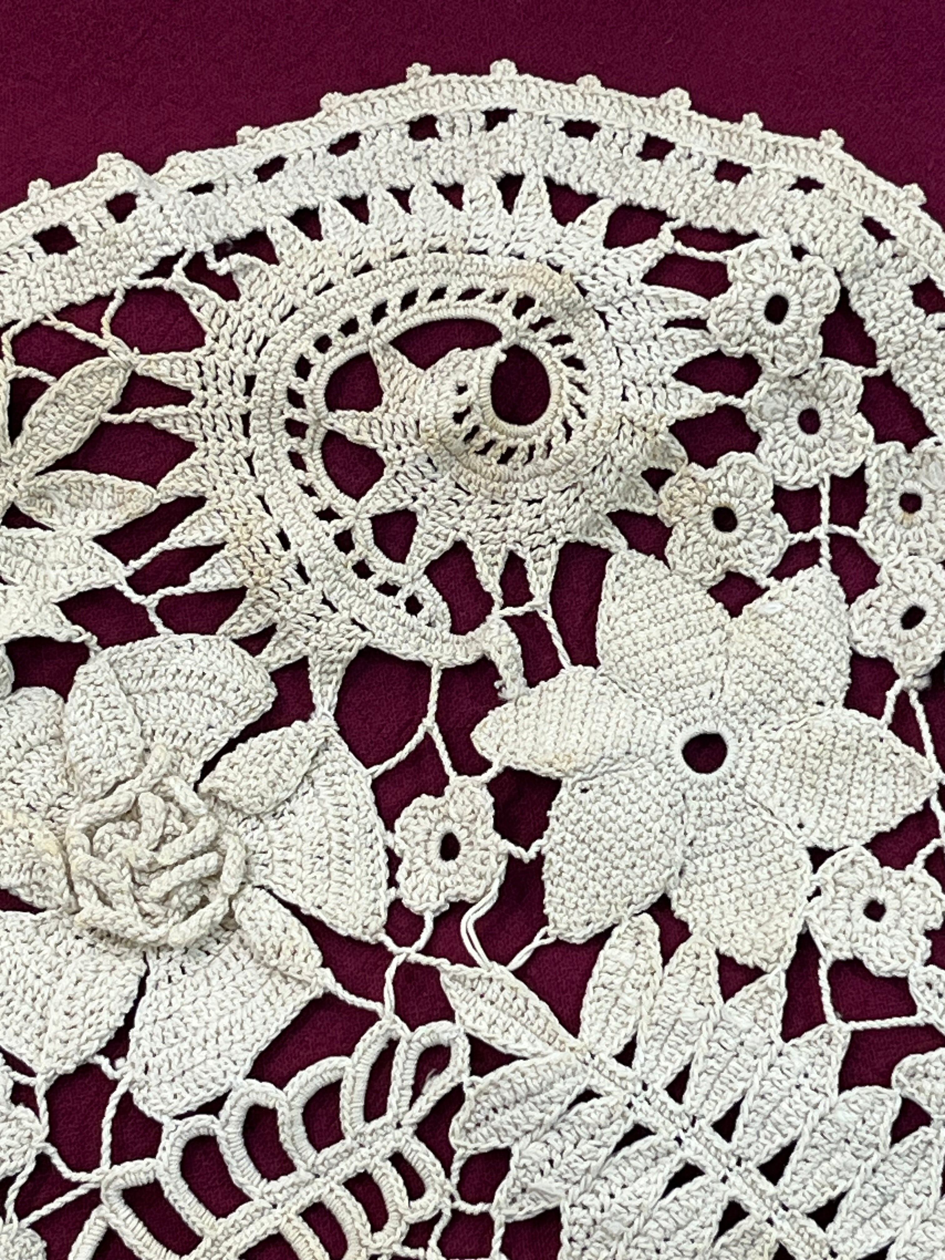 花や葉、渦巻き模様など多様なモチーフを組み合わせた手編みのデザインは、まるで1枚のレースアート。しっかりとした厚みのあるコットン糸で作られており、存在感と安定感があります。