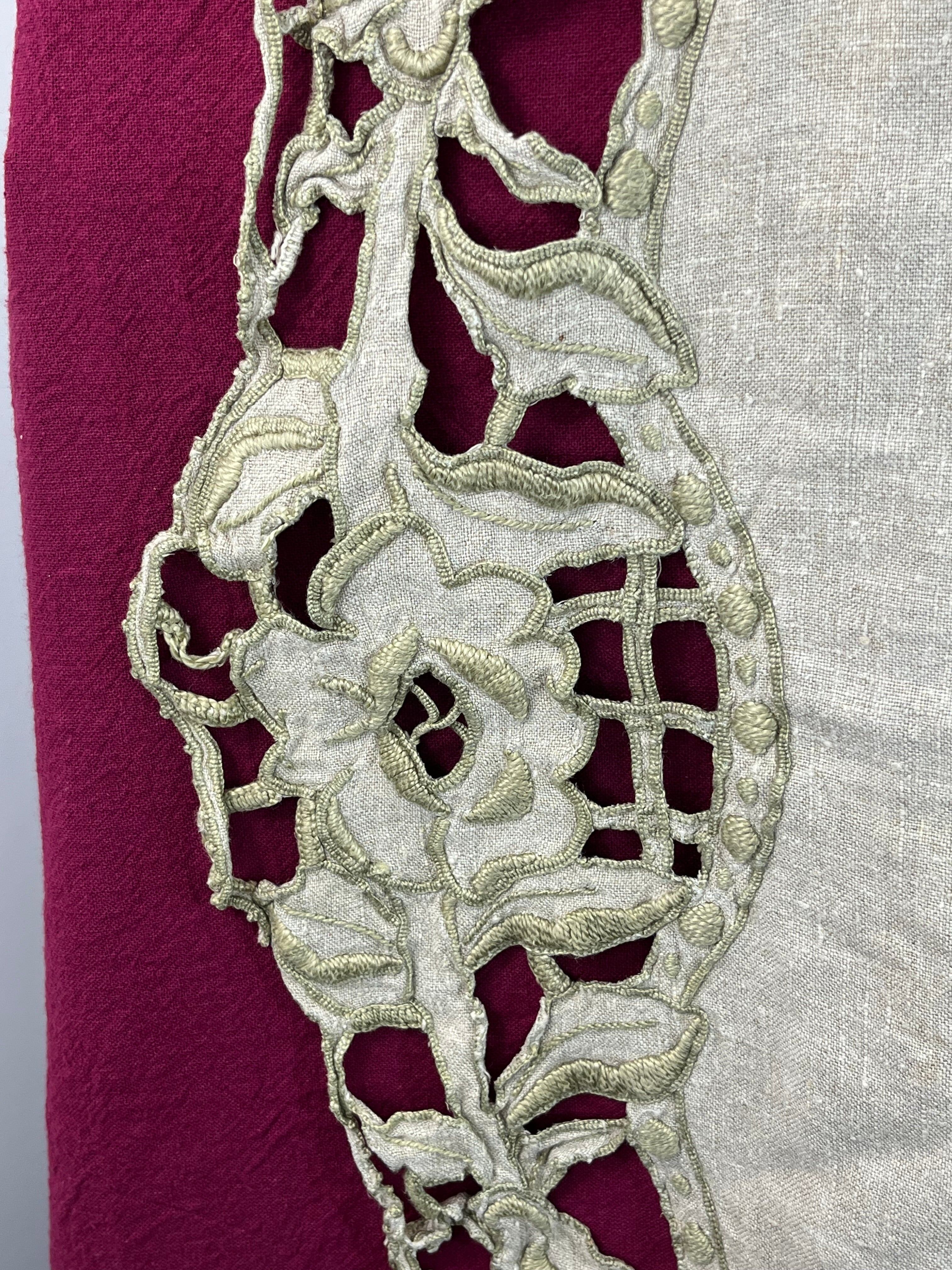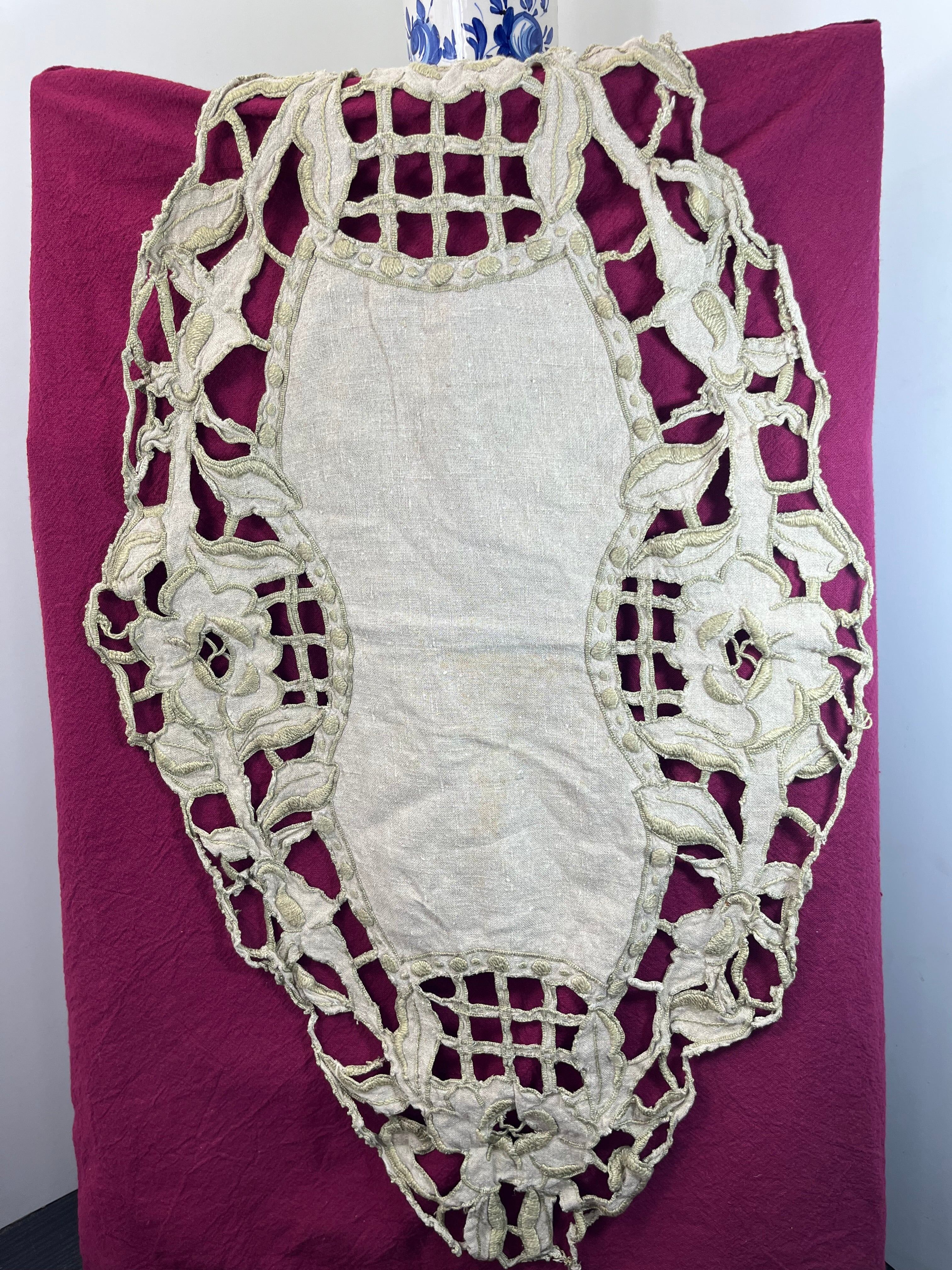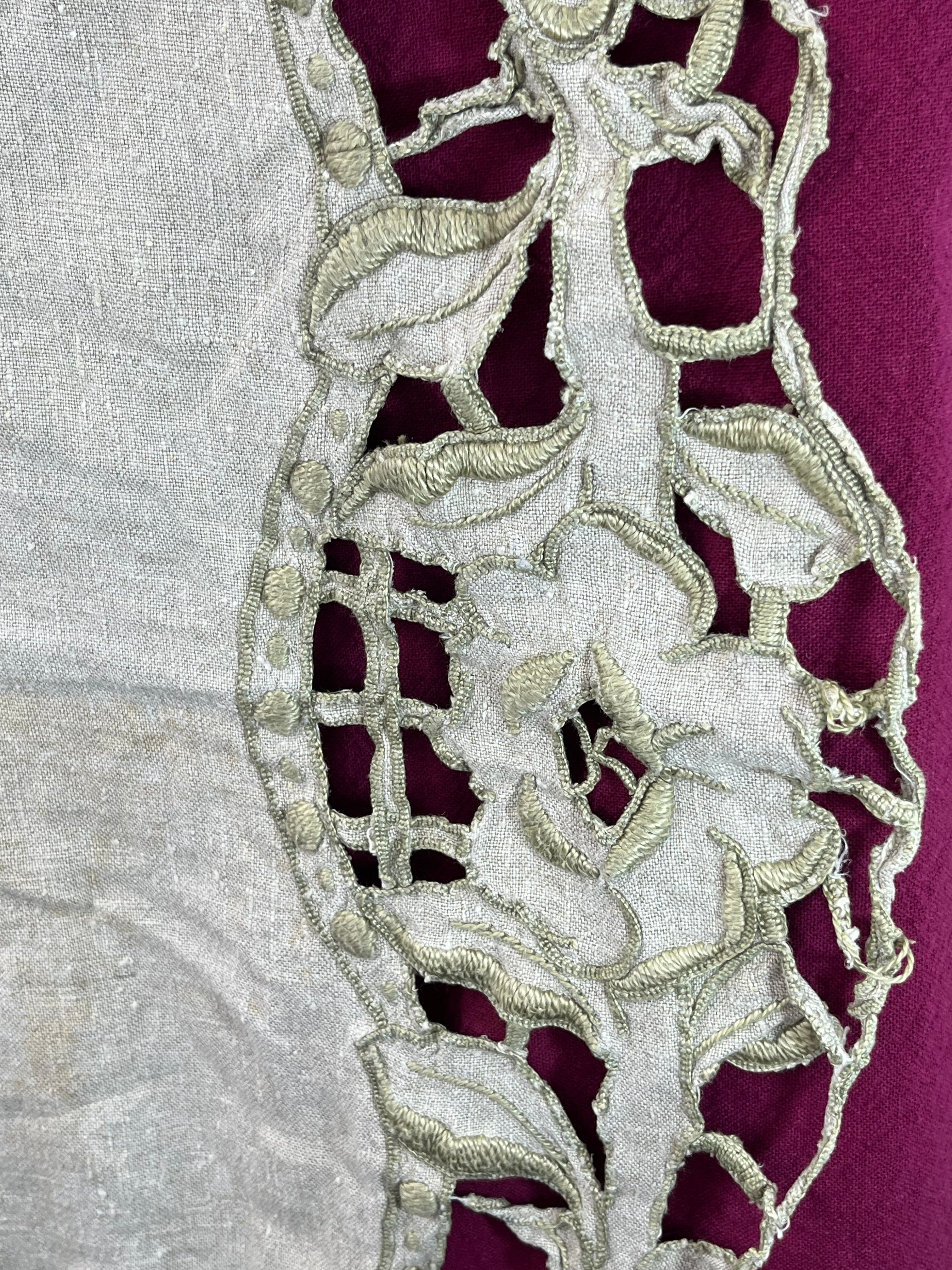 厚手のリネン生地をベースに、透かしのあるカットワークと立体的な花模様の刺繍があしらわれ、気品あるクラシックな雰囲気を放ちます。