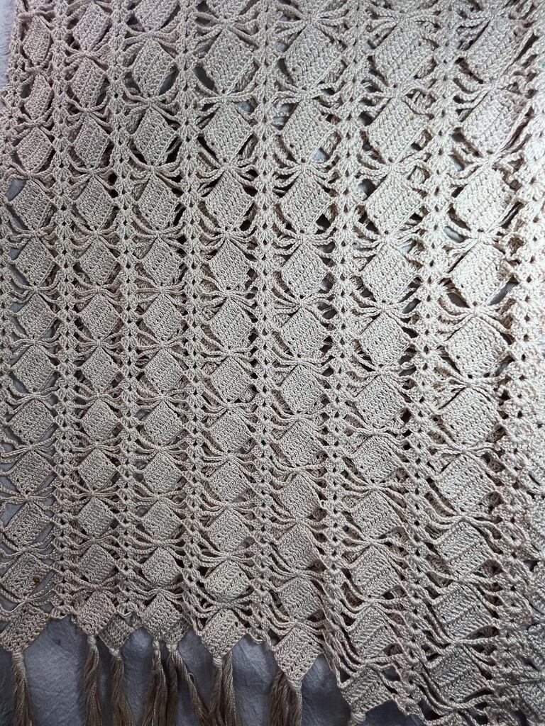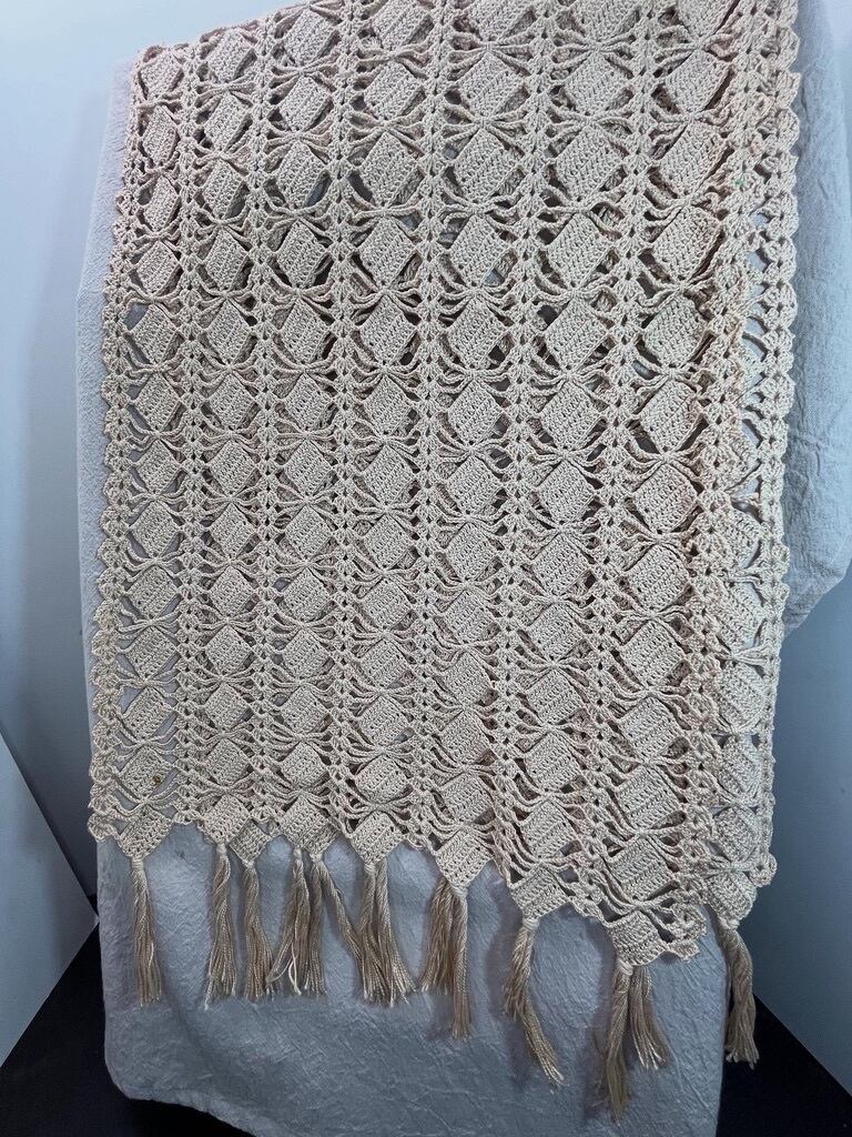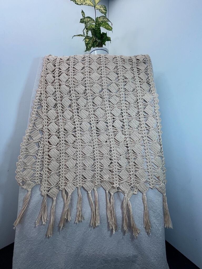 美しいアイボリーカラーのコットン糸で丁寧に編み込まれたダイヤ柄の編み模様と、手作業で仕上げられたフリンジが特徴。