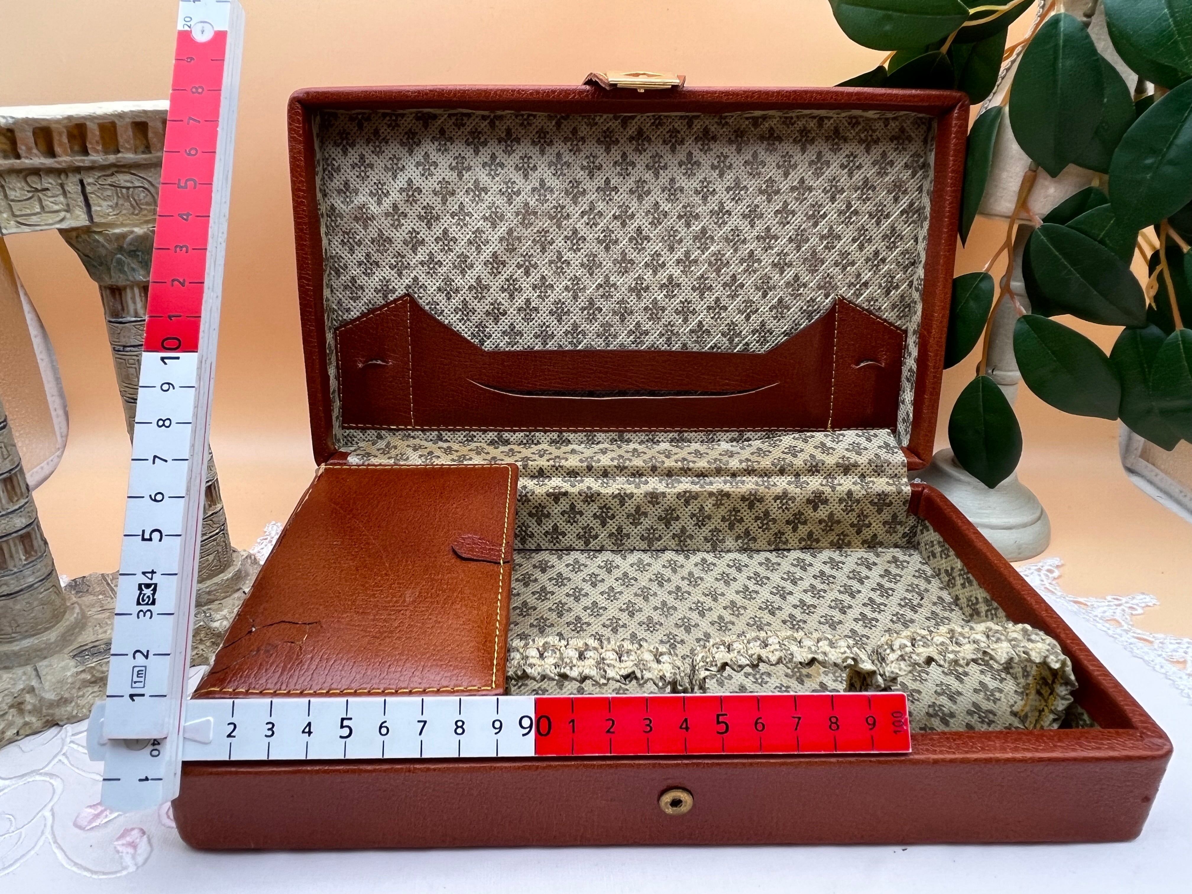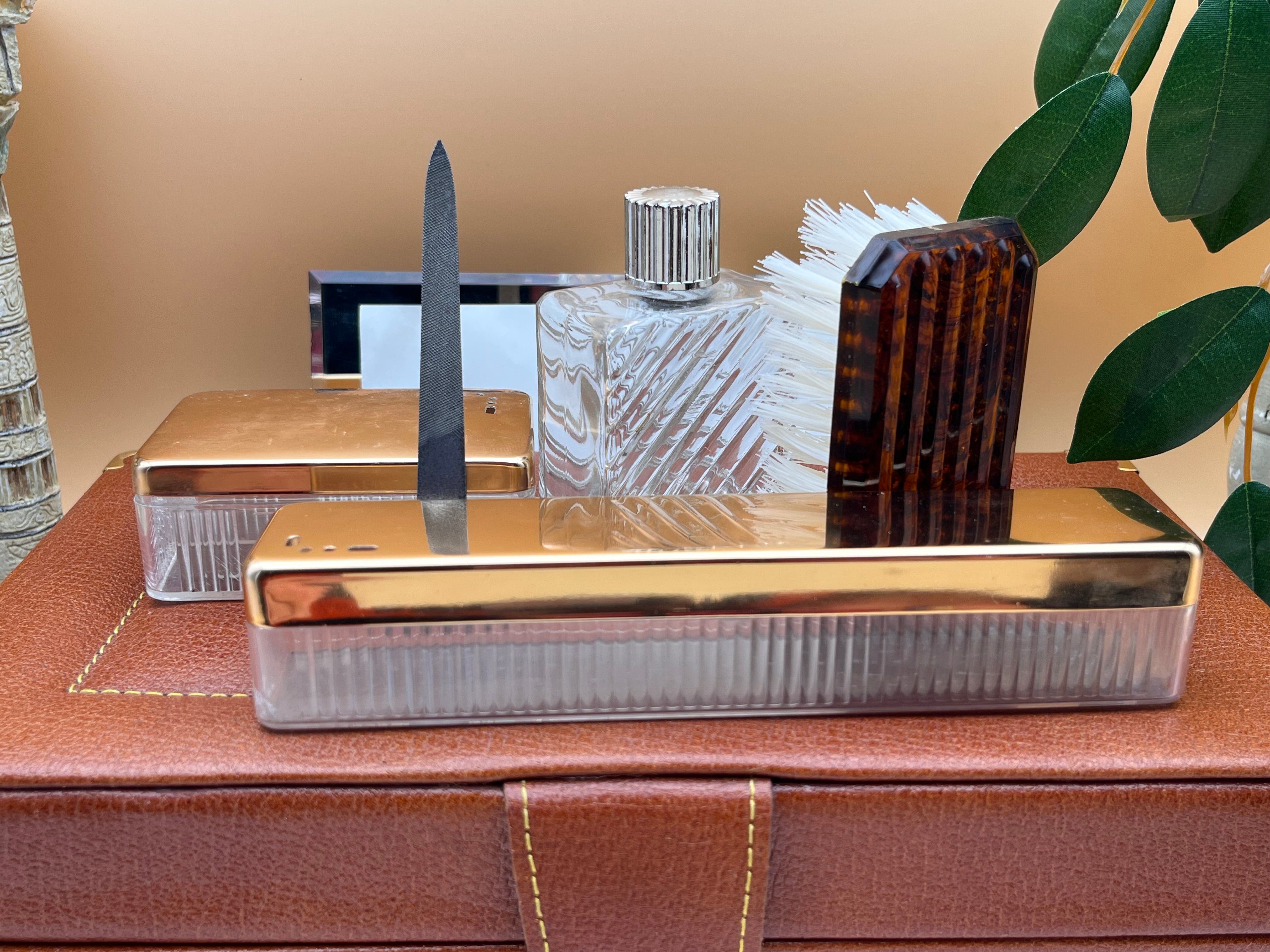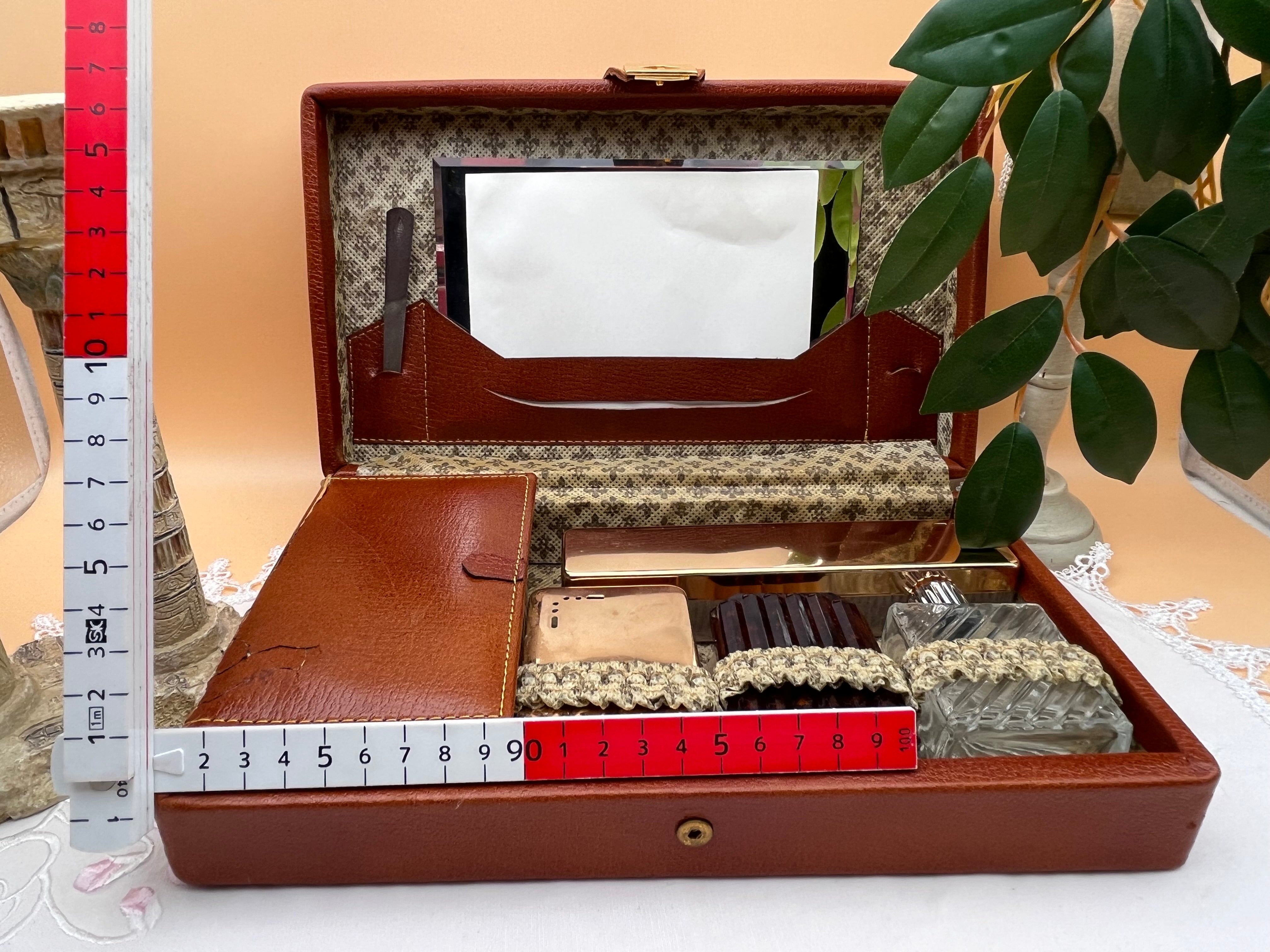 【セット内容】・ハンドミラー(取り外し可能)・爪やすり(金属製)・コーム(鼈甲風)・洋ブラシ(毛質良好)・金属キャップ付きのガラスボトル×2(香水や化粧水用)・パウダーボックス(ゴールド調)・収納用レザーケース(内布はクラシカルな花柄)