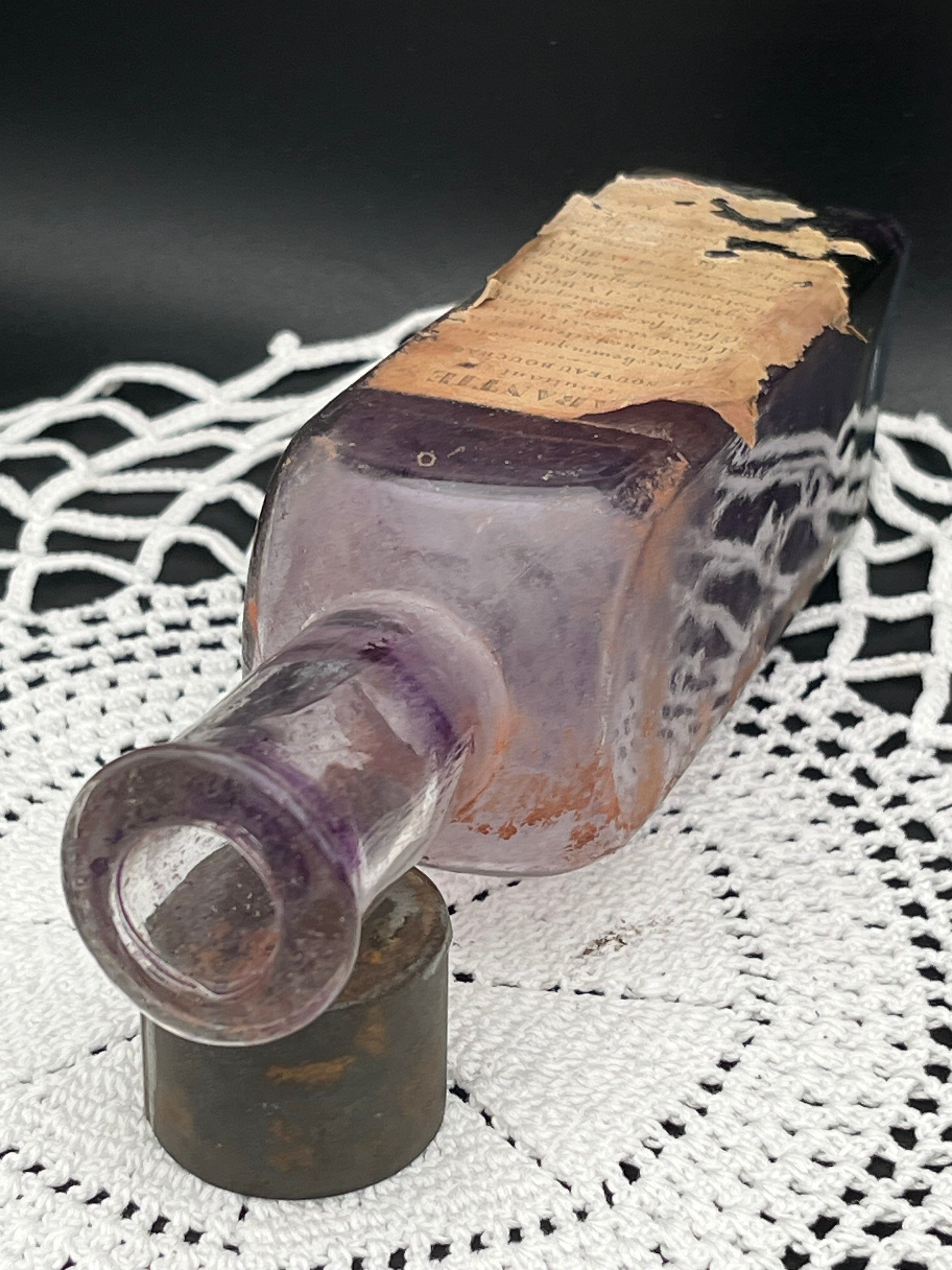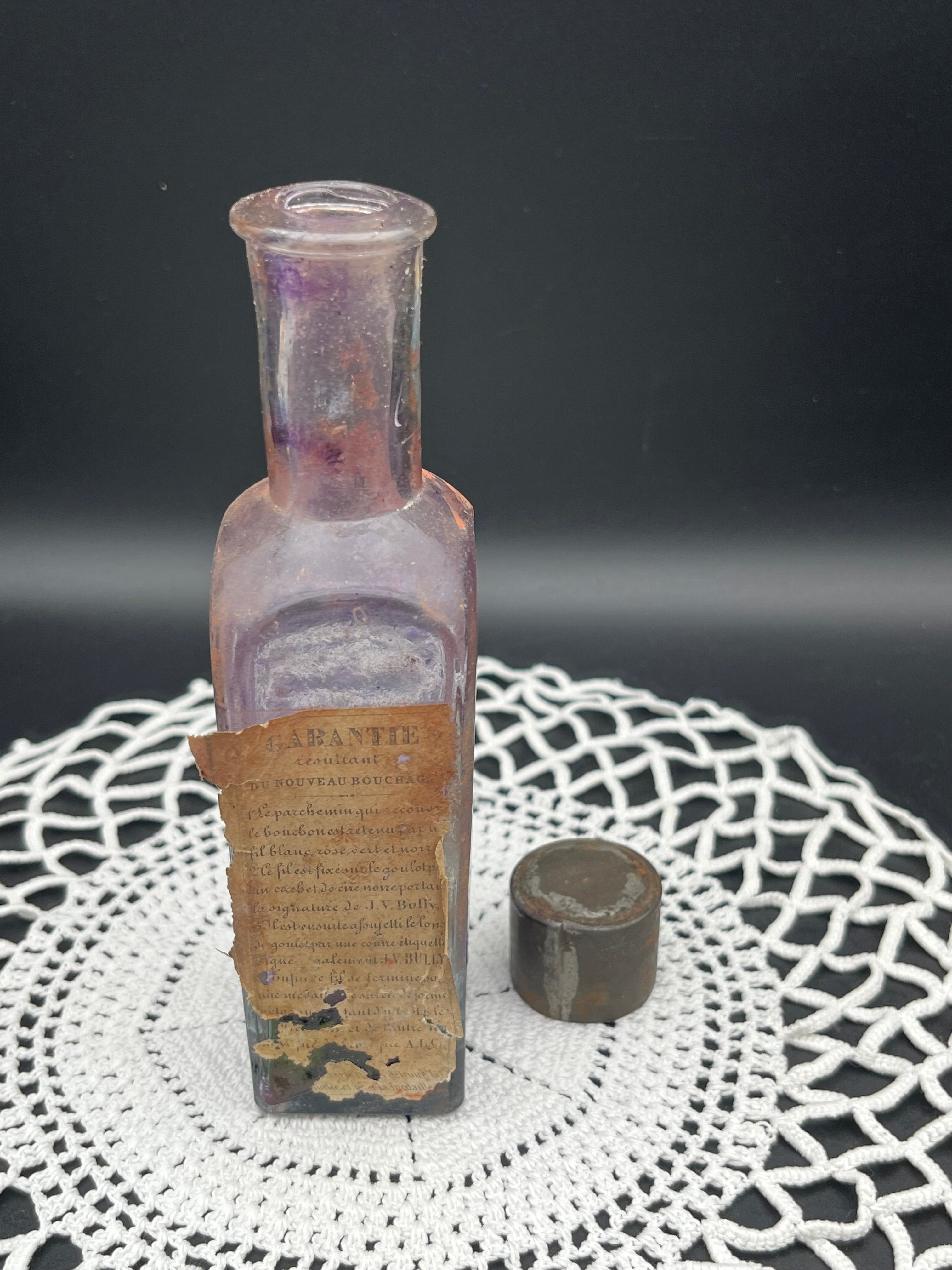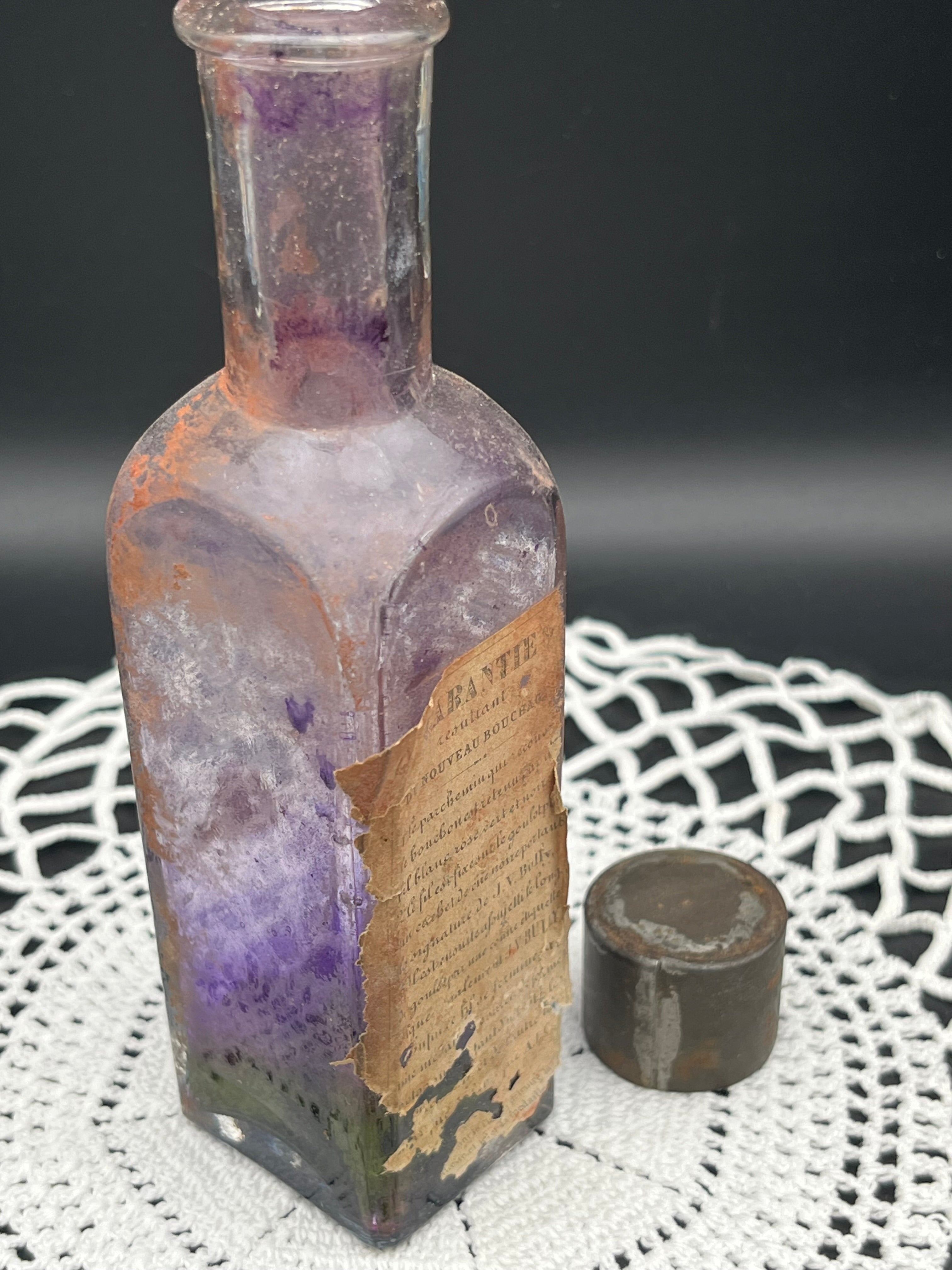 美しいバイオレット・パープルのガラスに、当時のオリジナルラベルが一部残された貴重な一品。瓶底から徐々に色づいたグラデーションと、鉄製のキャップが時代の風合いを醸し出しています。