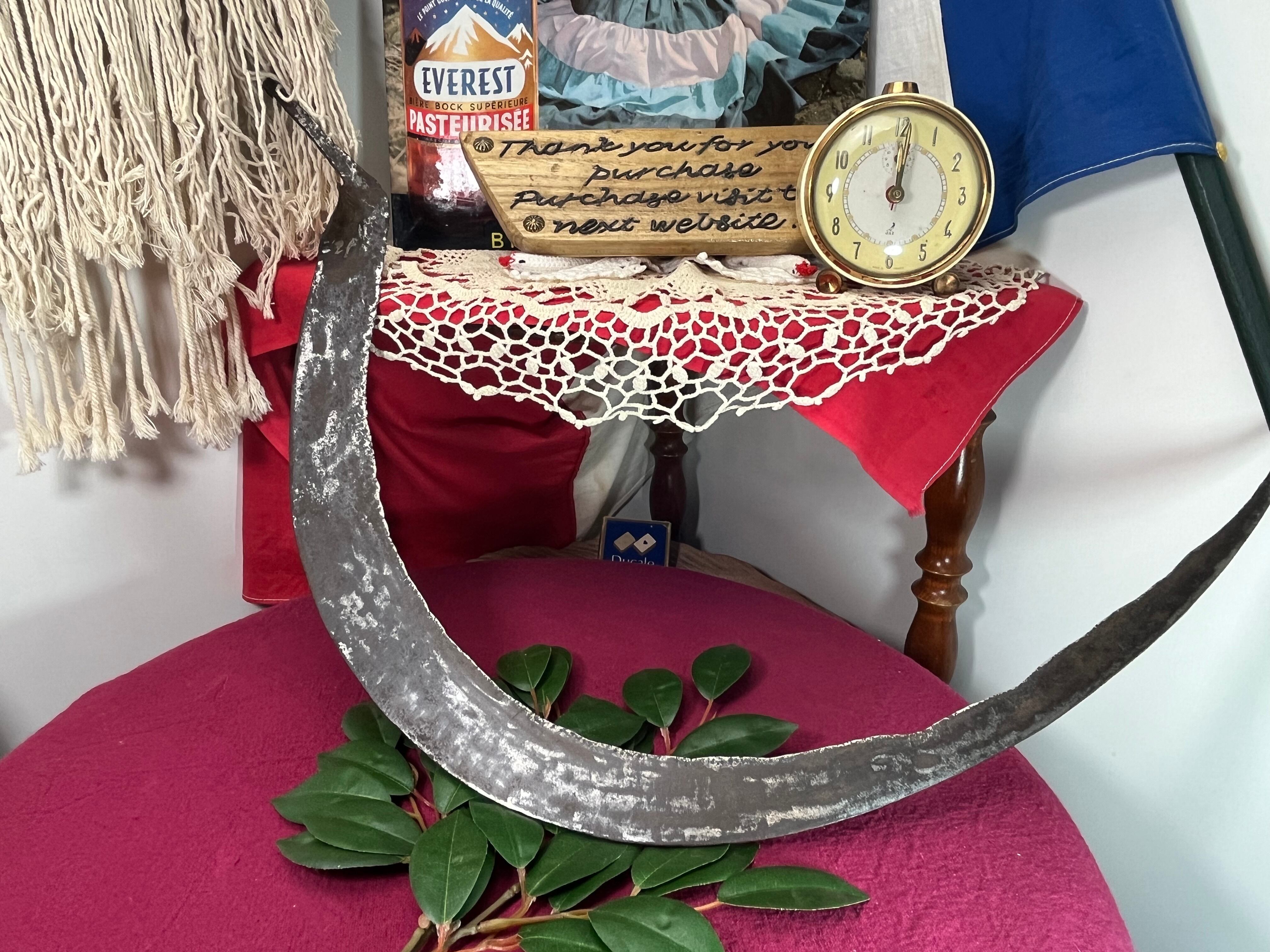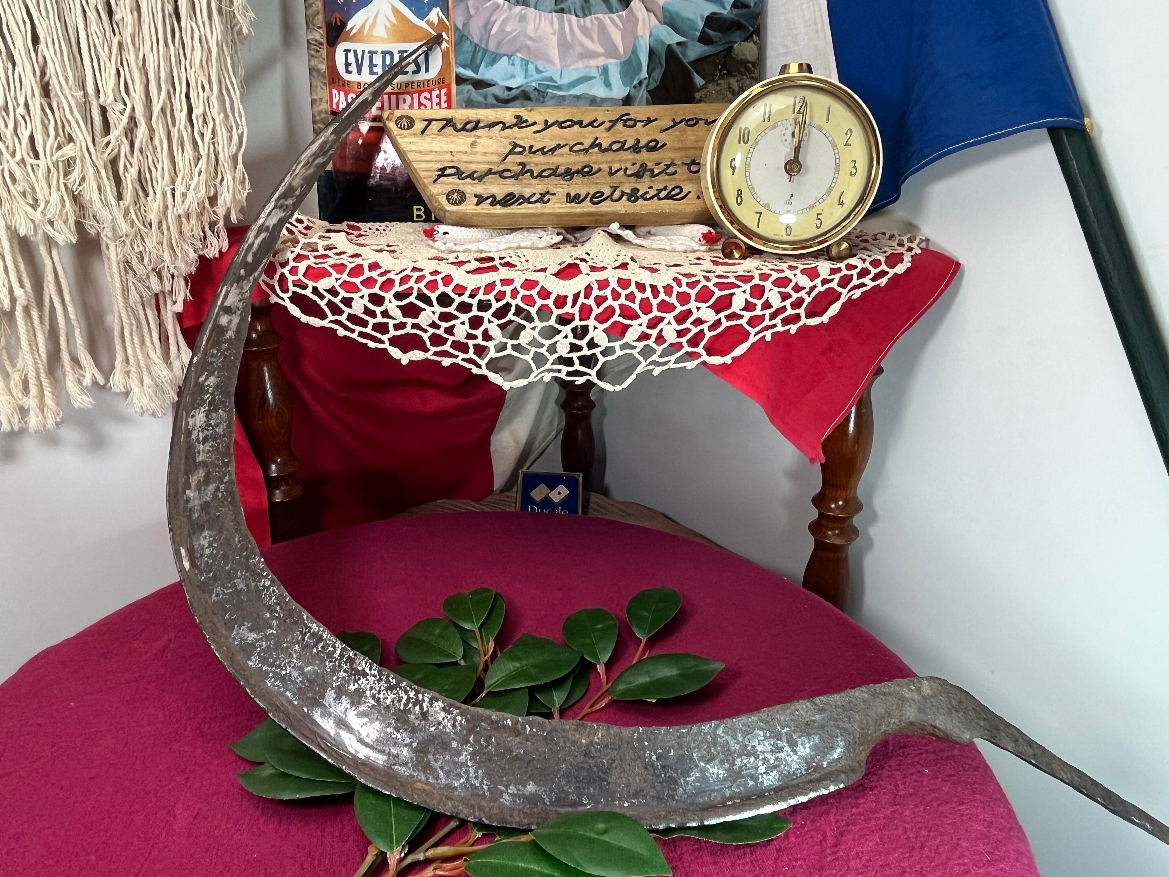 もともとは農地での刈り取りに使われていた実用品ですが、現在ではその存在感のあるシルエットと風合いから、インテリア装飾・店舗什器・ガーデンアートなどで重宝されています。