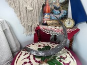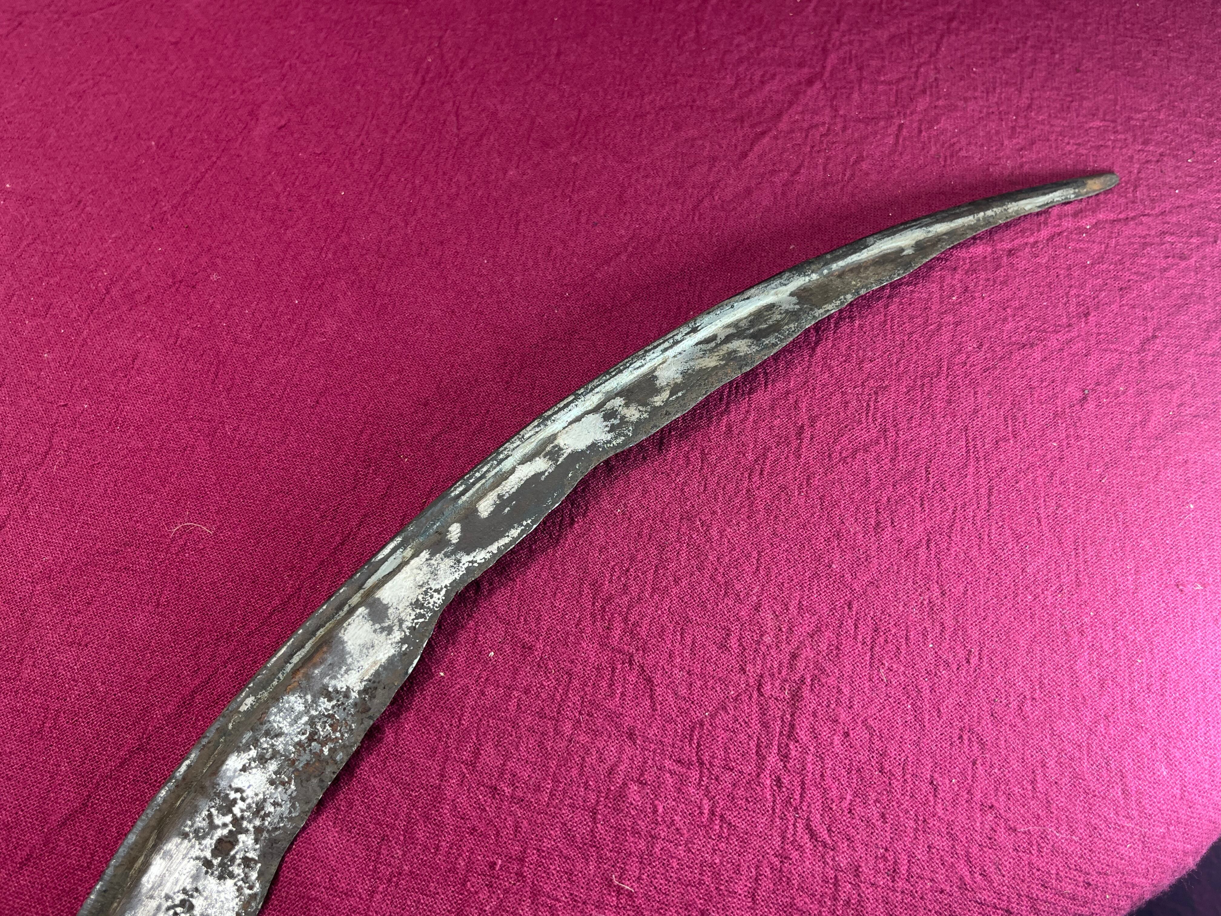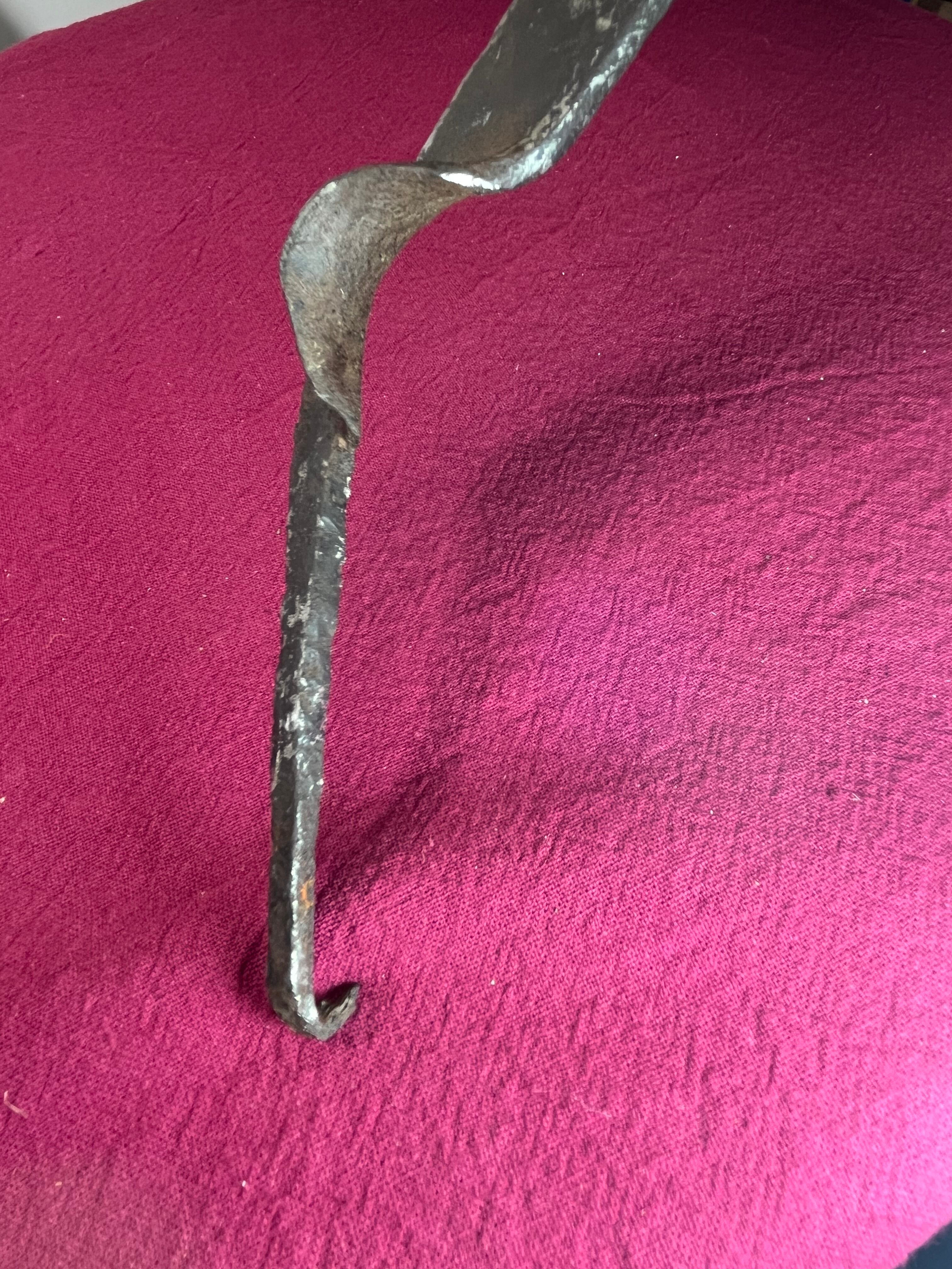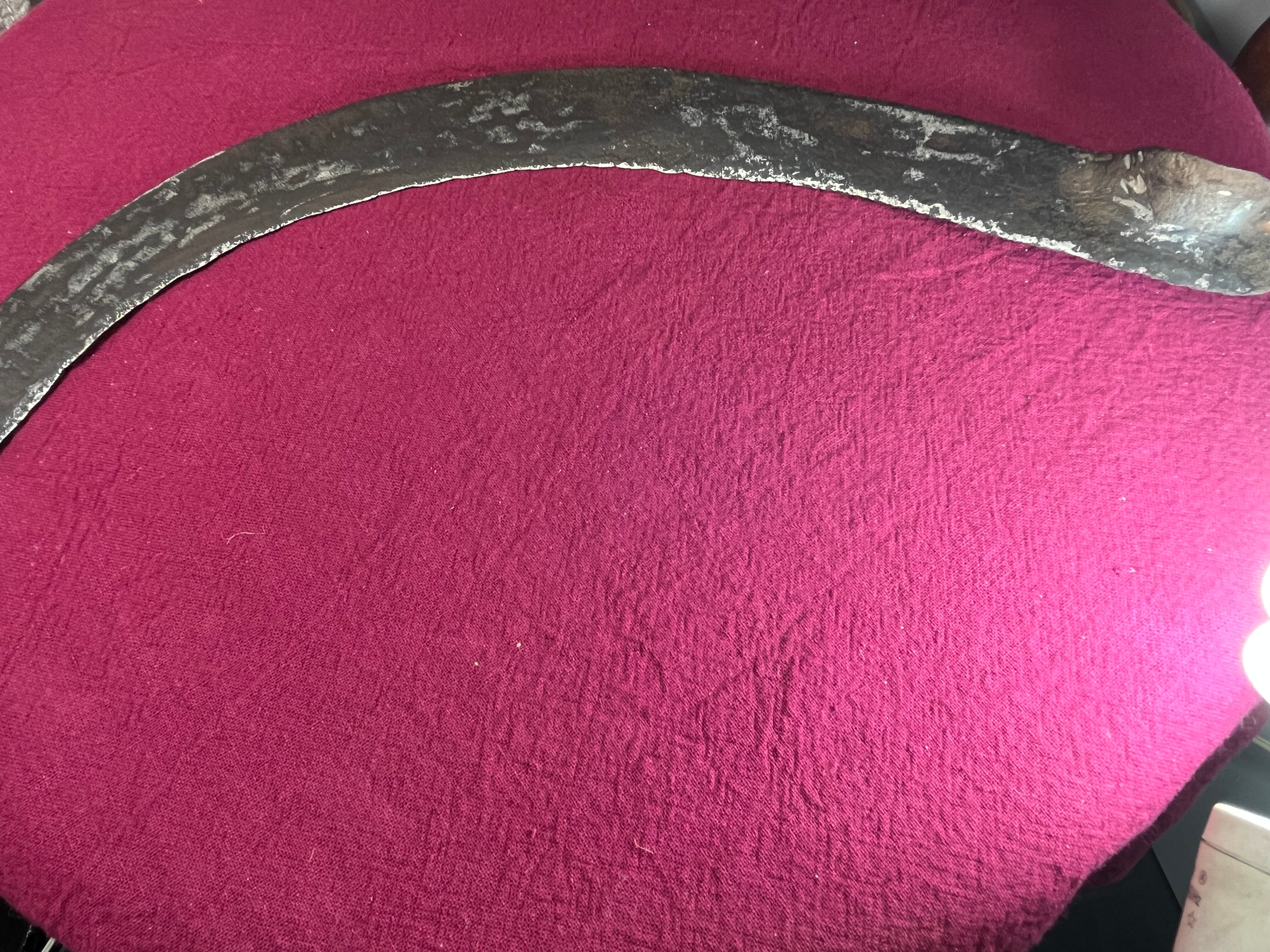 ヨーロッパ伝統の草刈り道具「スカイス(scythe)」の刃部分のみを取り外したヴィンテージ品です。手作業で鍛造された鉄製の湾曲刃は、使い込まれた痕跡とともに、美しい工芸的な風格を備えています。