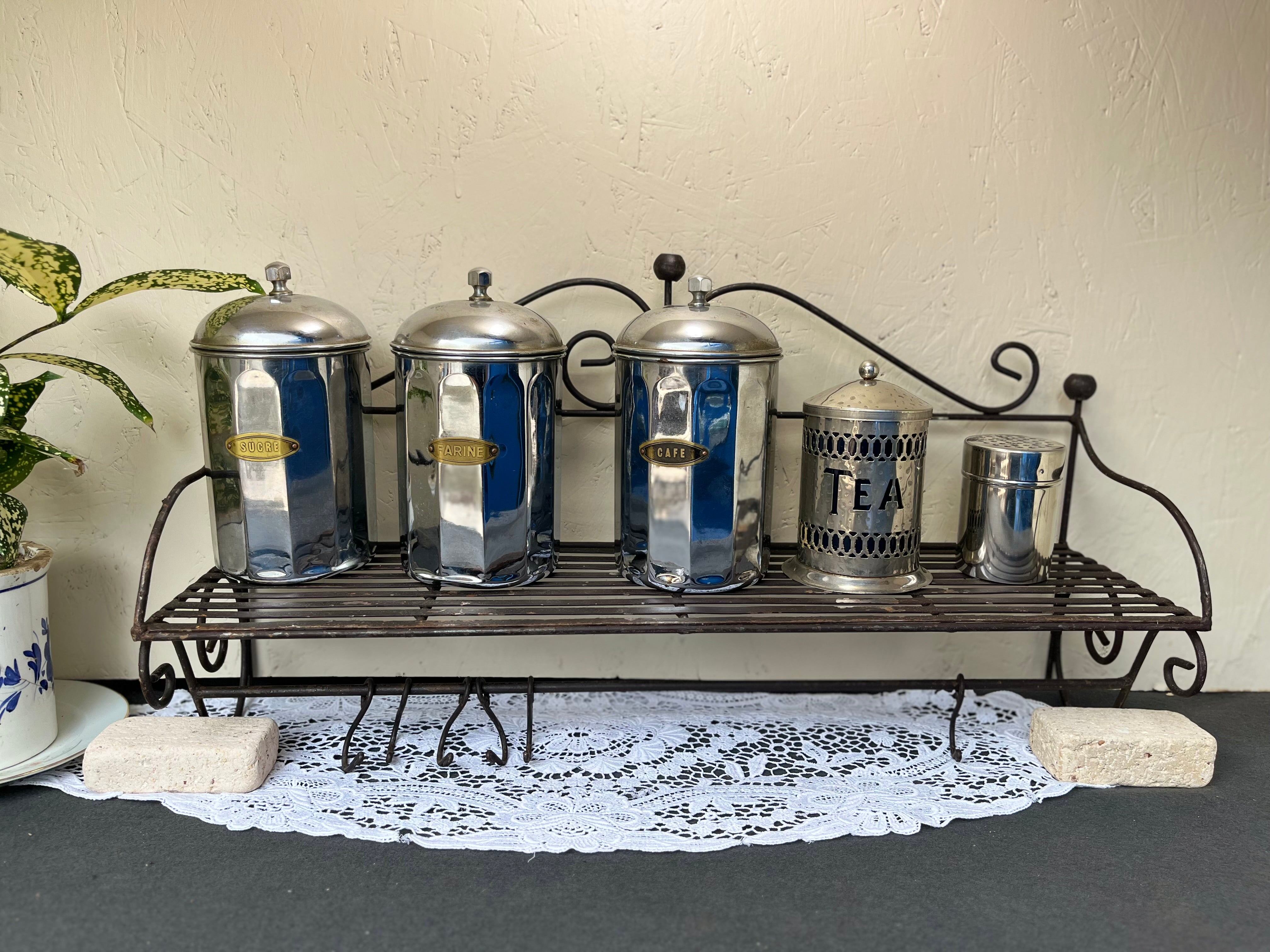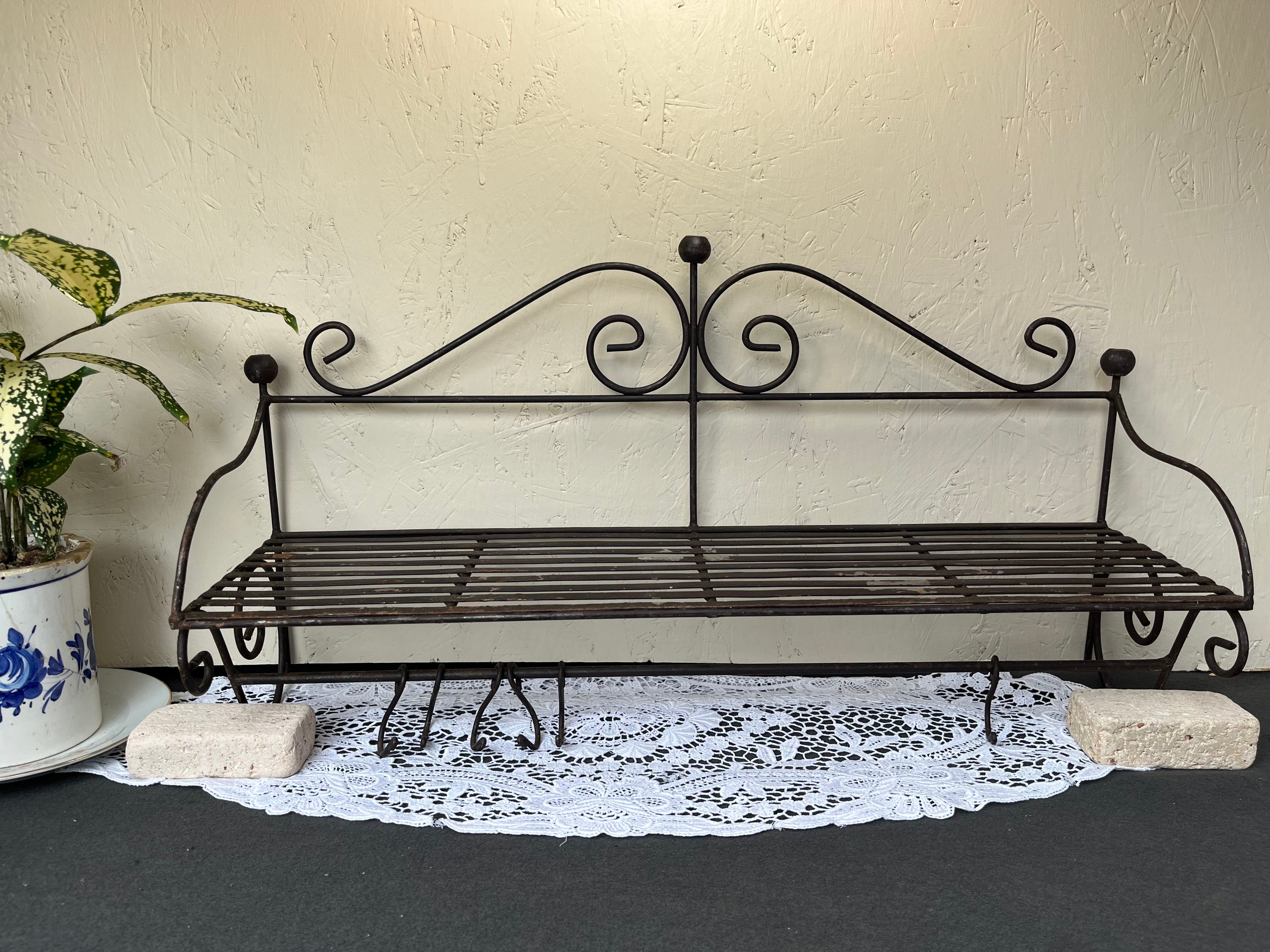 曲線の美しいデザインが印象的な、アイアン製のアンティーク風ウォールラックです。上部の棚部分にはティン缶や小物を並べたり、下部のフックにはカップやキッチンツール、ガーデンツールなどを掛けることができます。