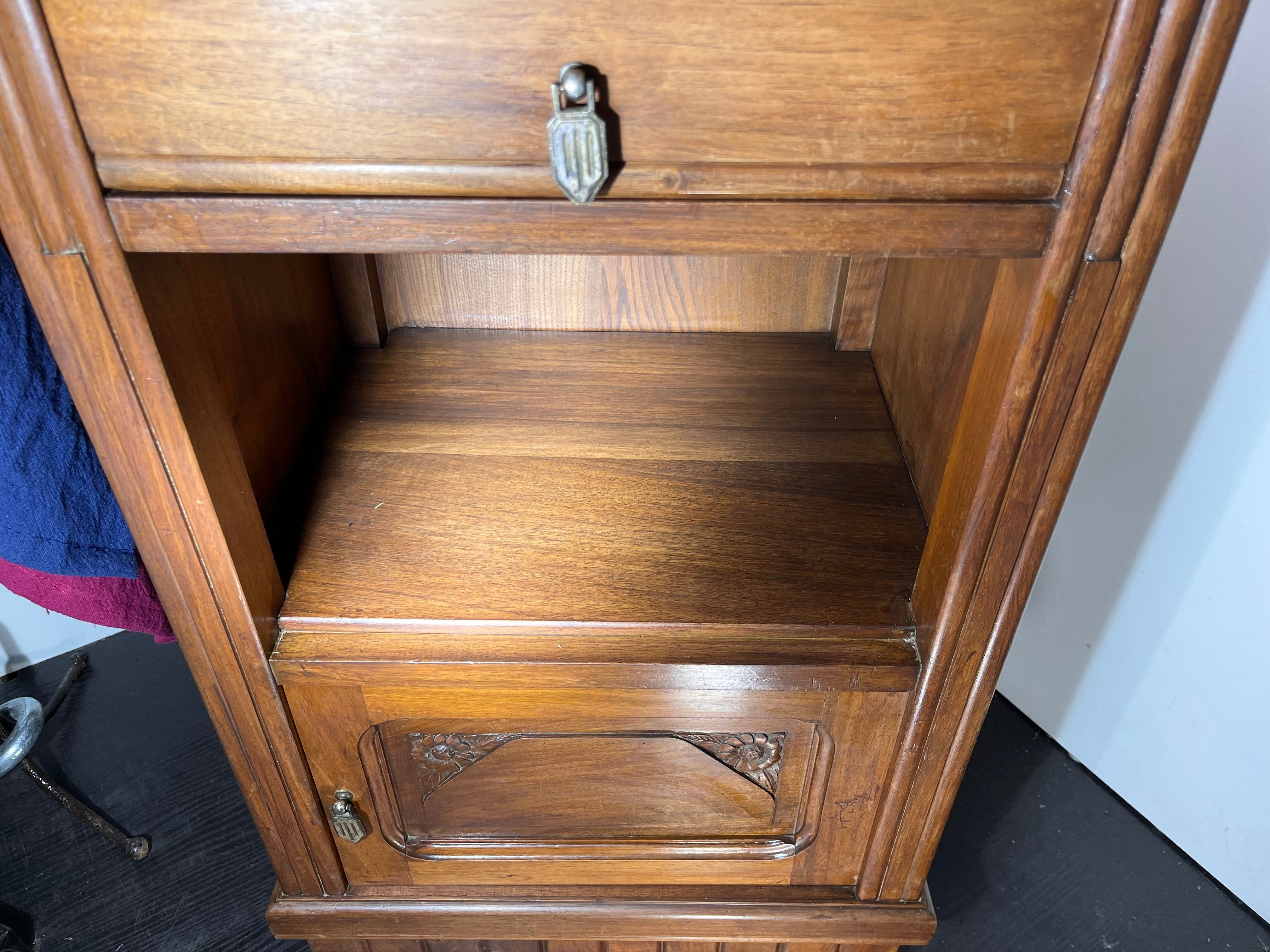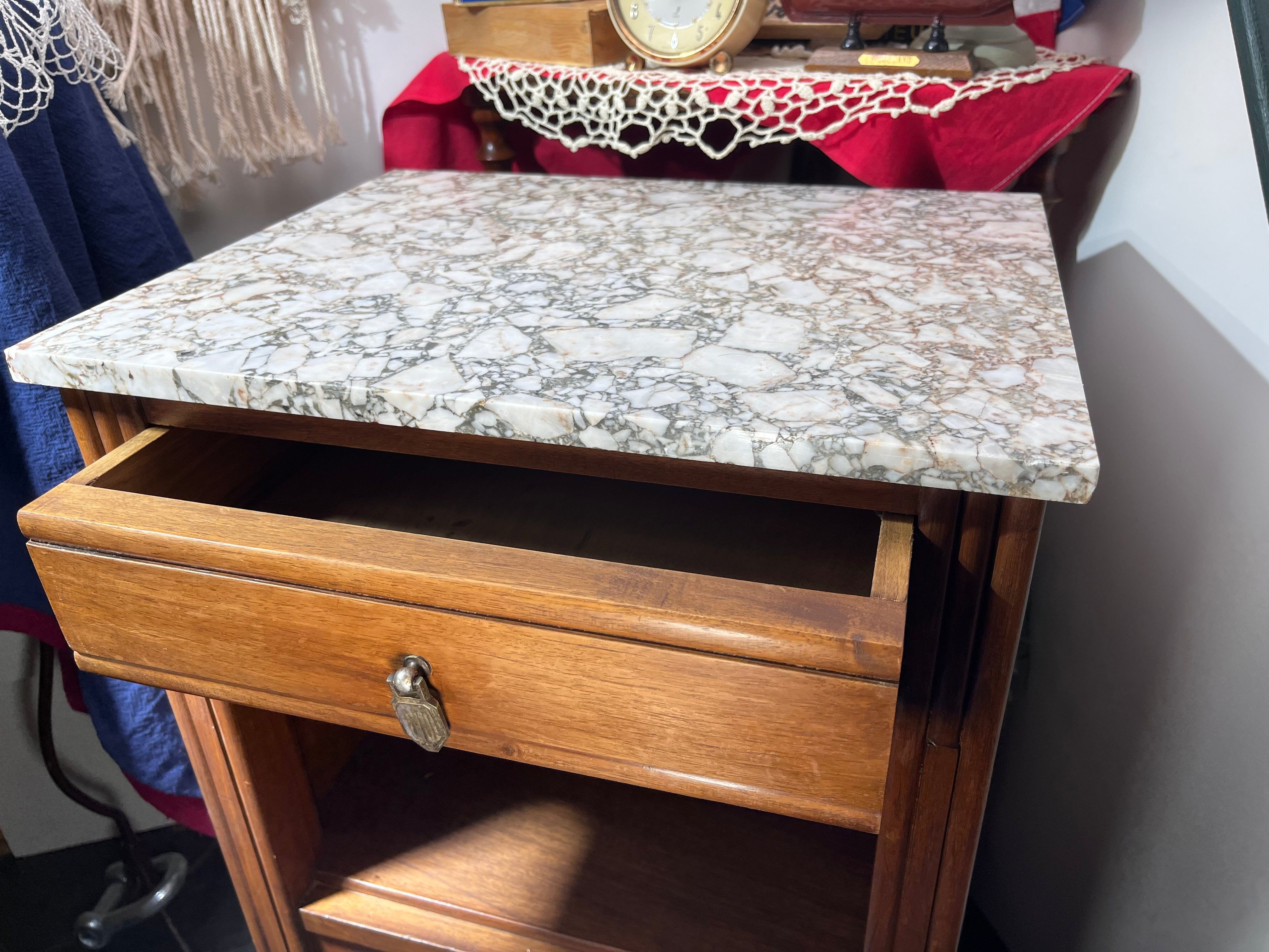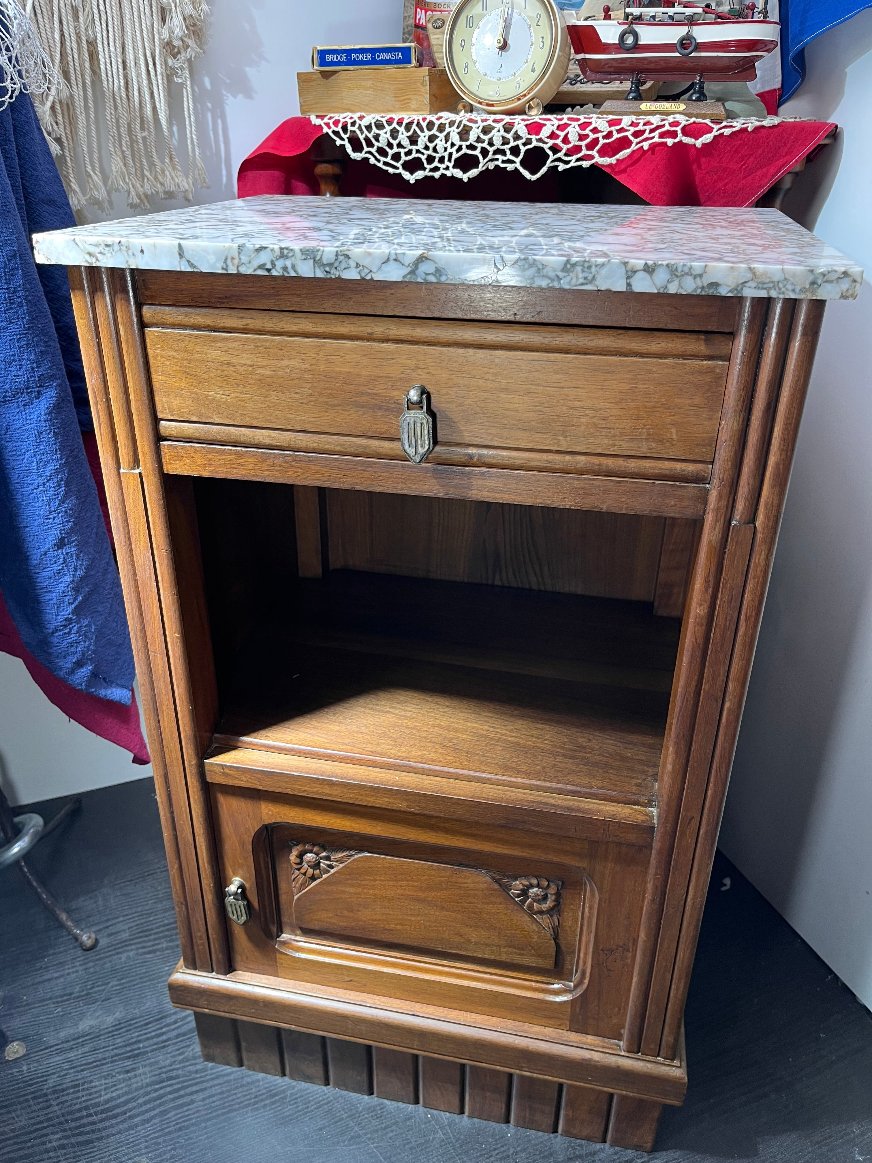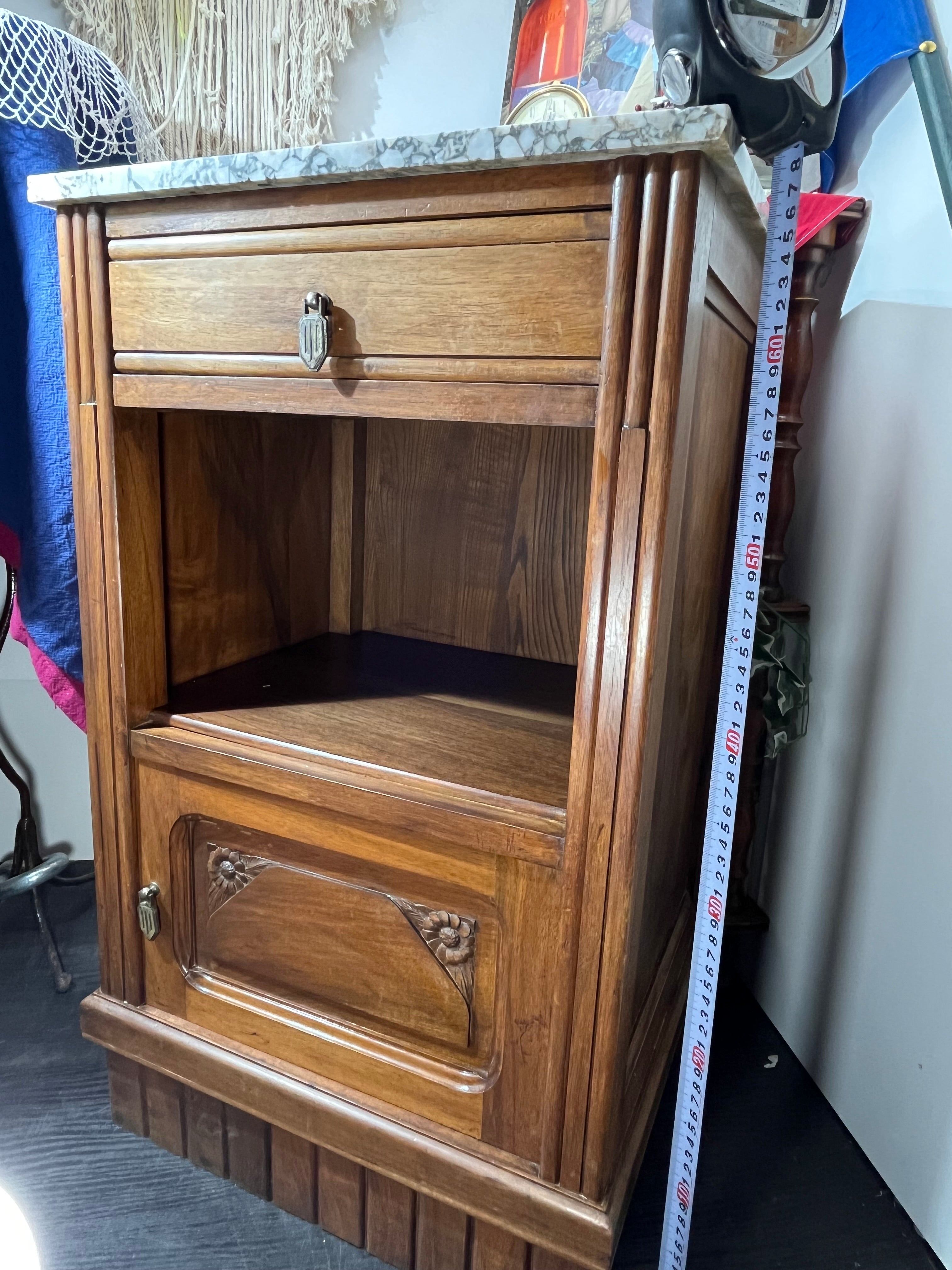 エレガントな大理石天板と、精巧な木彫装飾が魅力のヴィンテージサイドチェスト。無垢材の温もりと、クラシカルな金具・鍵付き扉が上品な雰囲気を演出します。リビングや寝室、玄関などあらゆるシーンに映えるデザインで、収納力も抜群。アンティーク好きやクラシックインテリアを愛する方にぜひ手に取っていただきたい逸品です。