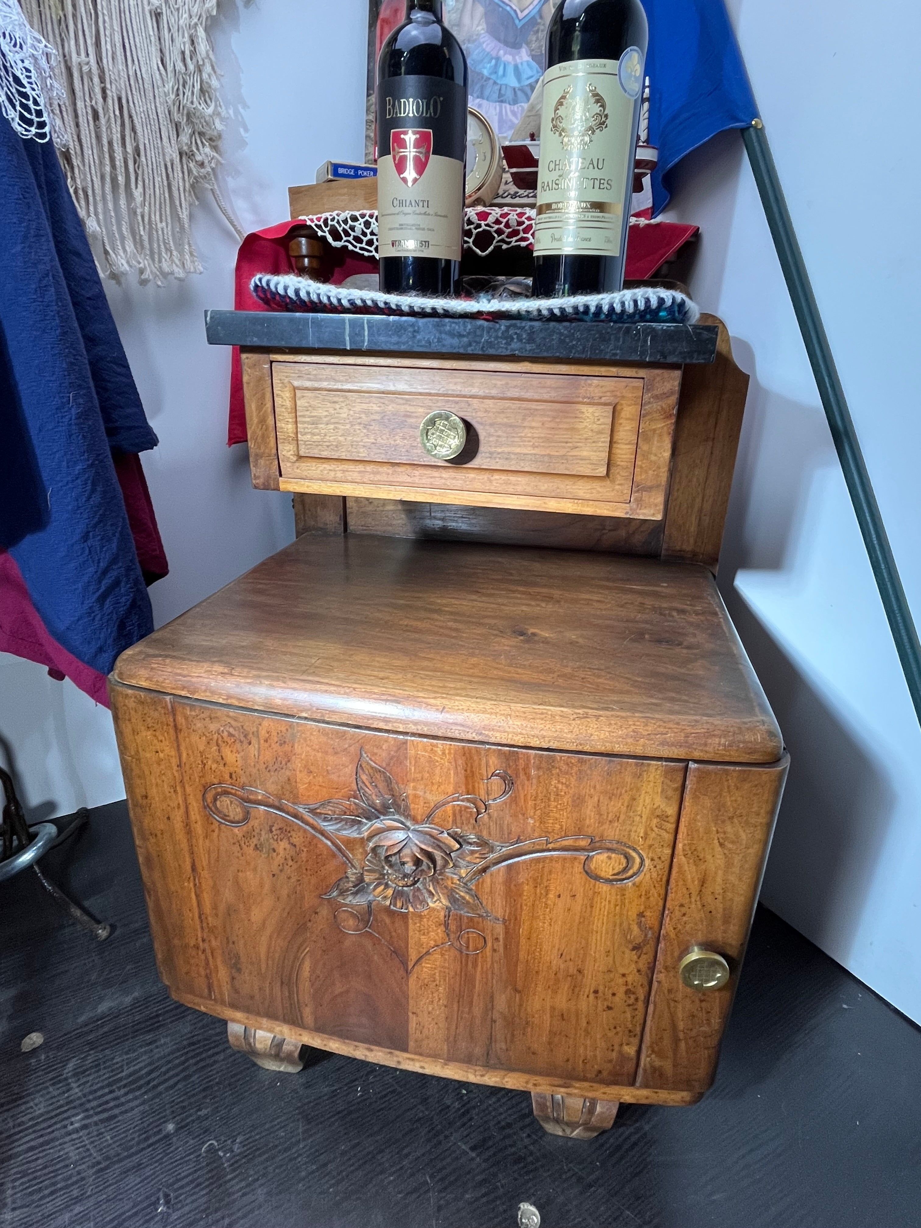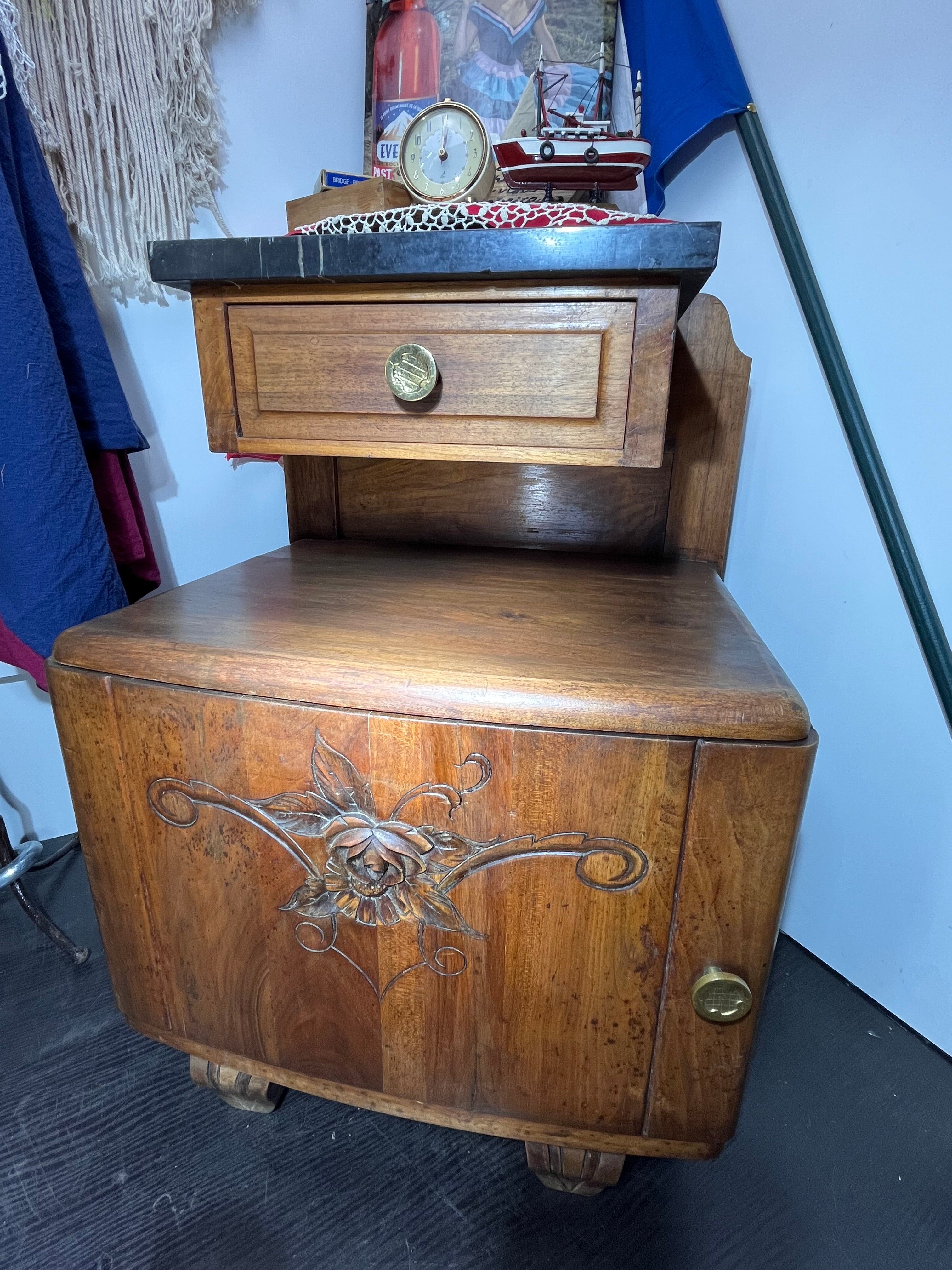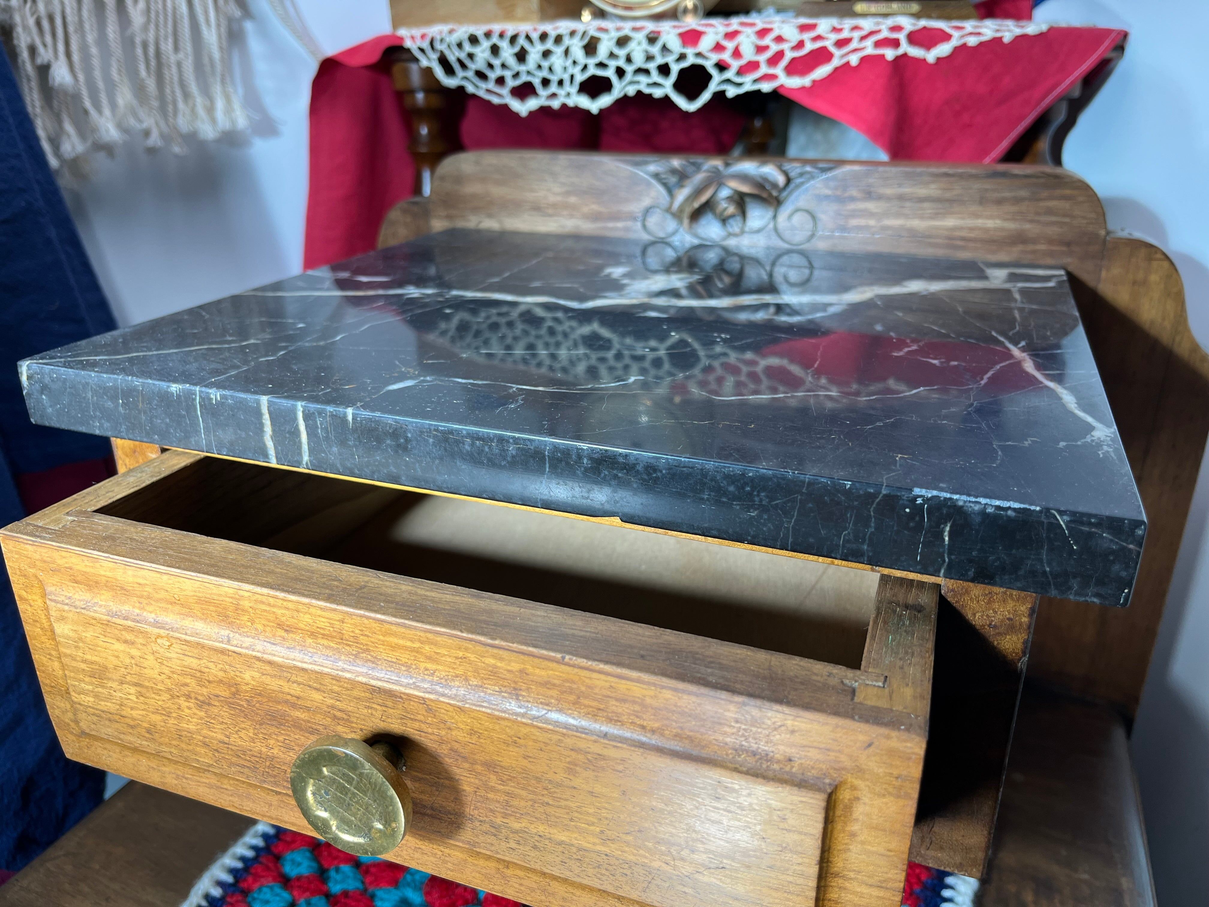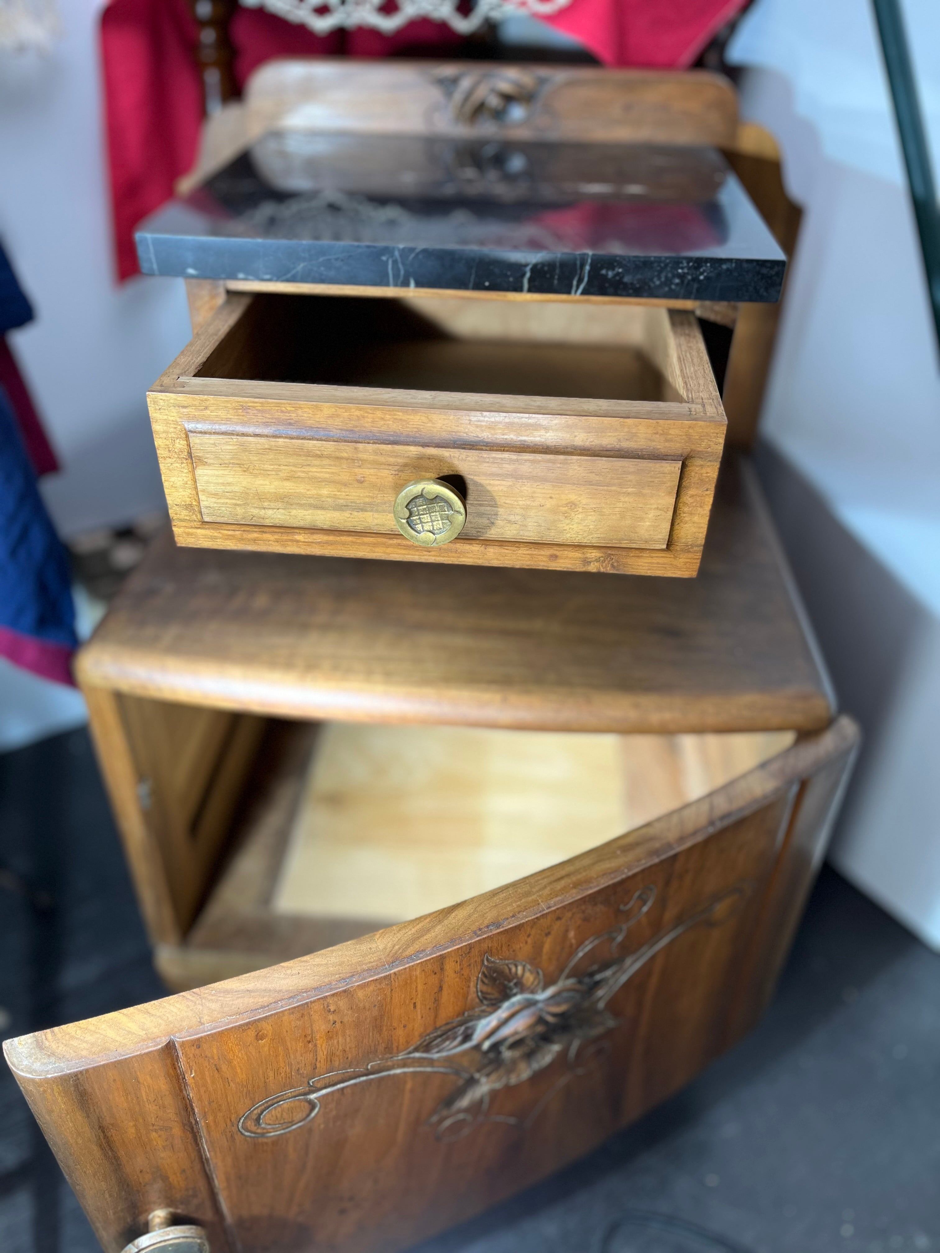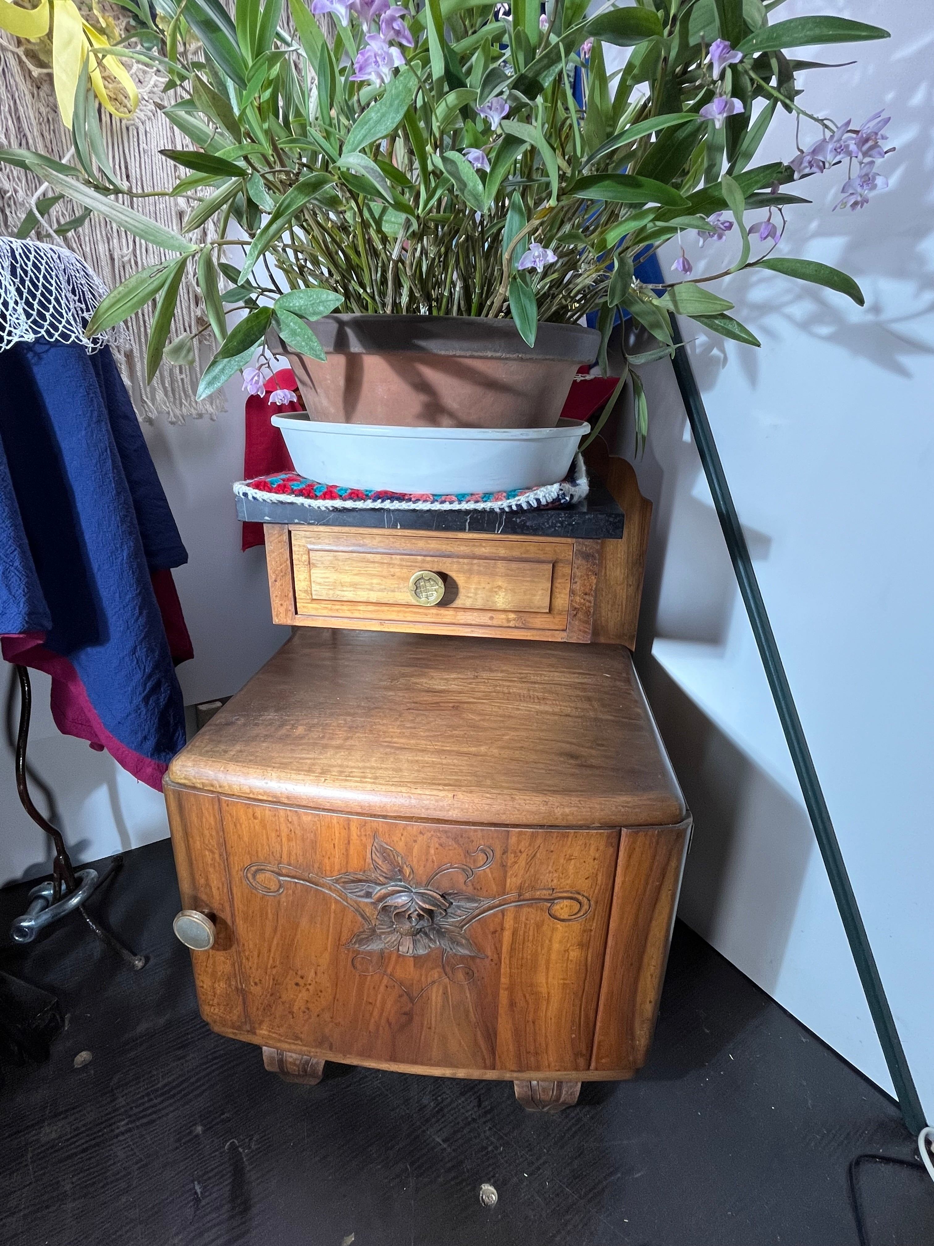 高級感あふれる天然木と、クラシカルな黒大理石天板を組み合わせたアンティークサイドチェストです。扉面には美しい花の彫刻が施され、職人の丁寧な手仕事が光ります。引き出しと収納スペースがあるため、実用性と装飾性を兼ね備えています。