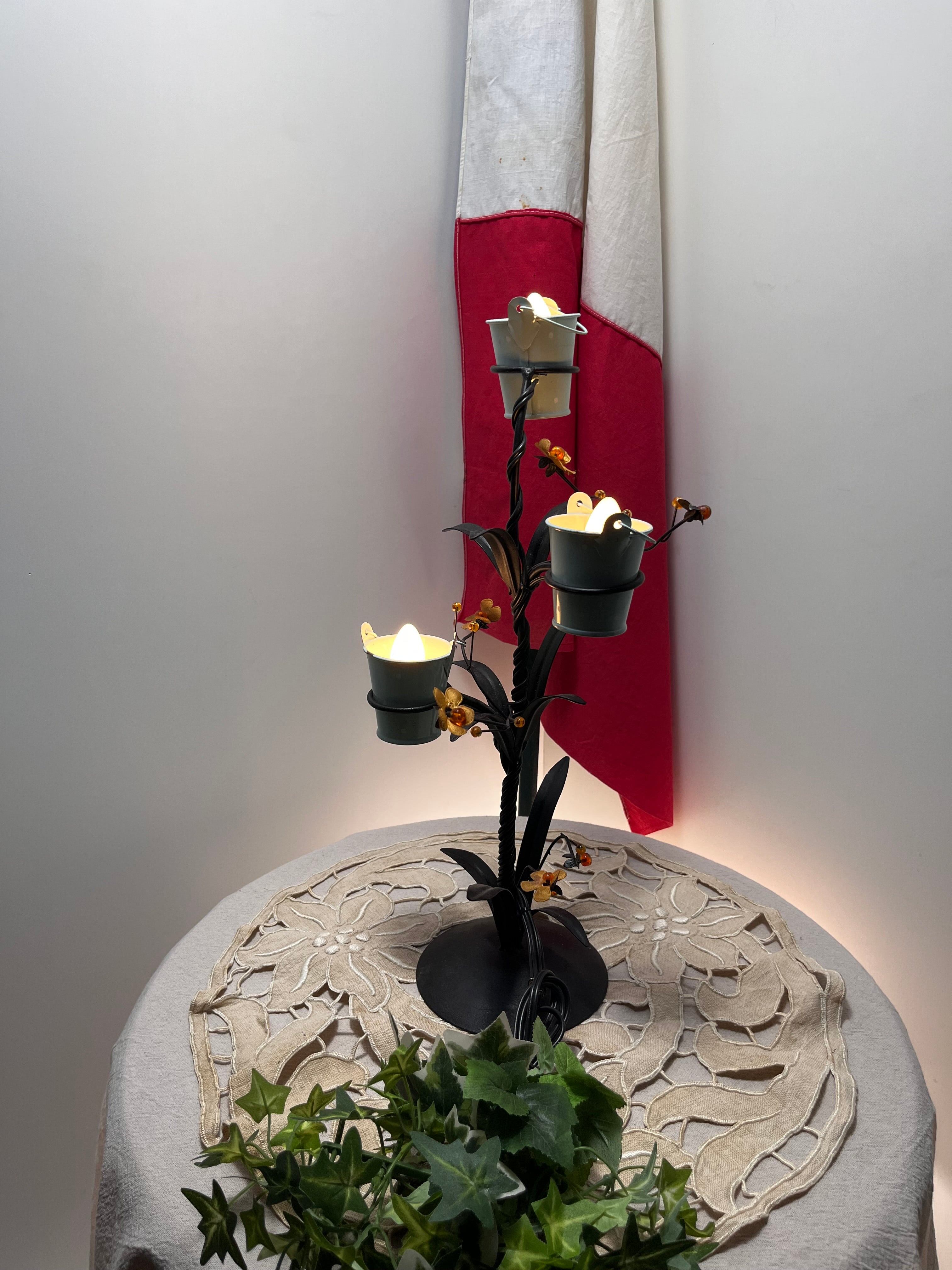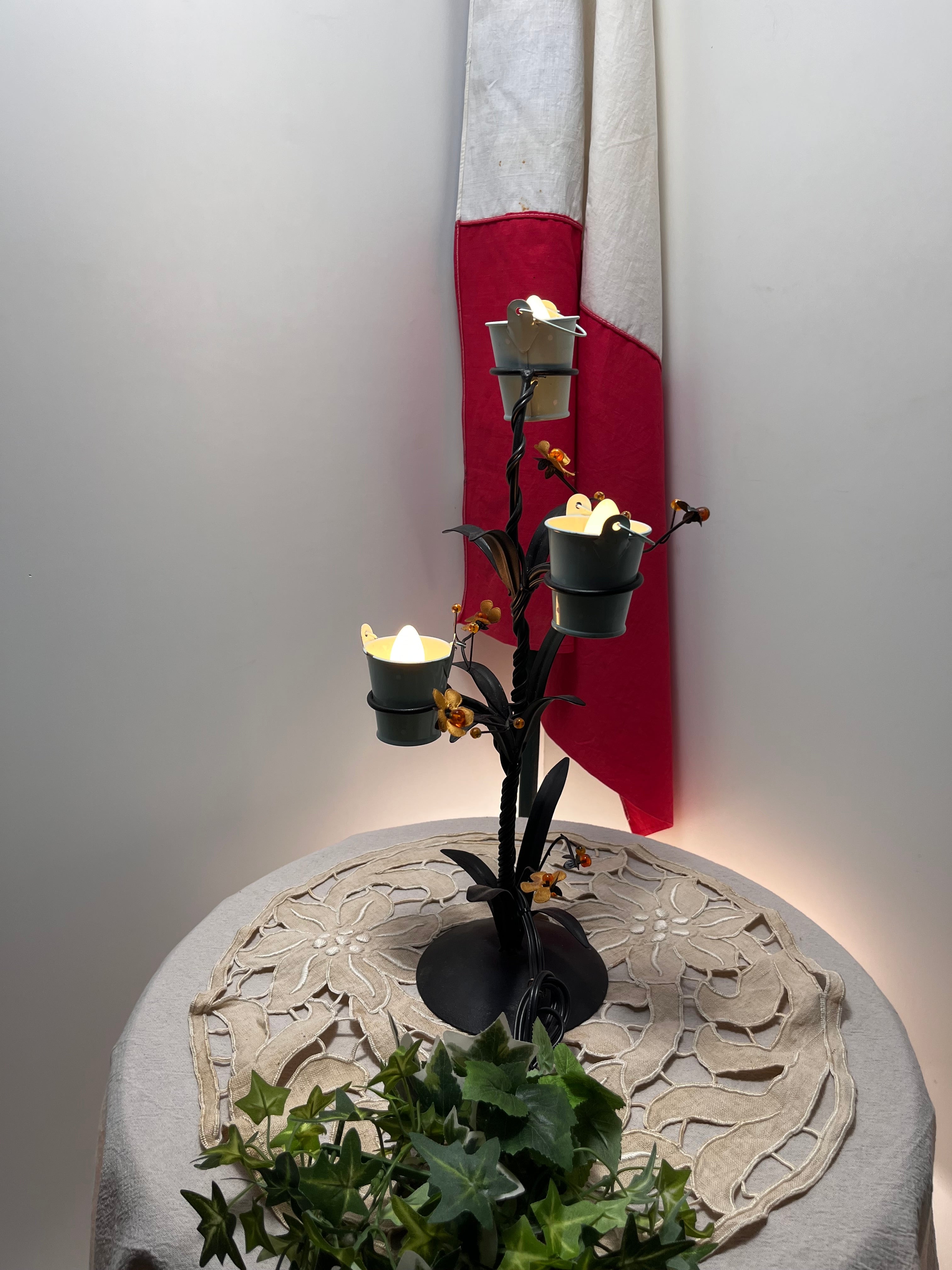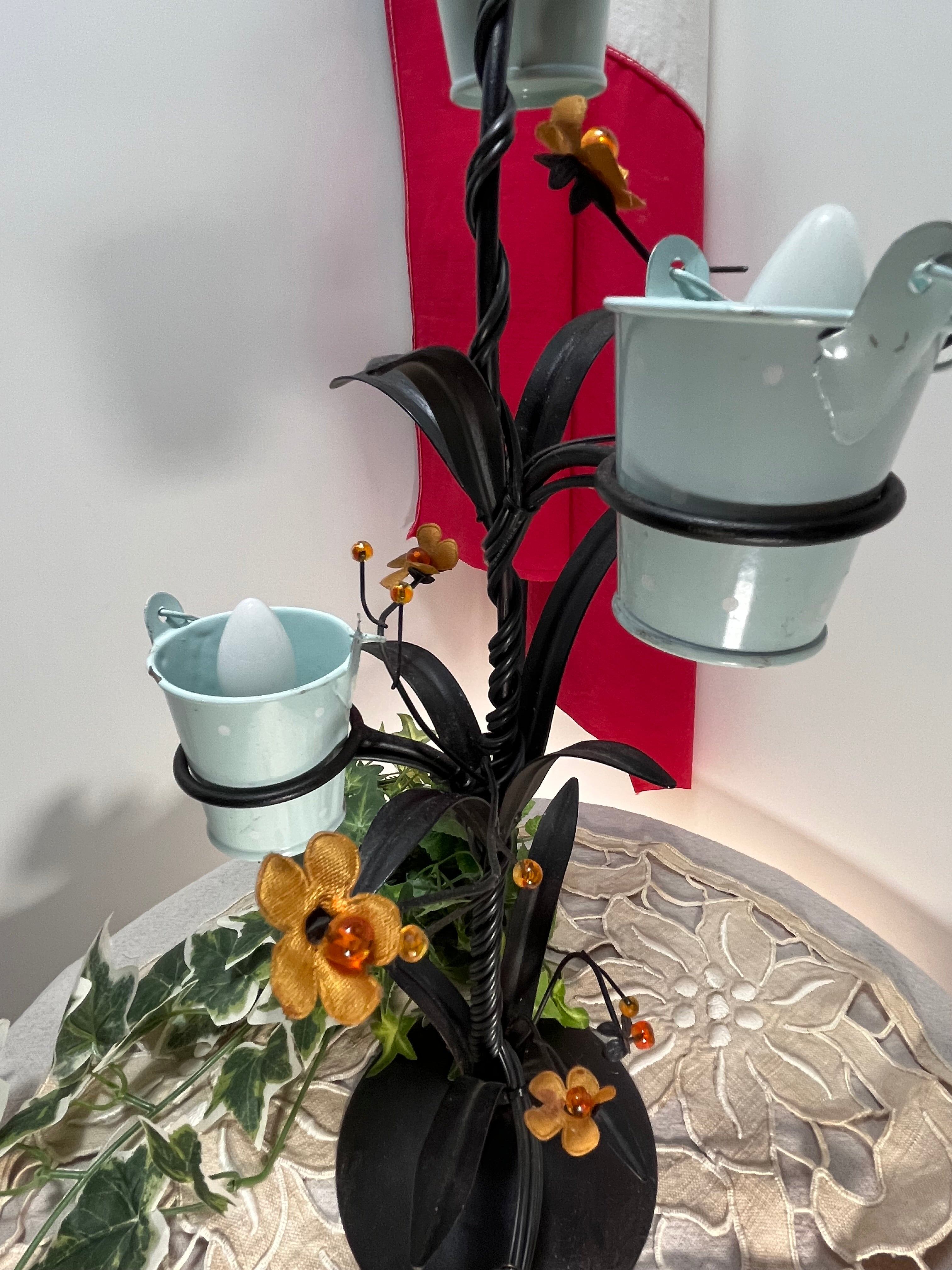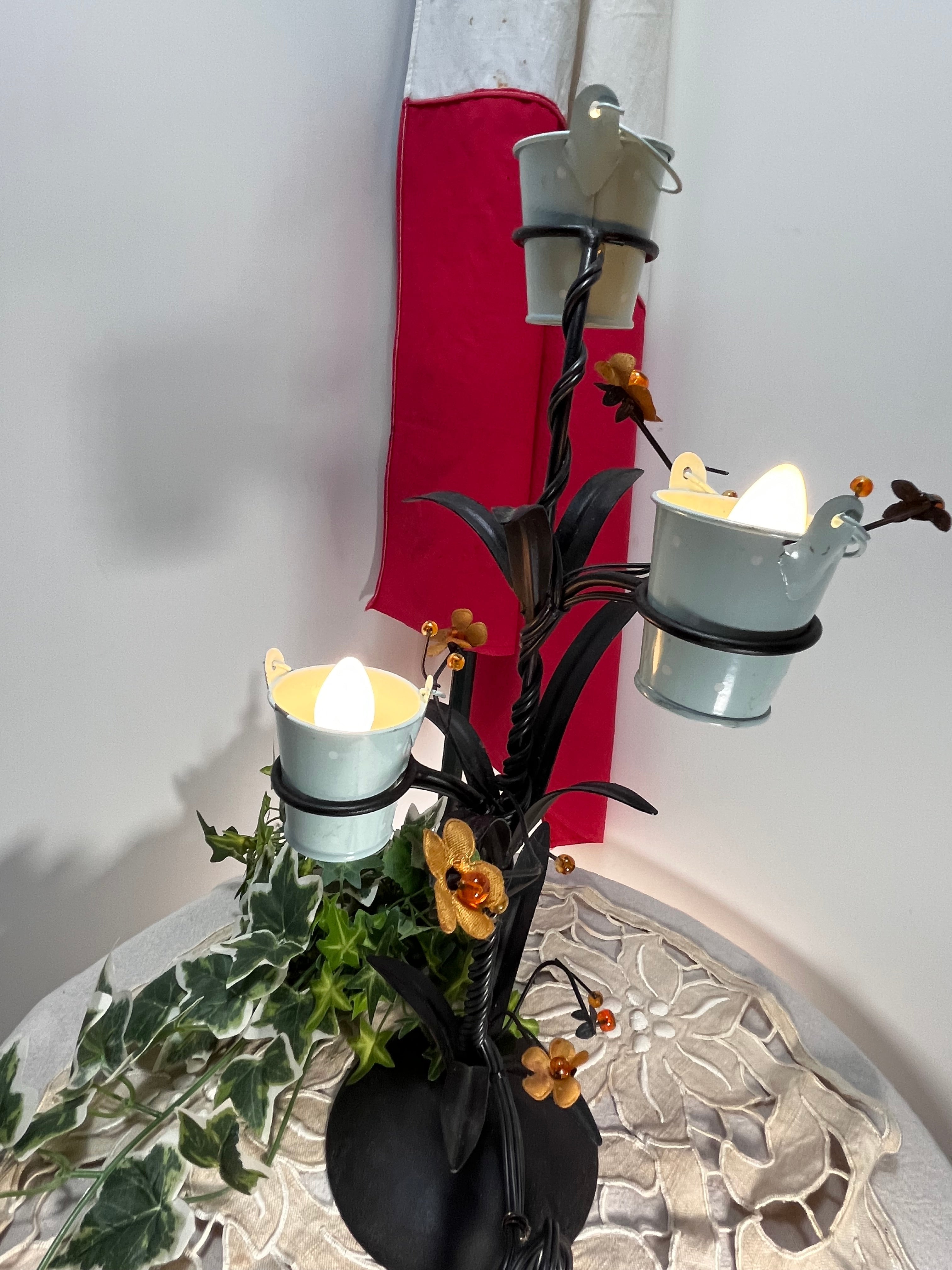 枝や葉、さらにオレンジ色の花飾りやビーズ装飾が添えられており、まるで小さな室内ガーデンのような雰囲気に。LEDキャンドル風電球との相性も抜群で、柔らかく温もりのある灯りが空間に広がります。