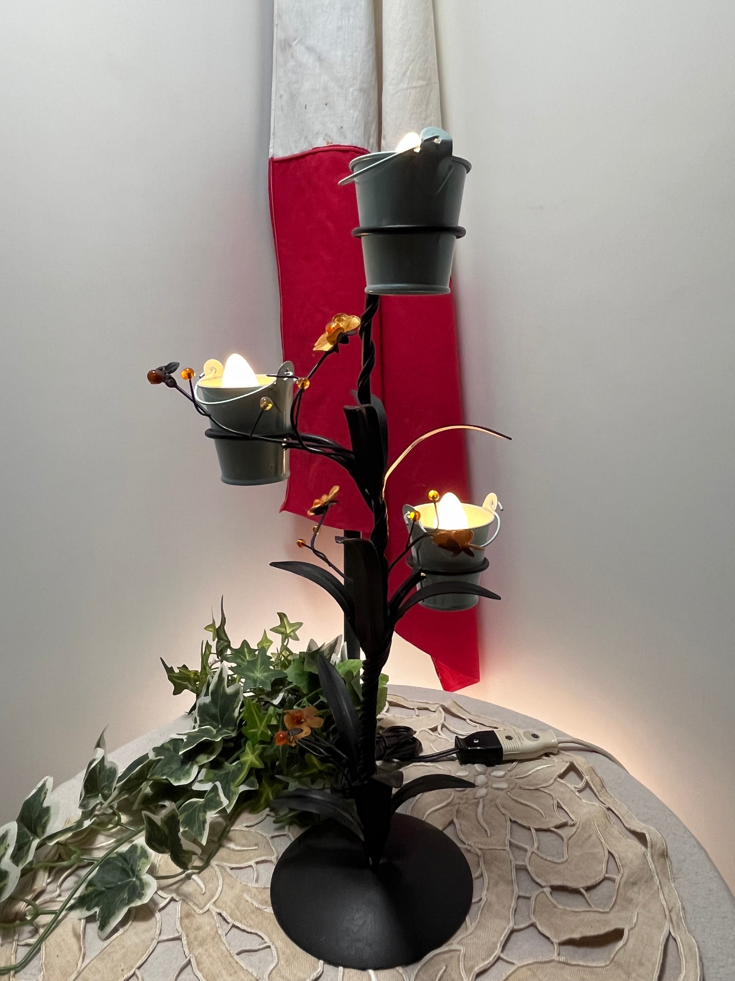 花が灯る、癒しの空間演出こちらは、アイアンフレームを植物の茎に見立て、3つの小さなフラワーポット型シェードに電球を収めたナチュラルデザインのスタンドライトです。