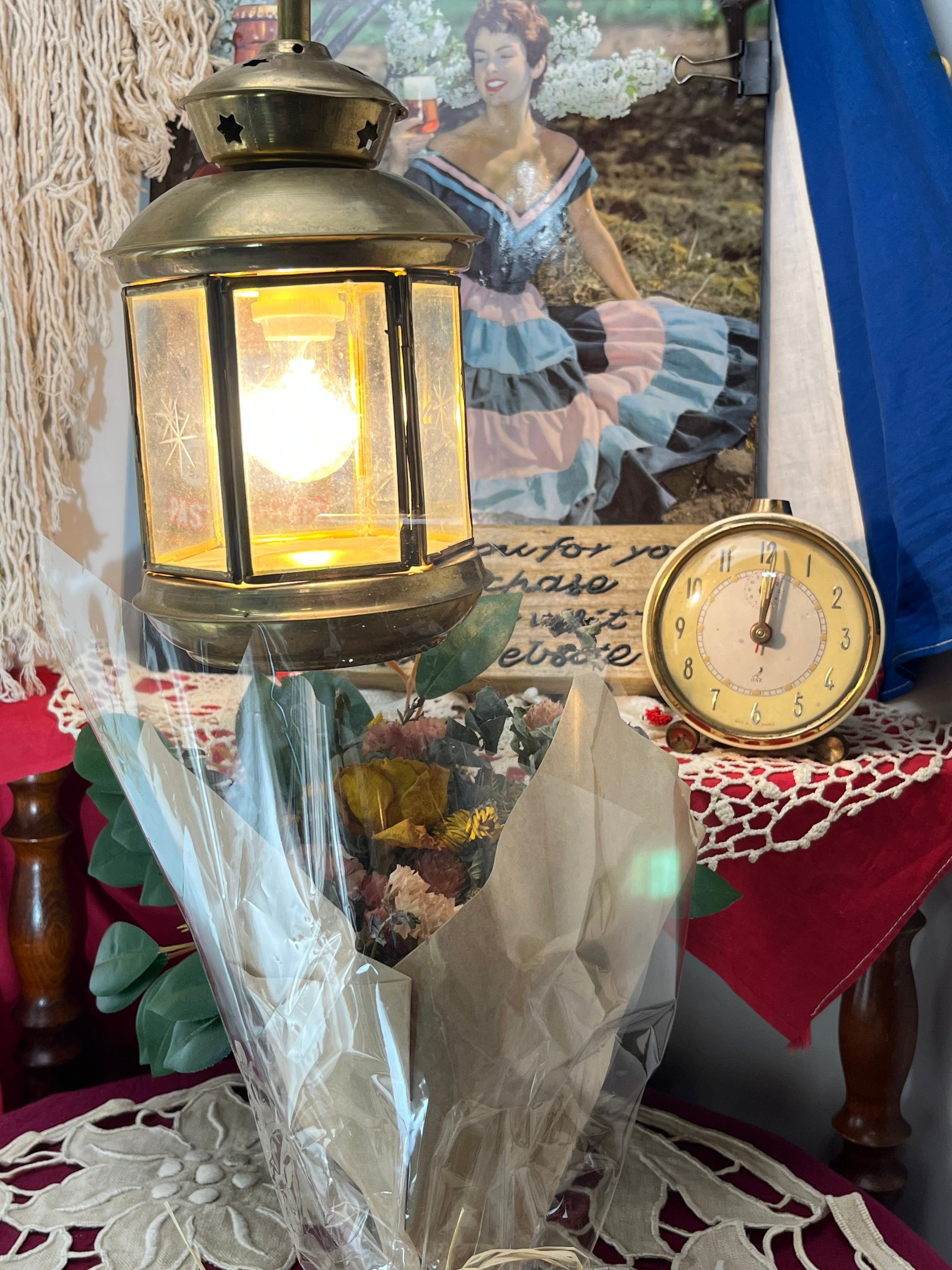 味わい深いブラス(真鍮風)仕上げのアンティークランタンです。星模様のエッチングガラスが美しく、温かみのある光を演出します。