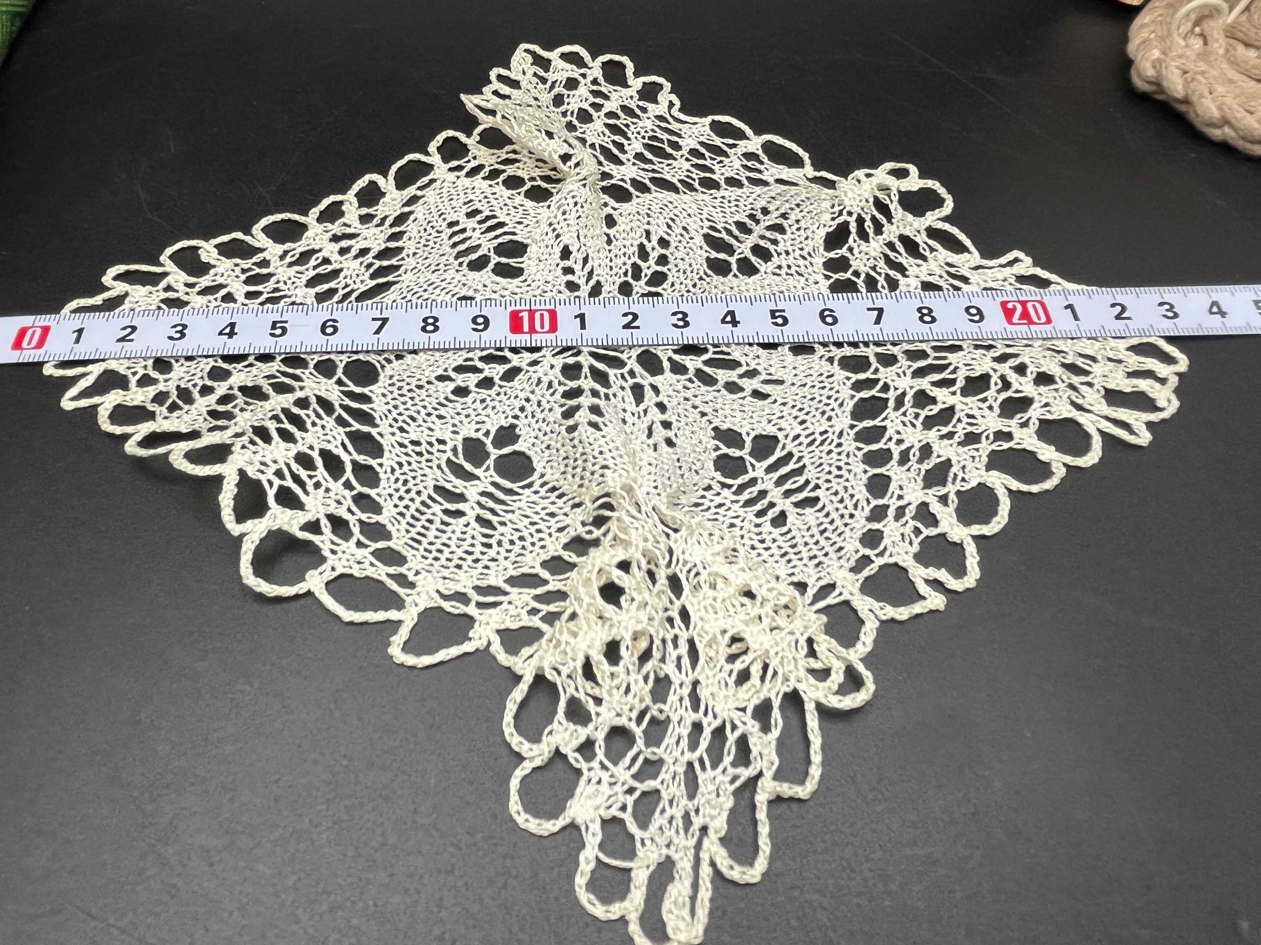 軽やかな透かし編みが特徴で、アクセサリーや雑貨の下に敷くと雰囲気が一気にアンティーク調に。角の形が独特で可愛い一枚。