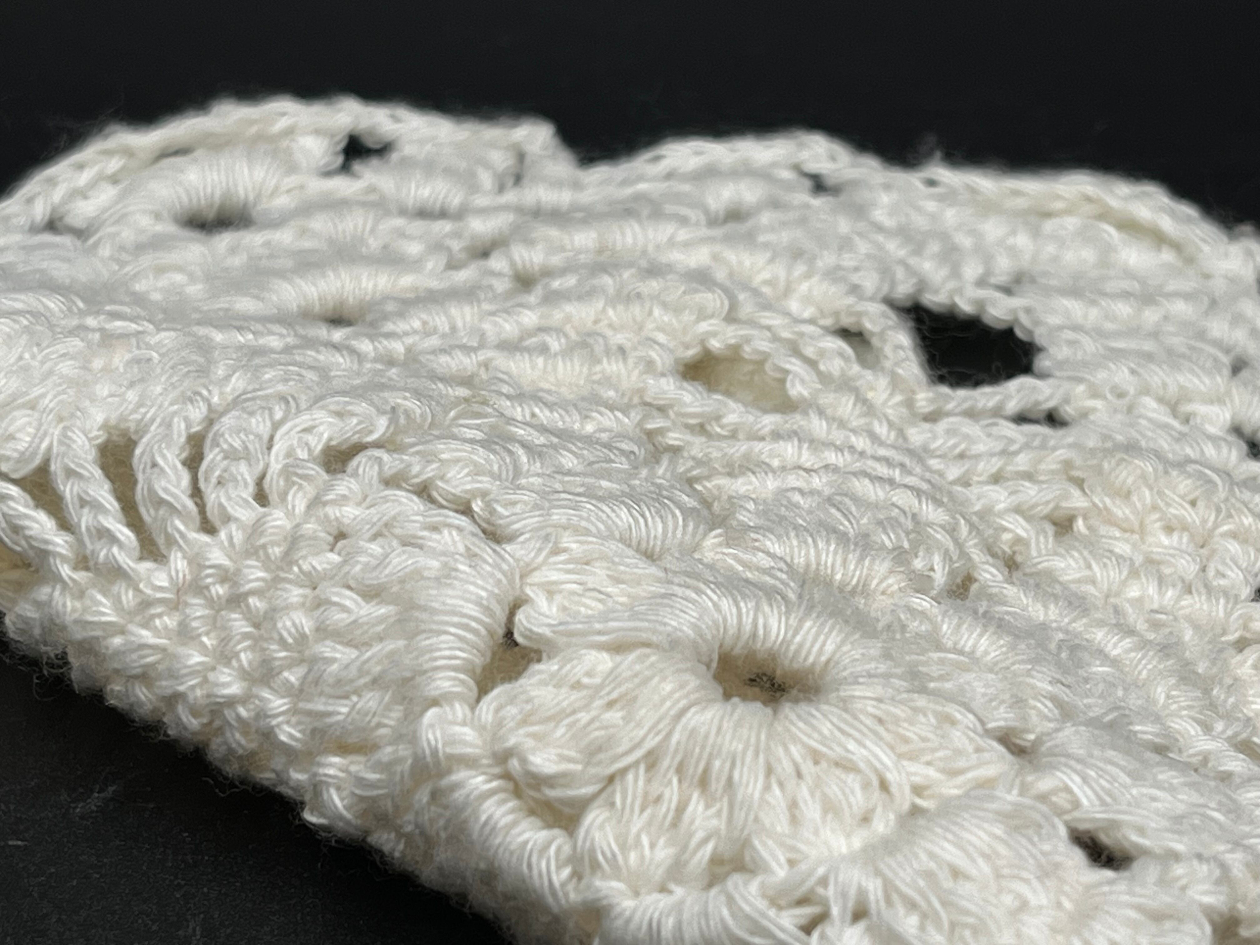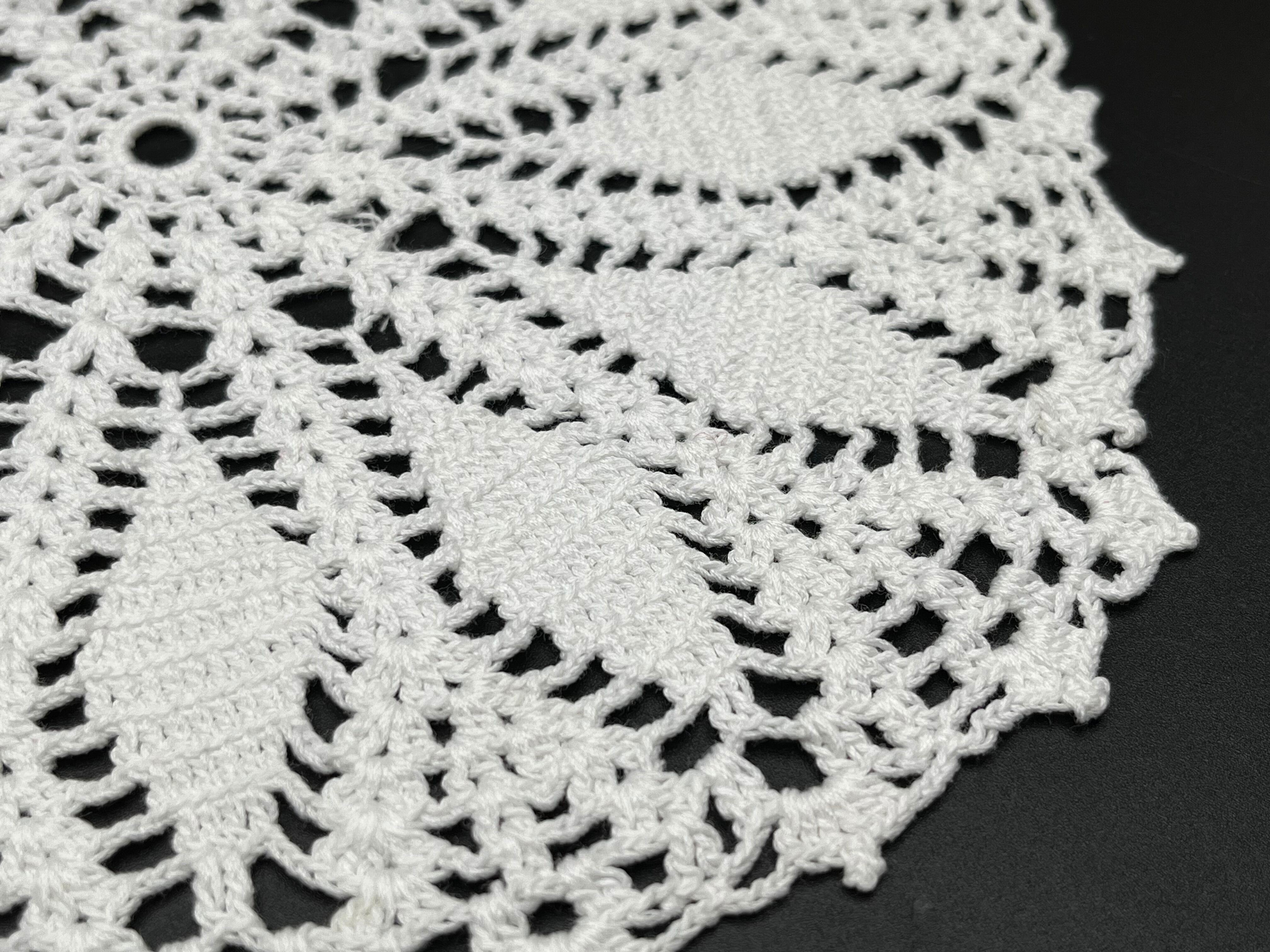 細編み×透かしの花びら模様が広がるクラシックな一枚。