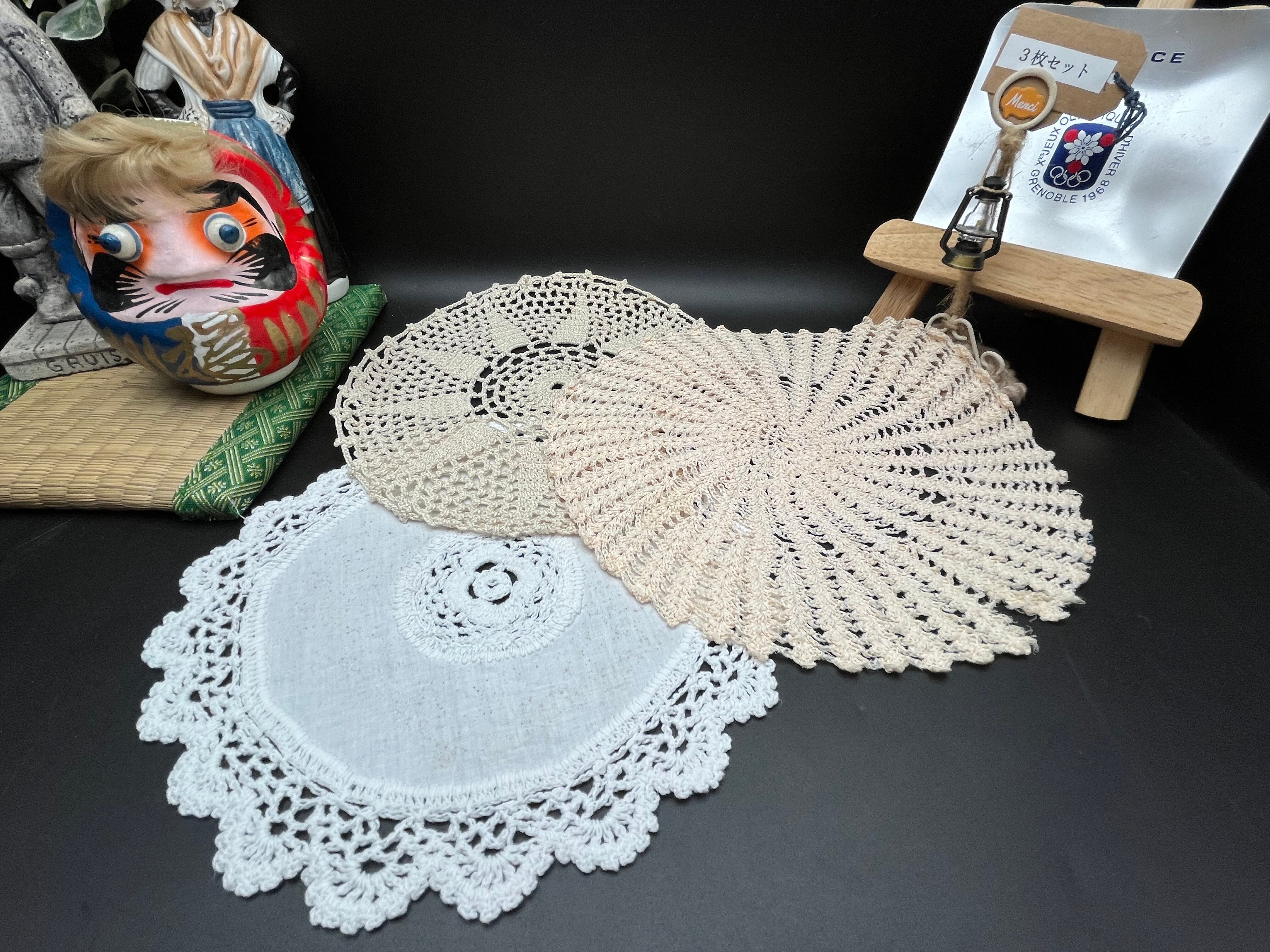 アンティークならではの雰囲気が素敵な手編みレースドイリー3枚セットです。