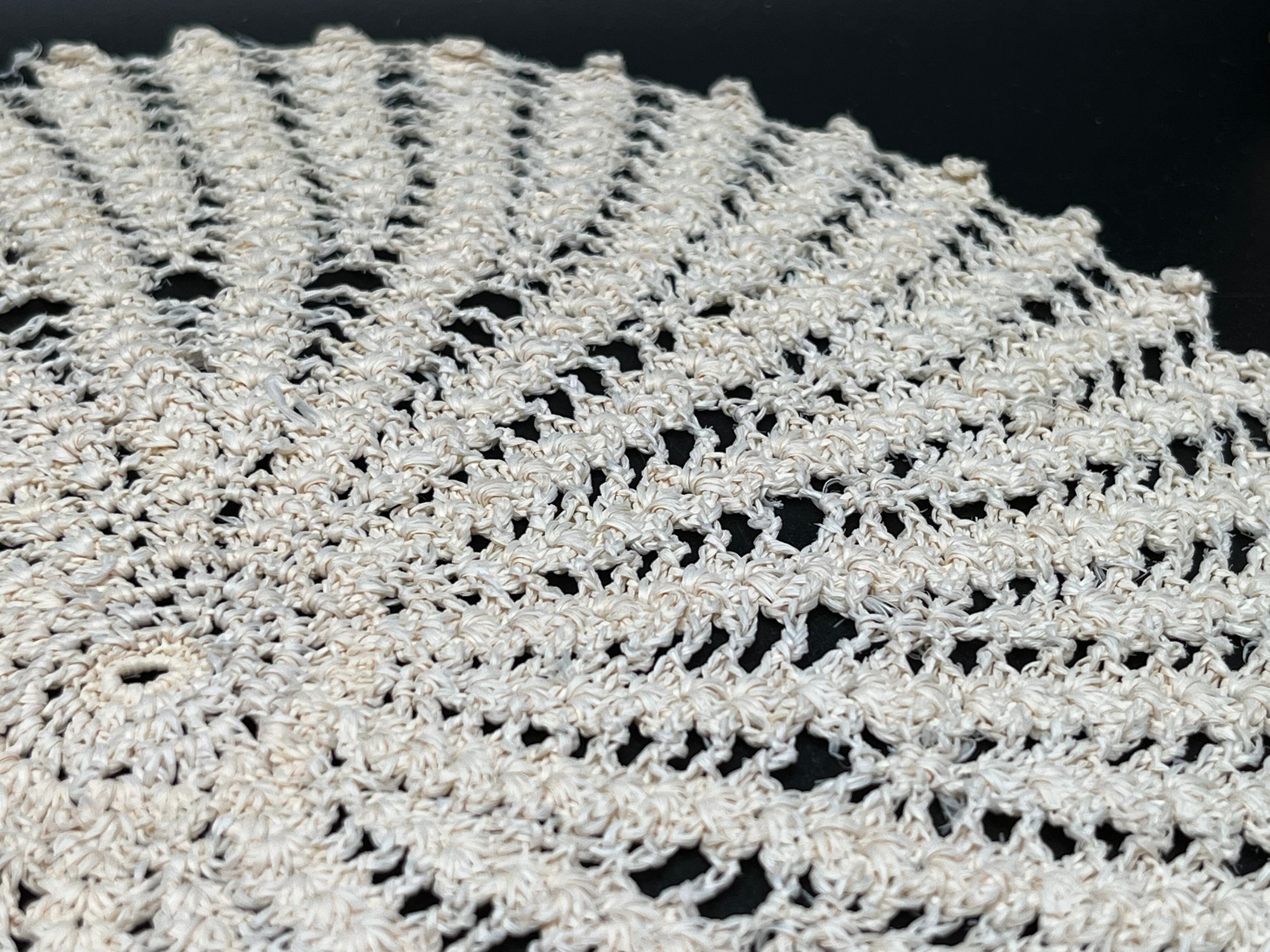 細かい編み模様が中心から放射状に広がる、存在感たっぷりの一枚。